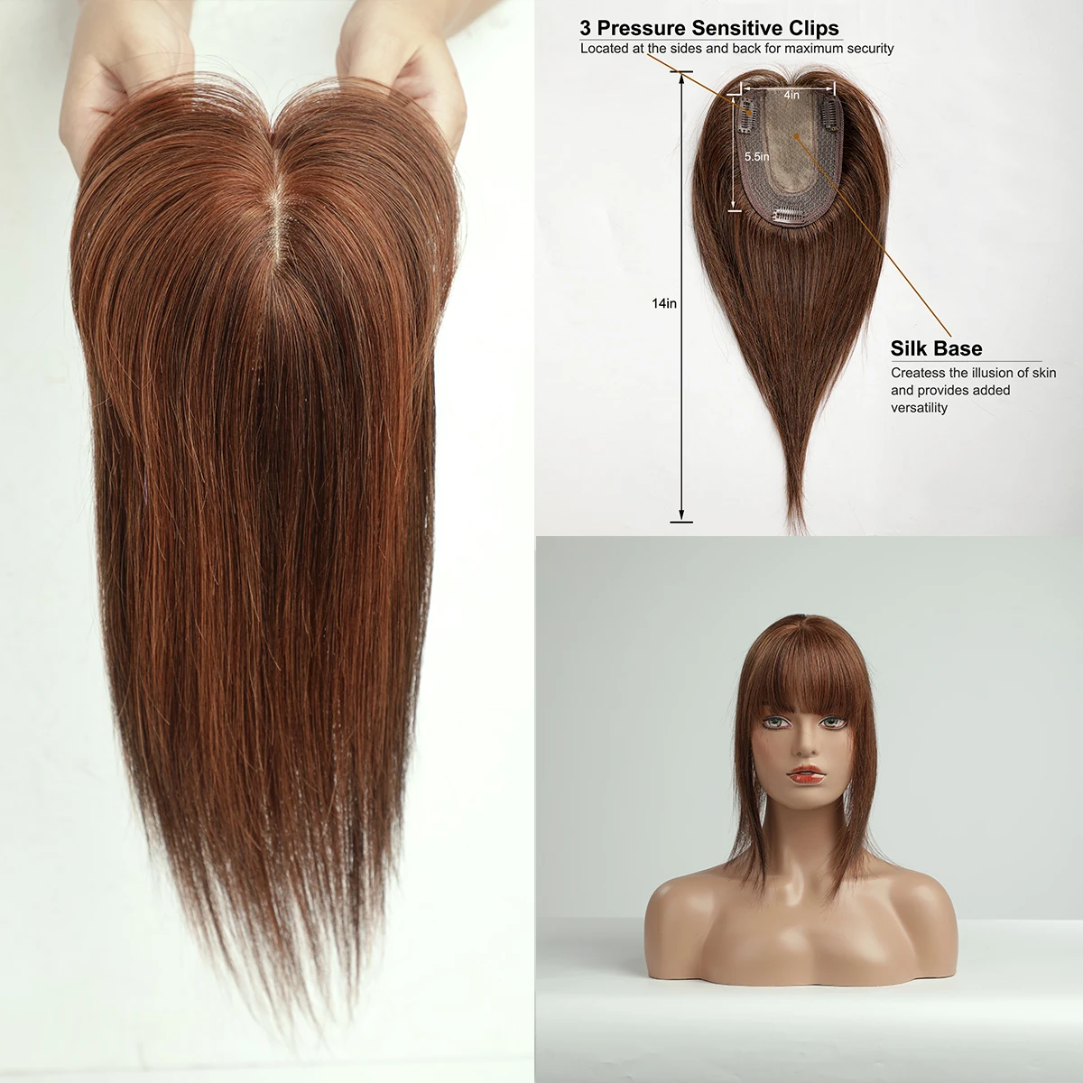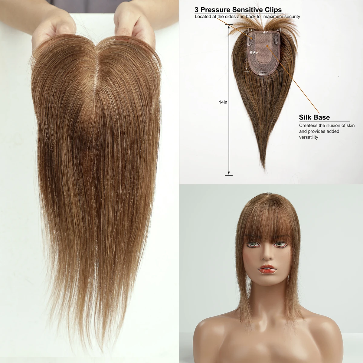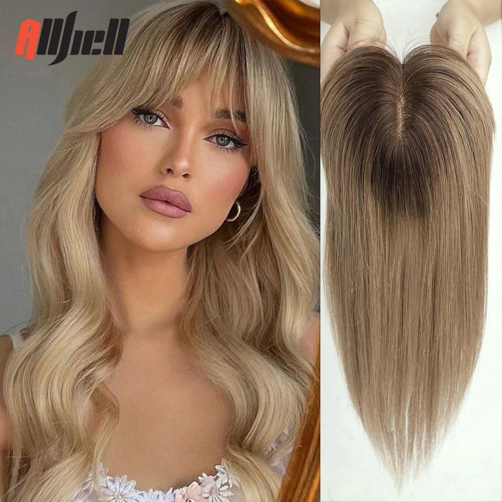 100% Remy Human Hair Toppers Ombre Brown 10 Inch Hairs Topper Wigs With Bangs Silk Base Clip Pieces in Hair Extension for Women