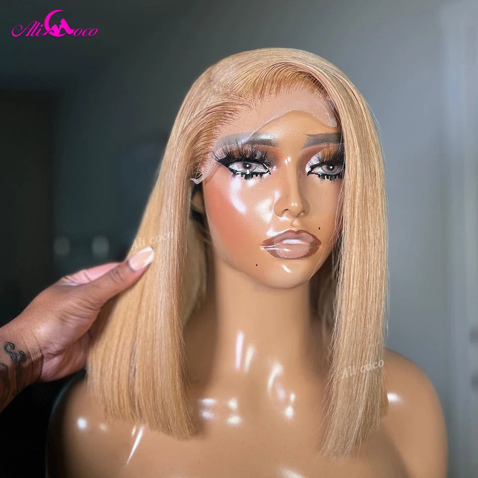 13x4 Honey Blonde Lace Front Wig Straight Short Bob Wig Ash Blonde Pre-Plucked Transparent Lace Frontal Human Hair Wig For Women