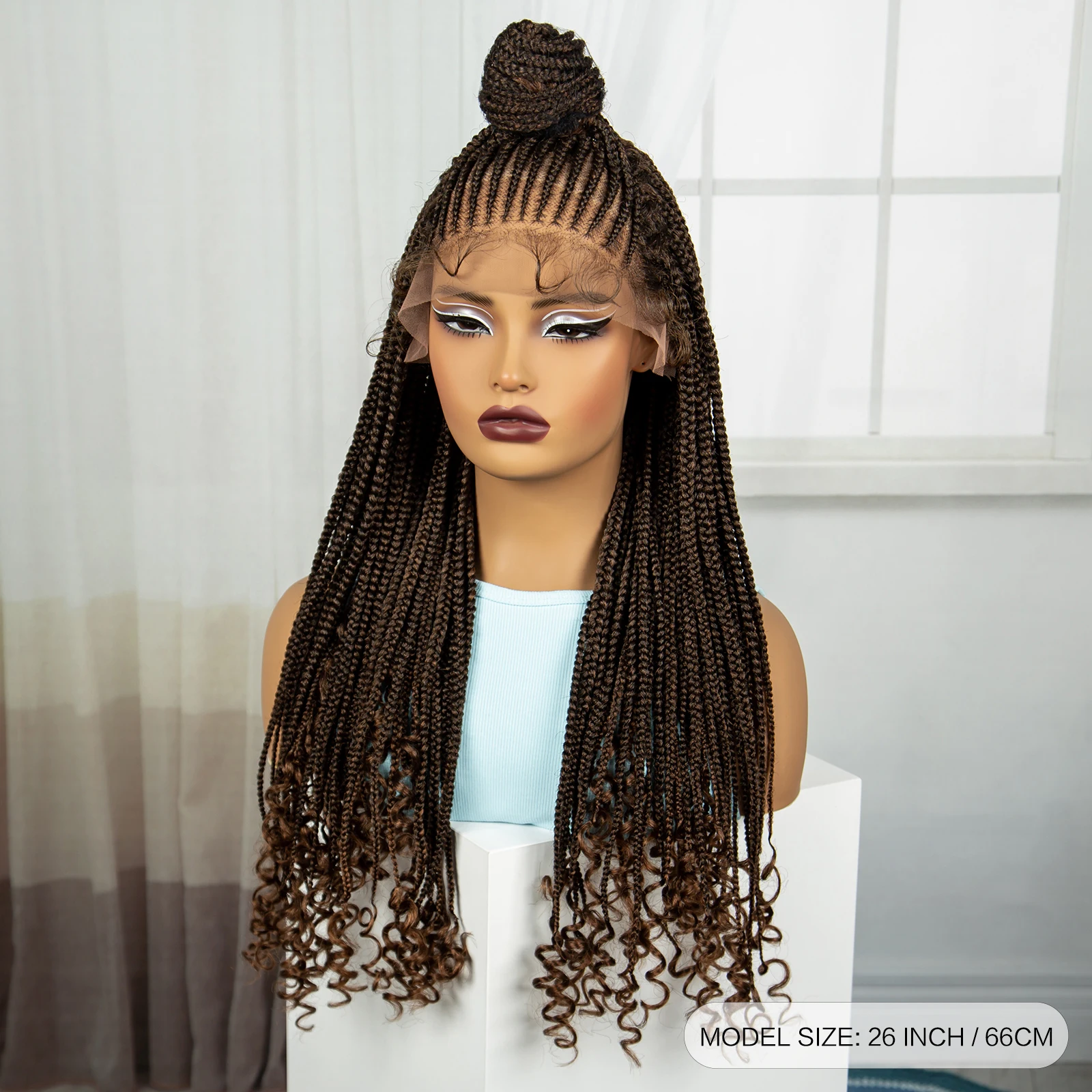 26 inch Synthetic 13x4 Lace Front Updo Braided Wigs With Curly Ends Cornrow Braiding Hair Wigs with Baby Hair for Black Women