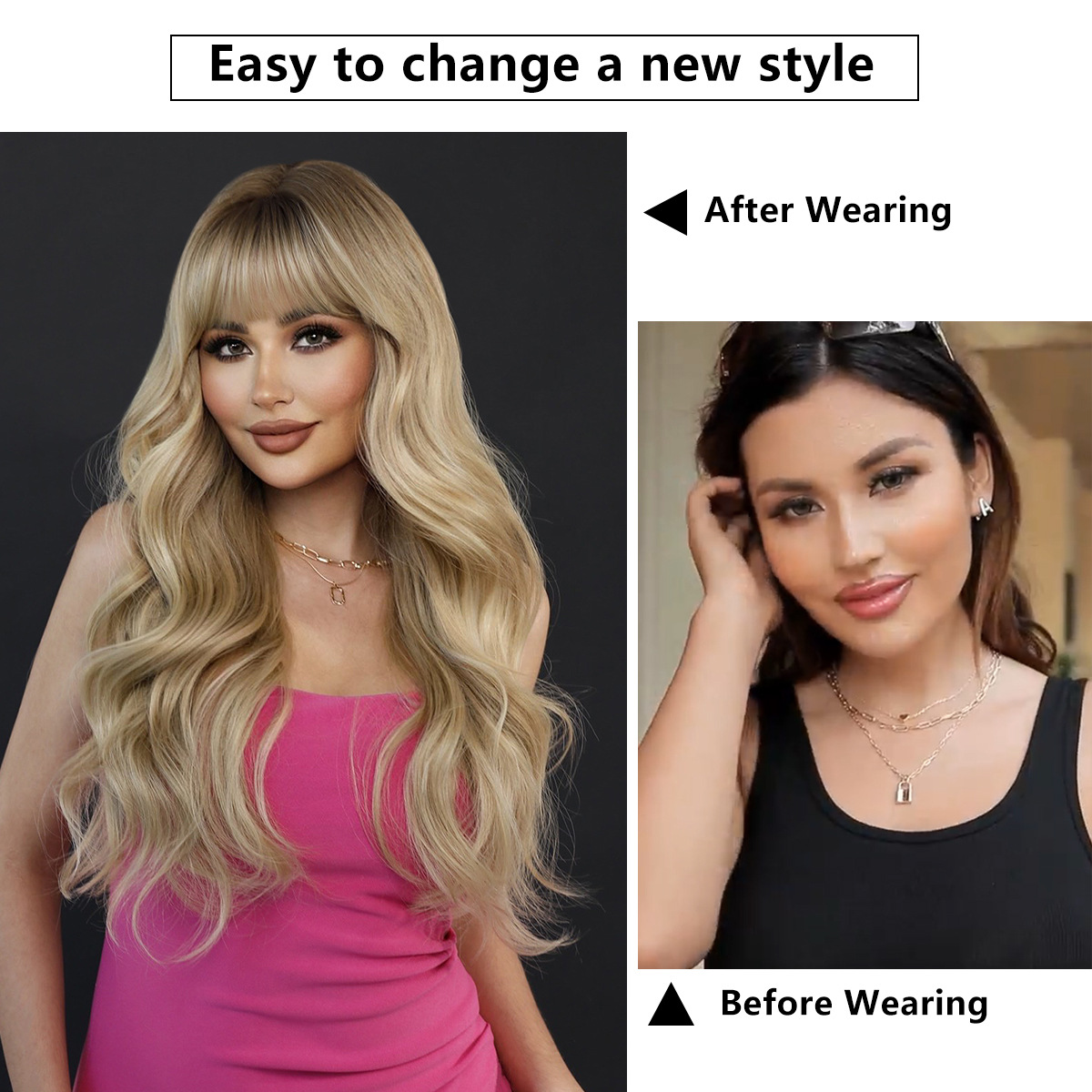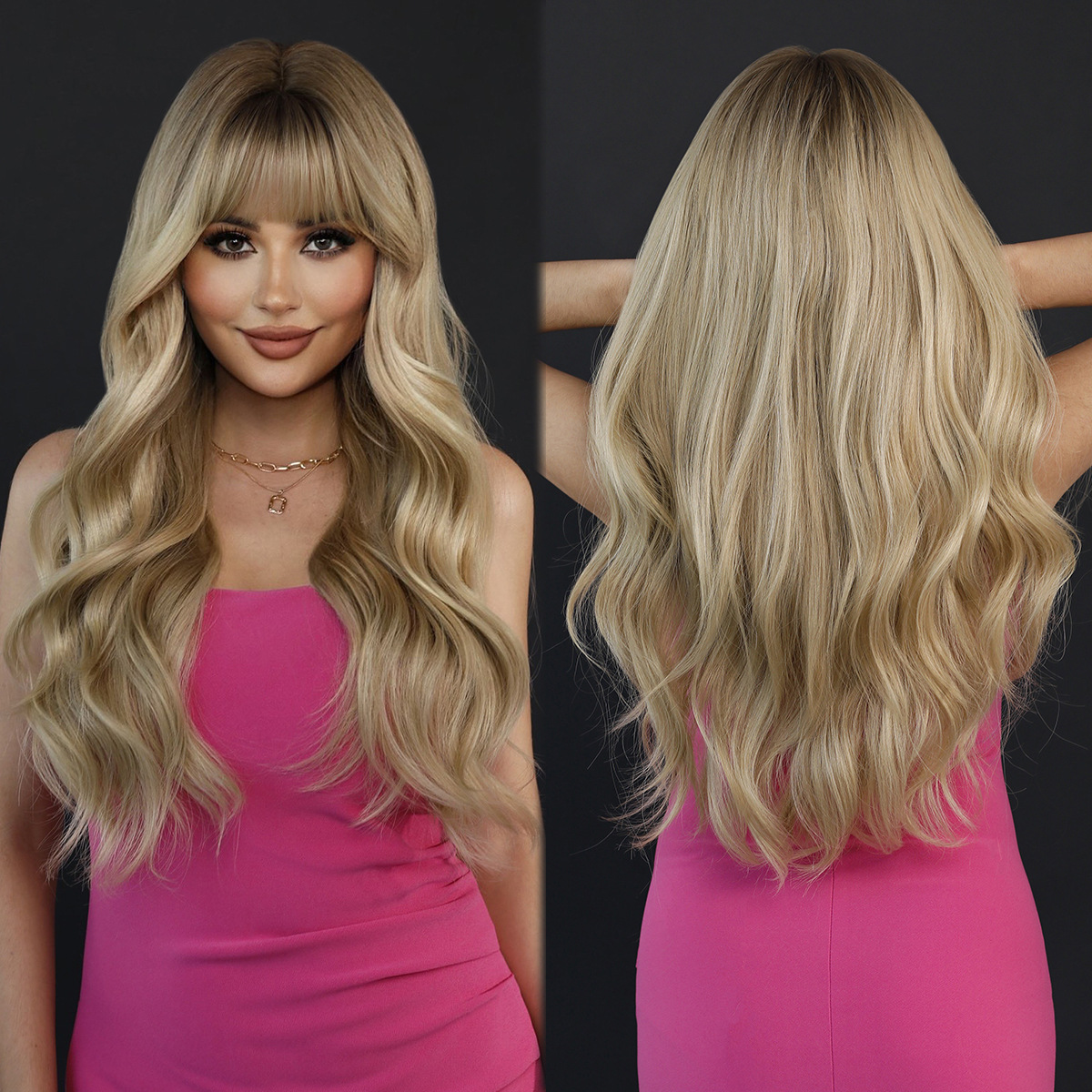 26" Long Body Gradient Color Wavy with Bangs Ombre Blonde Synthetic Hair wig