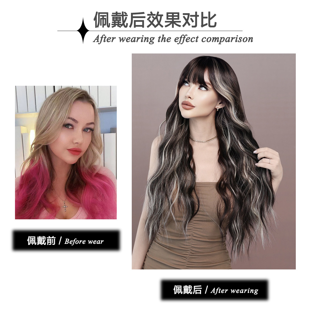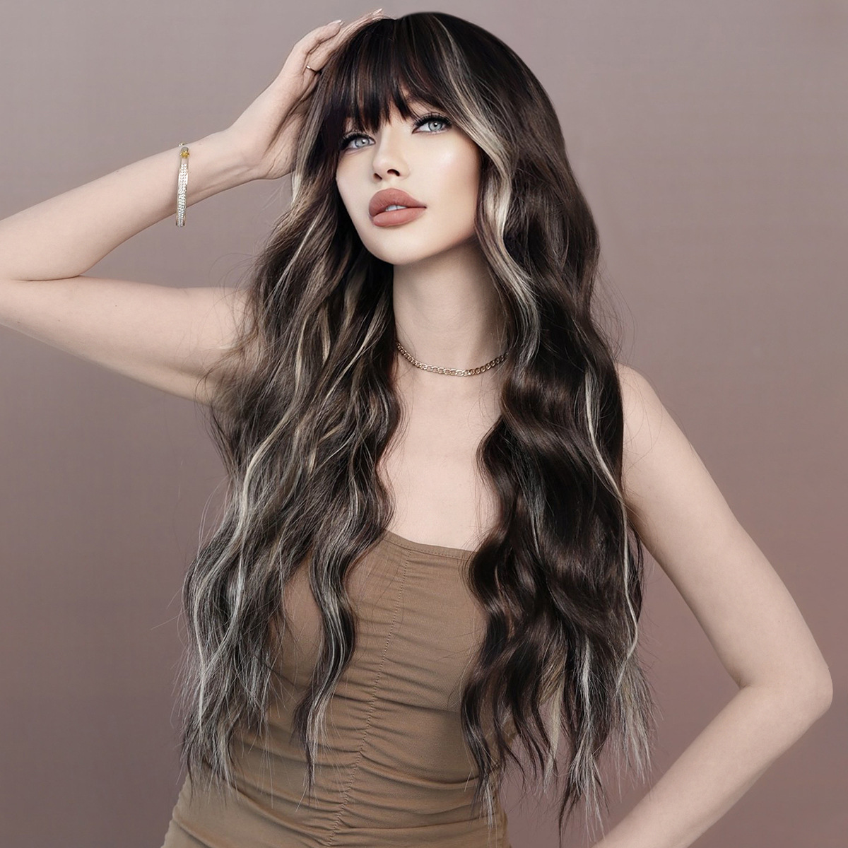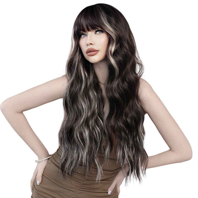 26“ Long Omber mix Brown Wavy Women’s Hair Wig with Bangs for Halloween Christmas Wigs