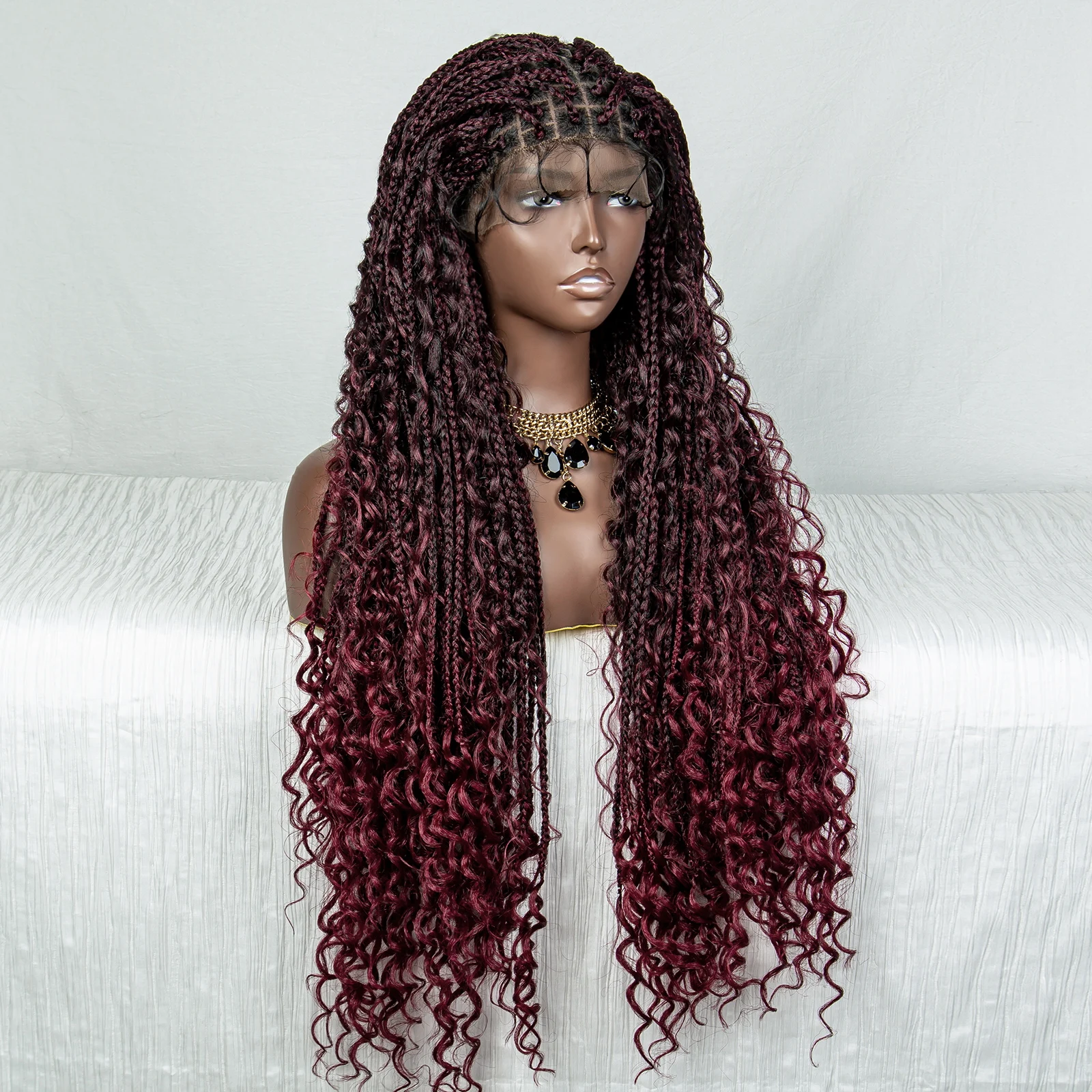32 Inch 99J Burgundy Synthetic Lace Front Braided Wigs for Black Women Afro Curly Lace Frontal Braided Lace Wigs with Baby Hair