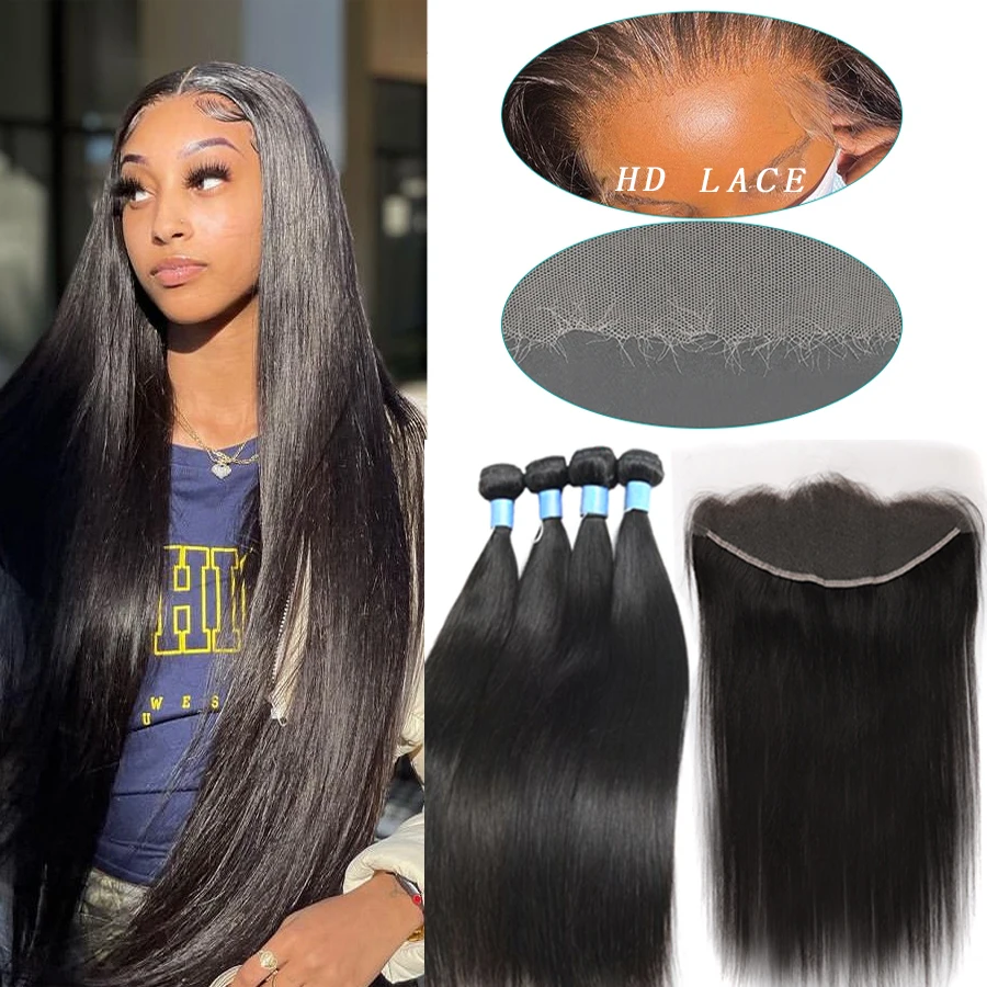 32 inch Bone Straight Hair Bundles With HD Lace Frontal Melt Skins Brazilian Human Hair Extension HD Lace Closure With Bundles