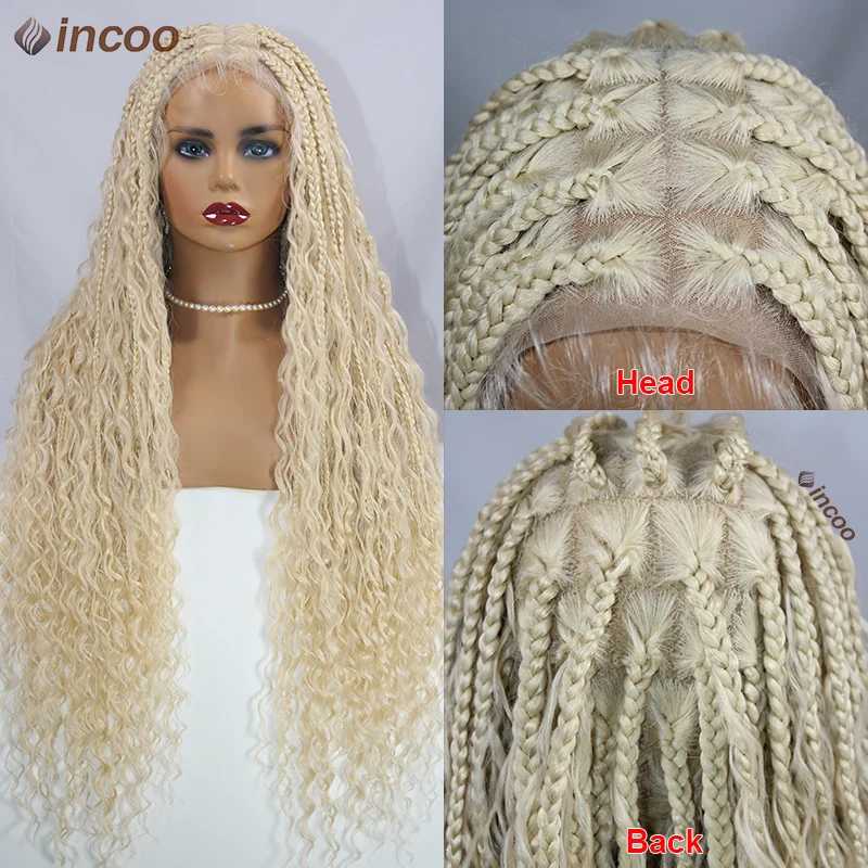 613 Blonde Bohemian Box Braids Wigs Full Lace Front Wigs Knotless Braided With Curly Synthetic Hair Wig Goddess Locs Braided Wig