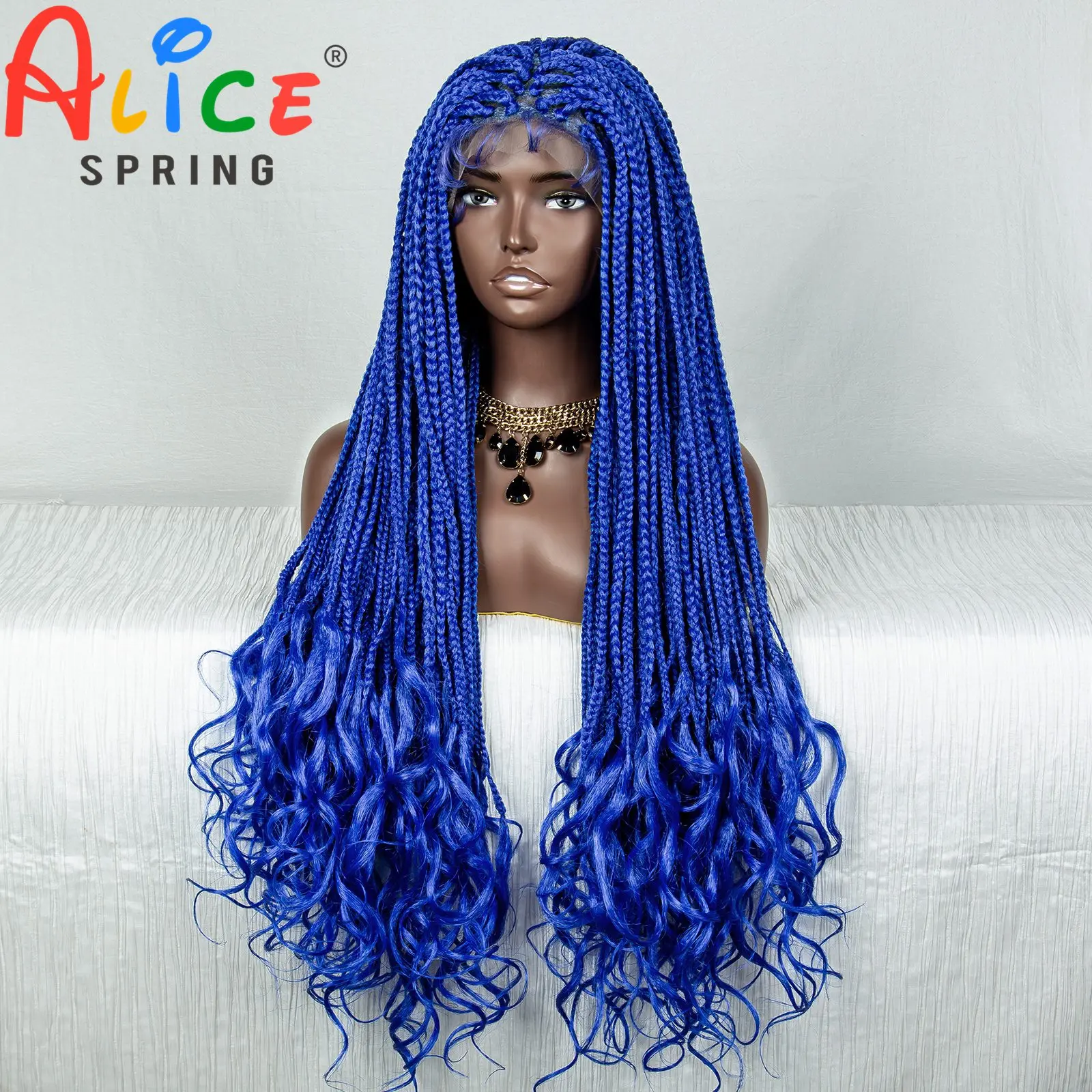 36 Inches Blue Synthetic Braided Lace Front Wig Crochet Braid Lace Wig with Baby Hair for Black Women Knotless Box Braiding Hair