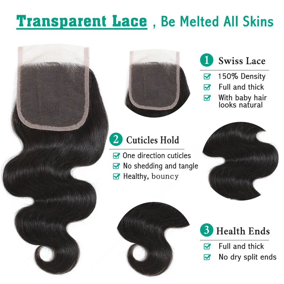 4x4 Body Wave Lace Closure With Baby Hair Raw Indian Human Hair One Piece HD Transparent Lace Closures Only For Black Women