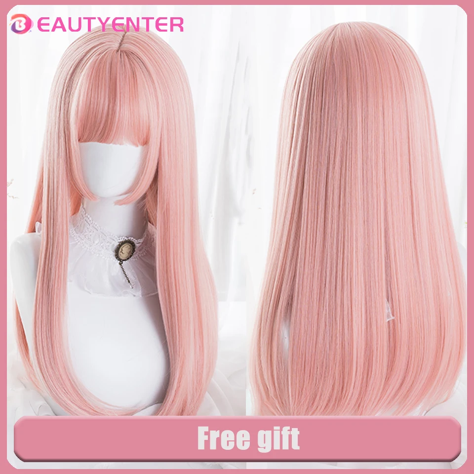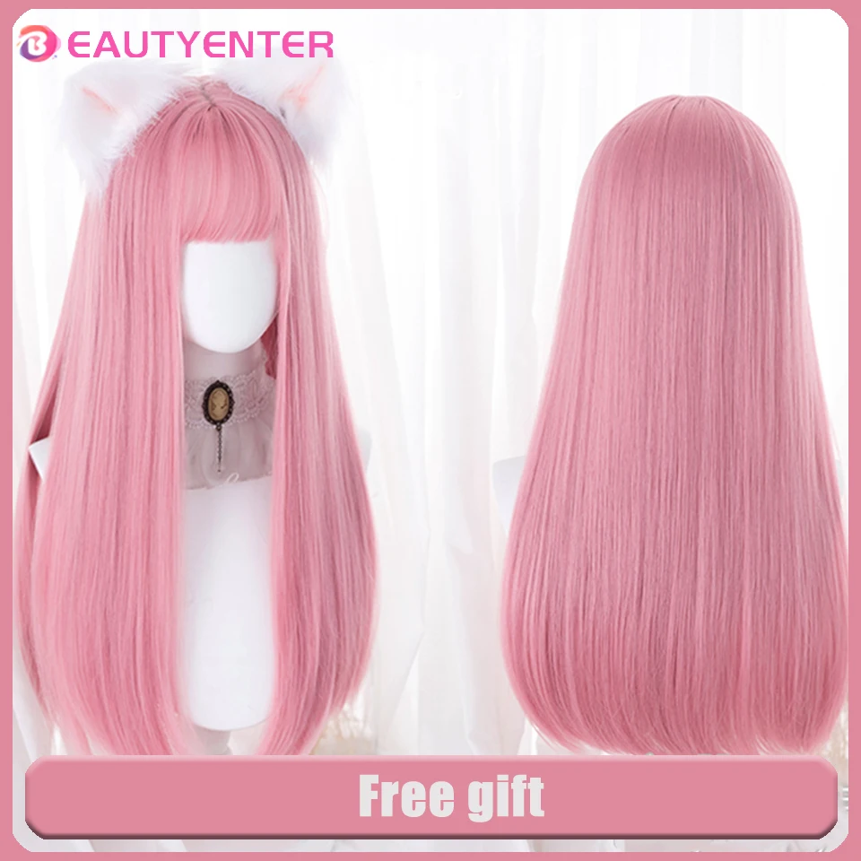 BeautyEnter Synthetic Wig Pink long straight Wig With Bangs For Women Long Hair Heat Resistant Lolita Cosplay Party