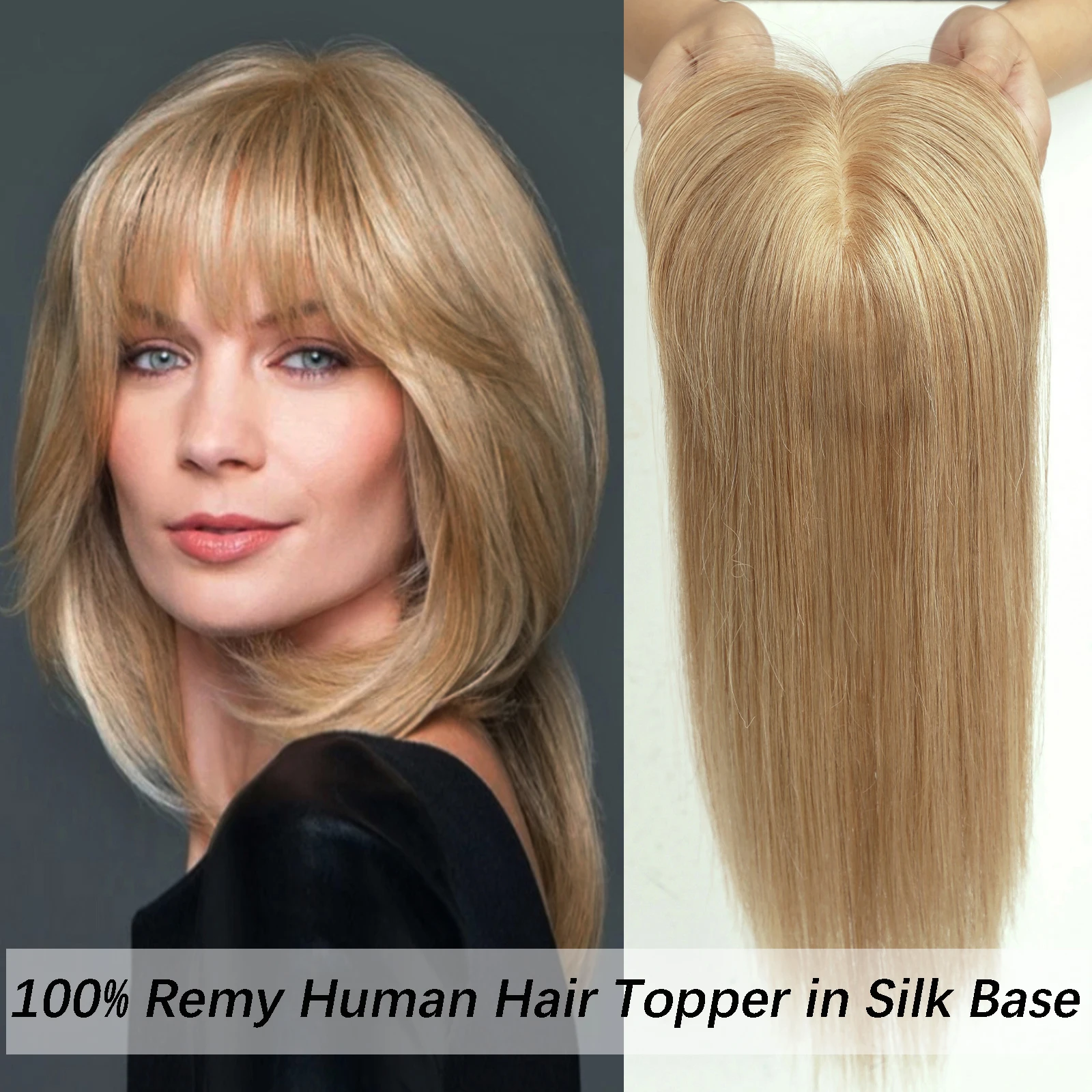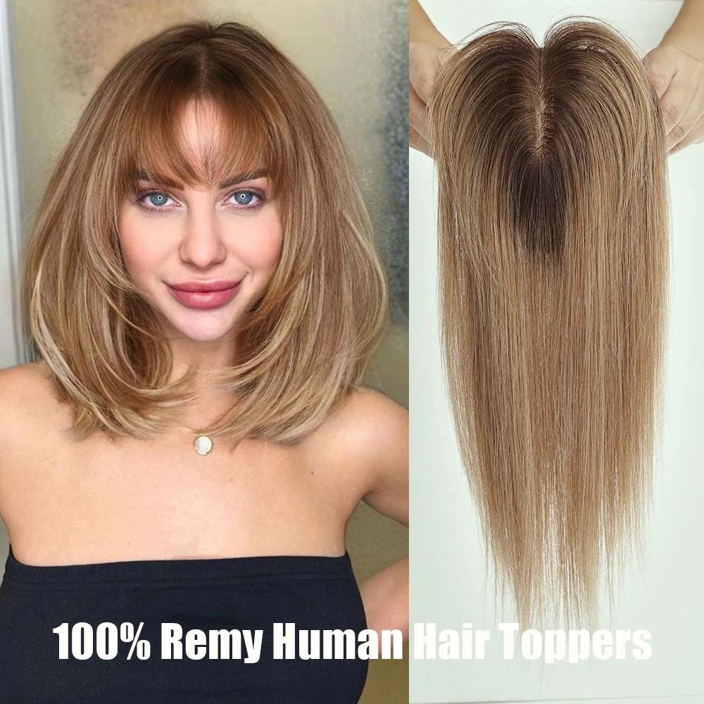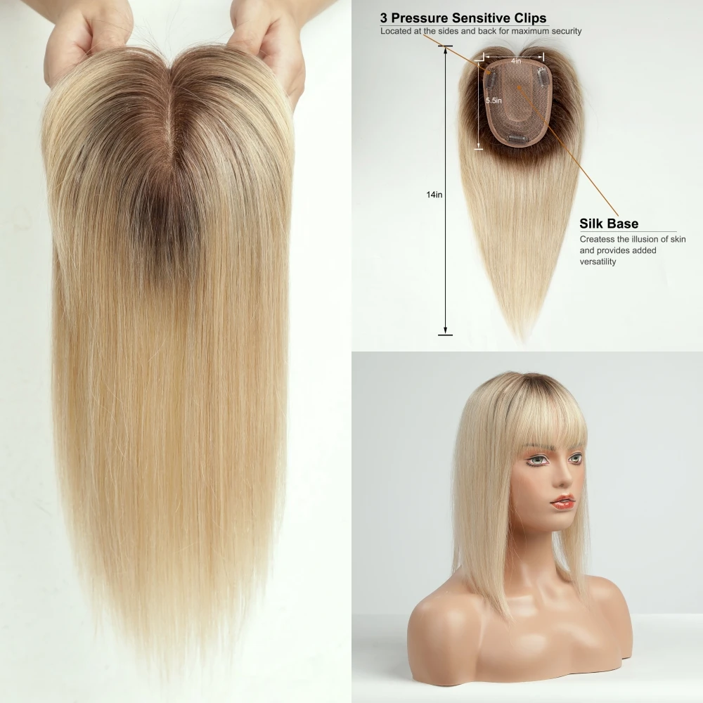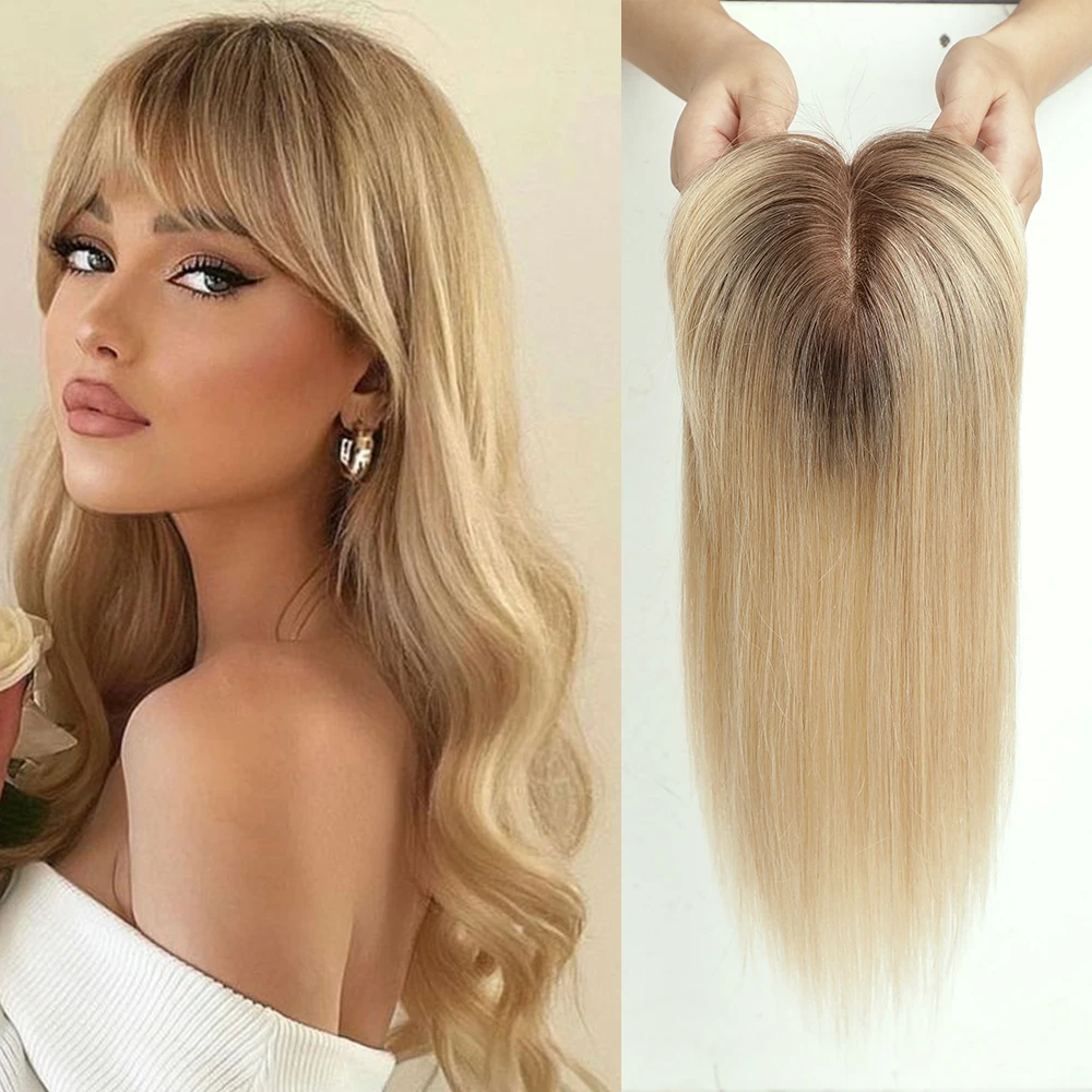 Blonde Human Hair Toppers with Bangs Dark Root Straight Remy Human Hair Silk Base Topper Clip in Hair Extensions for Women Daily