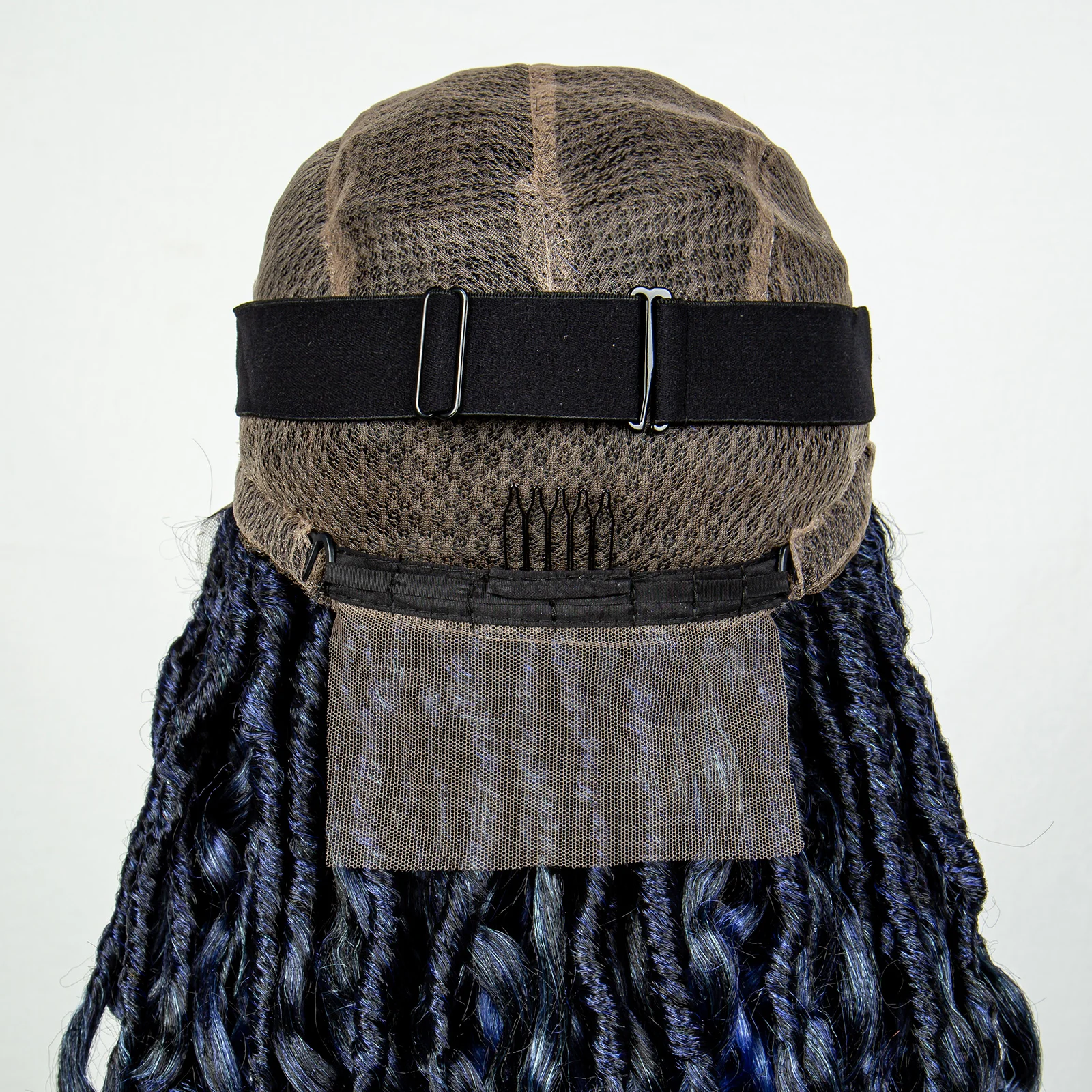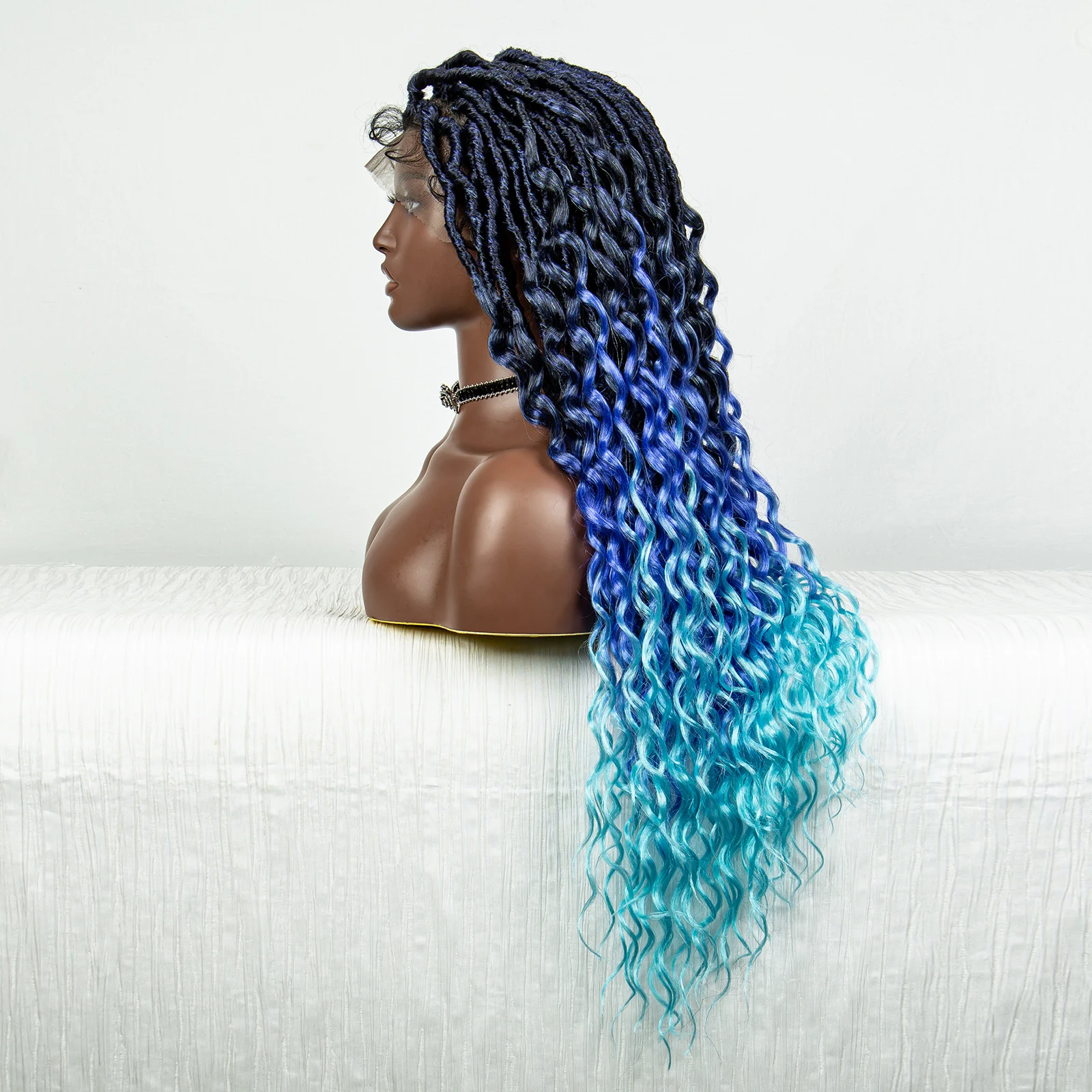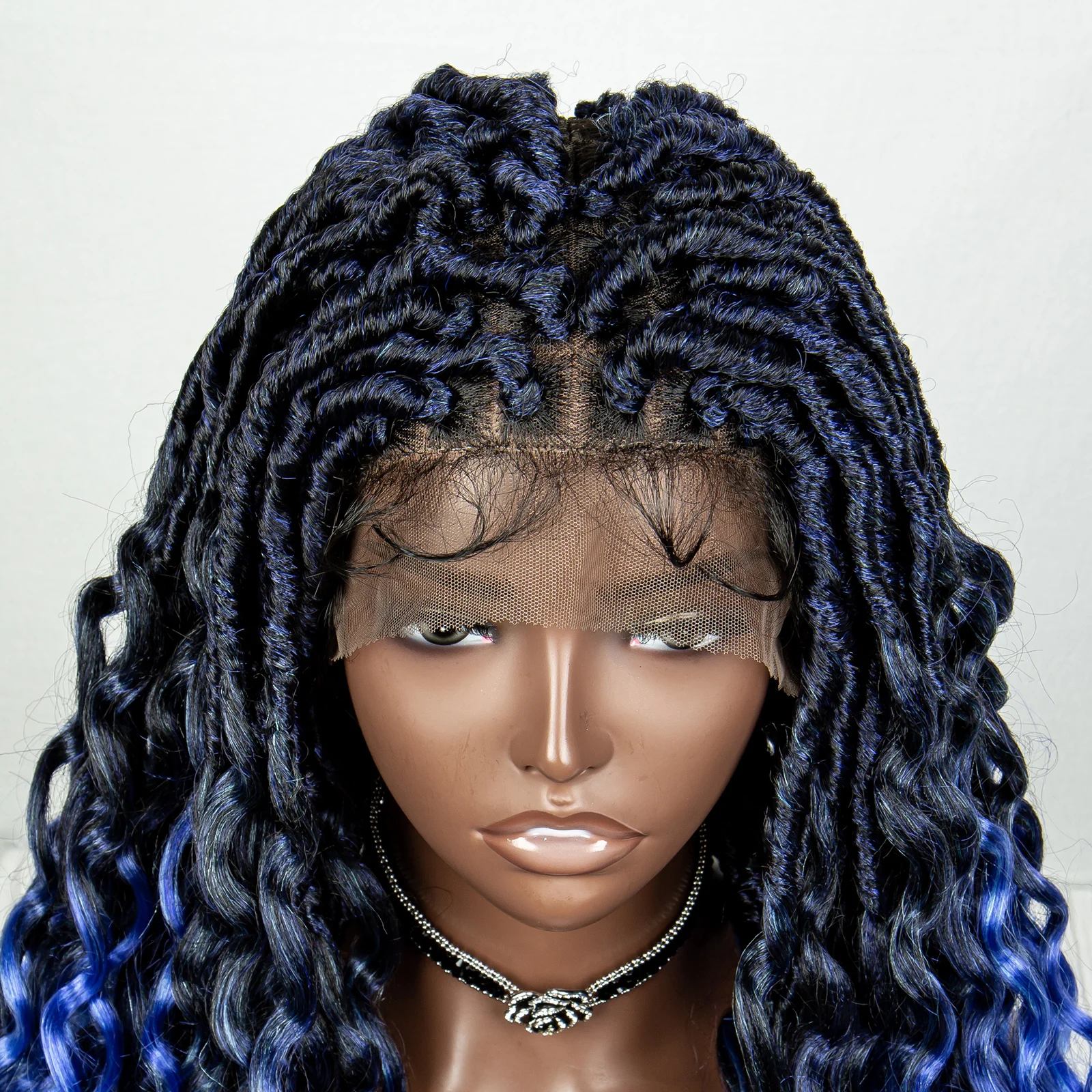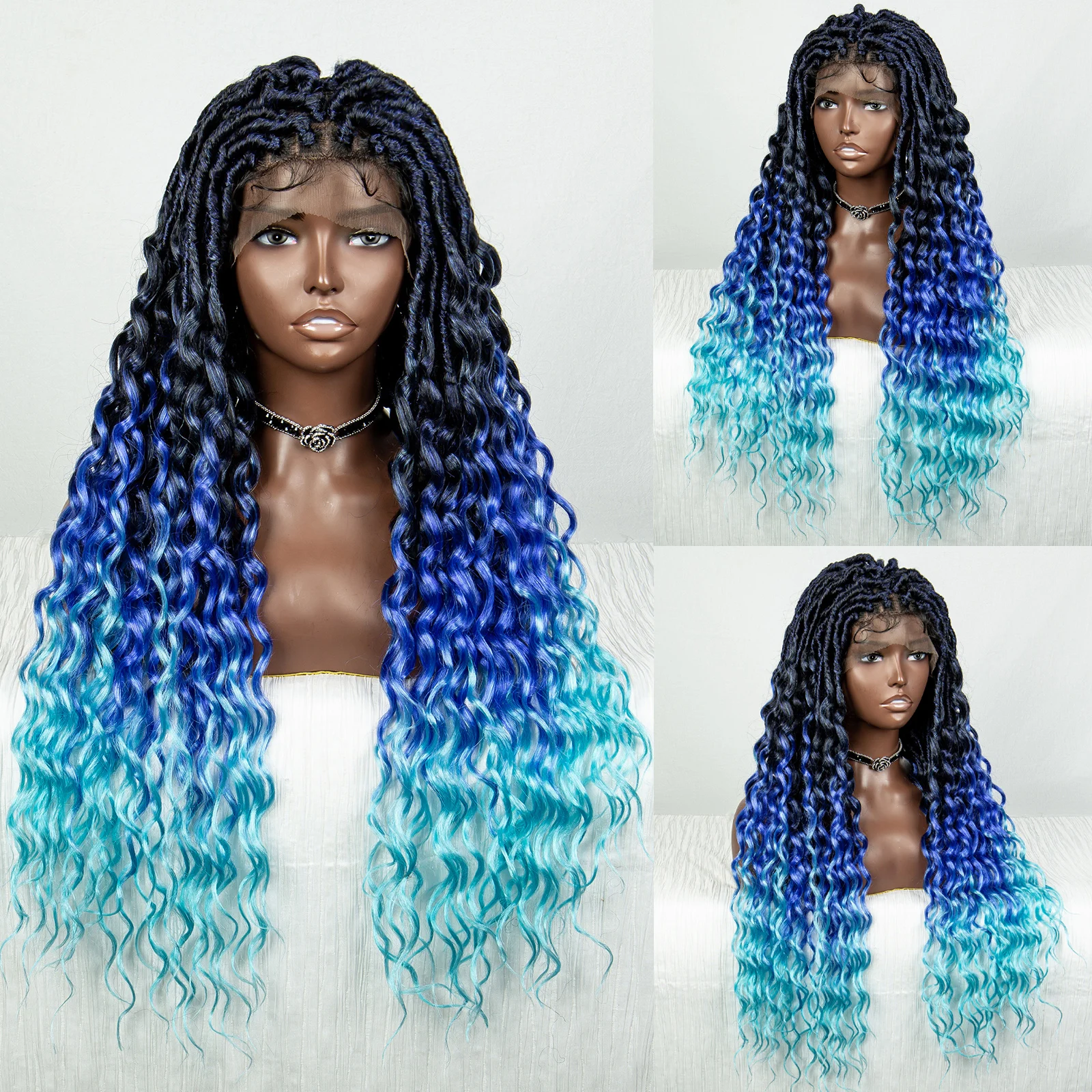 Blue Full Lace Synthetic Braided Wig Faux Locs Crochet Wigs with Baby Hair Soft Knotless Dreadlock Wig with Wave Curly Ends
