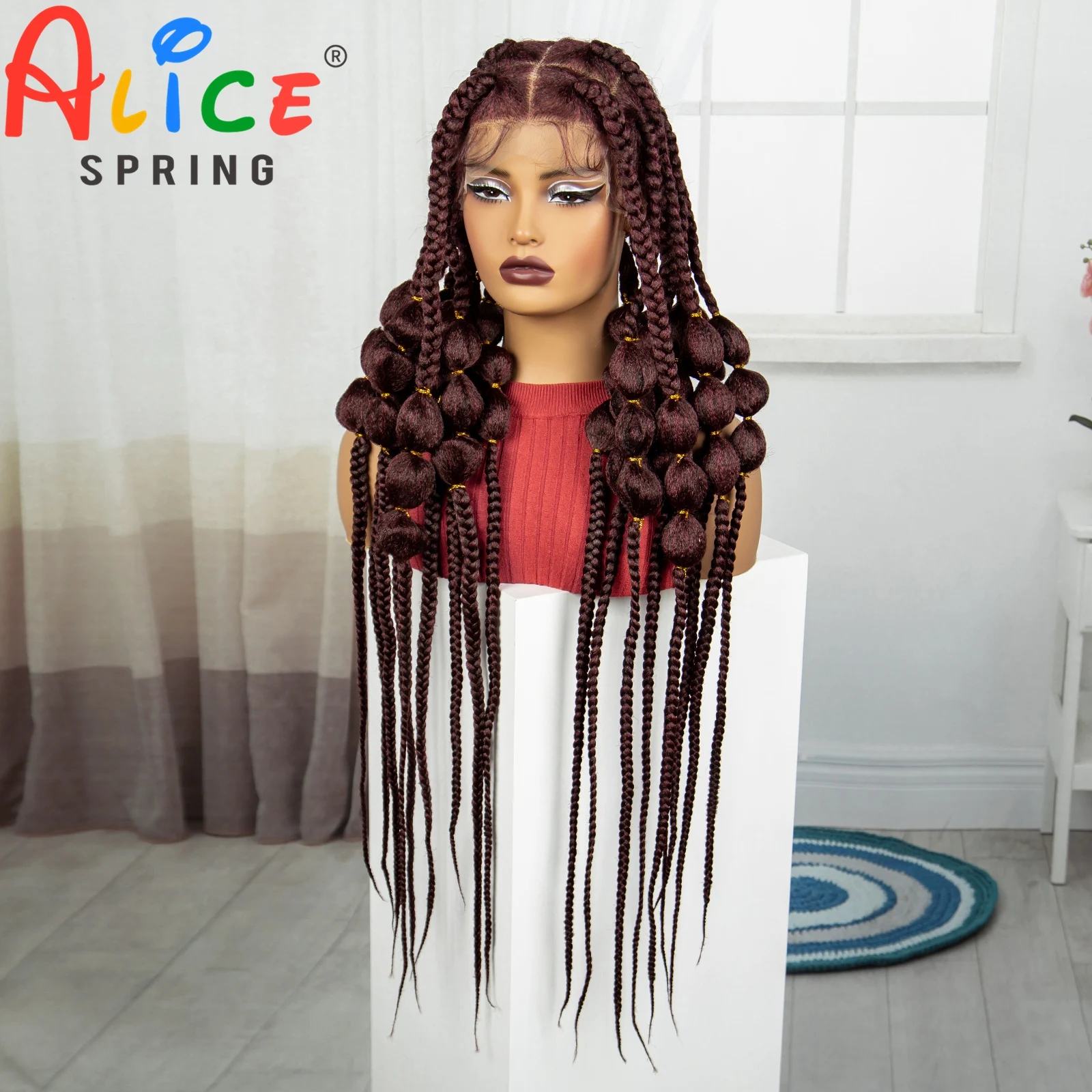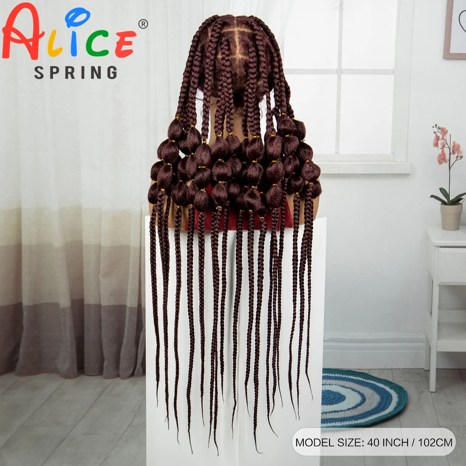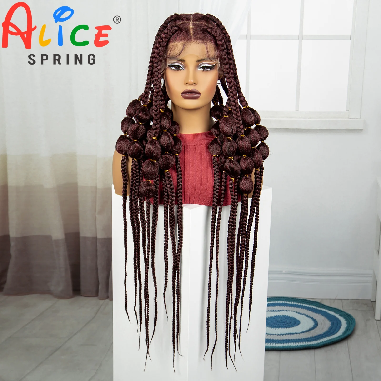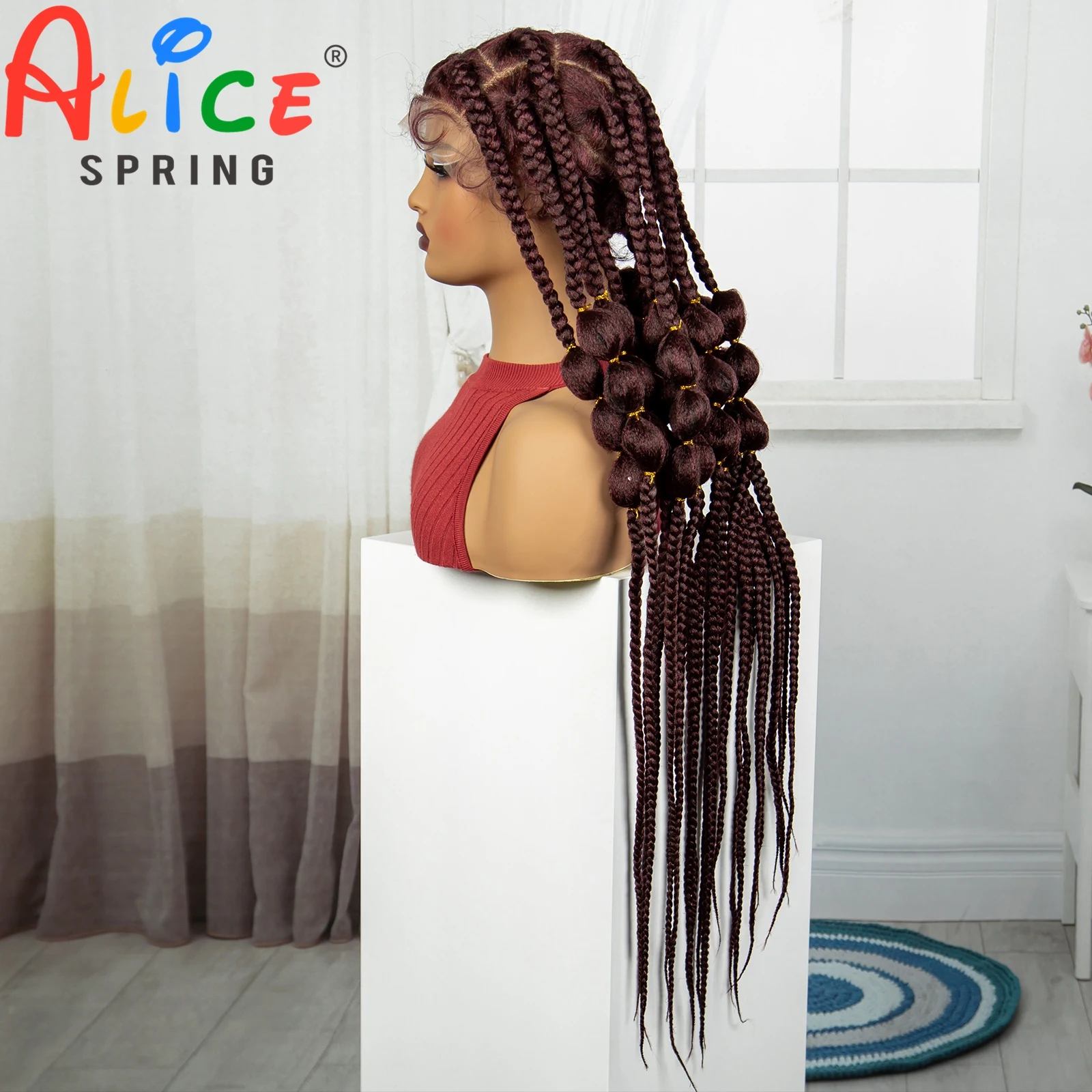 Burgundy 40 Inches Synthetic Full Lace Braided Wigs Synthetic Knotless Handmade Bantu Braids Lace Wig With Baby Hair For Women