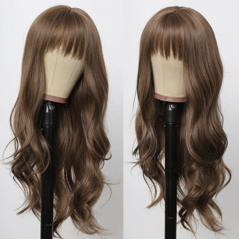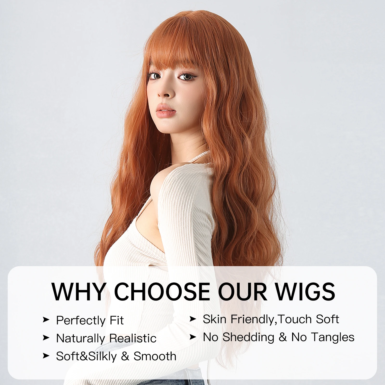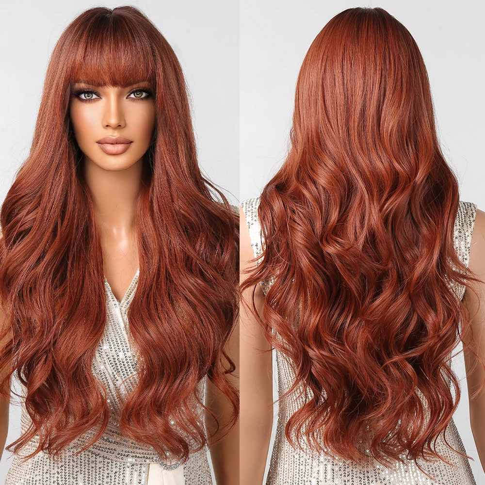 Copper Ginger Red Brown Long Fluffy Wavy Synthetic Wigs with Bangs Cosplay Hair Wig for Women Daily Natural Heat Resistant