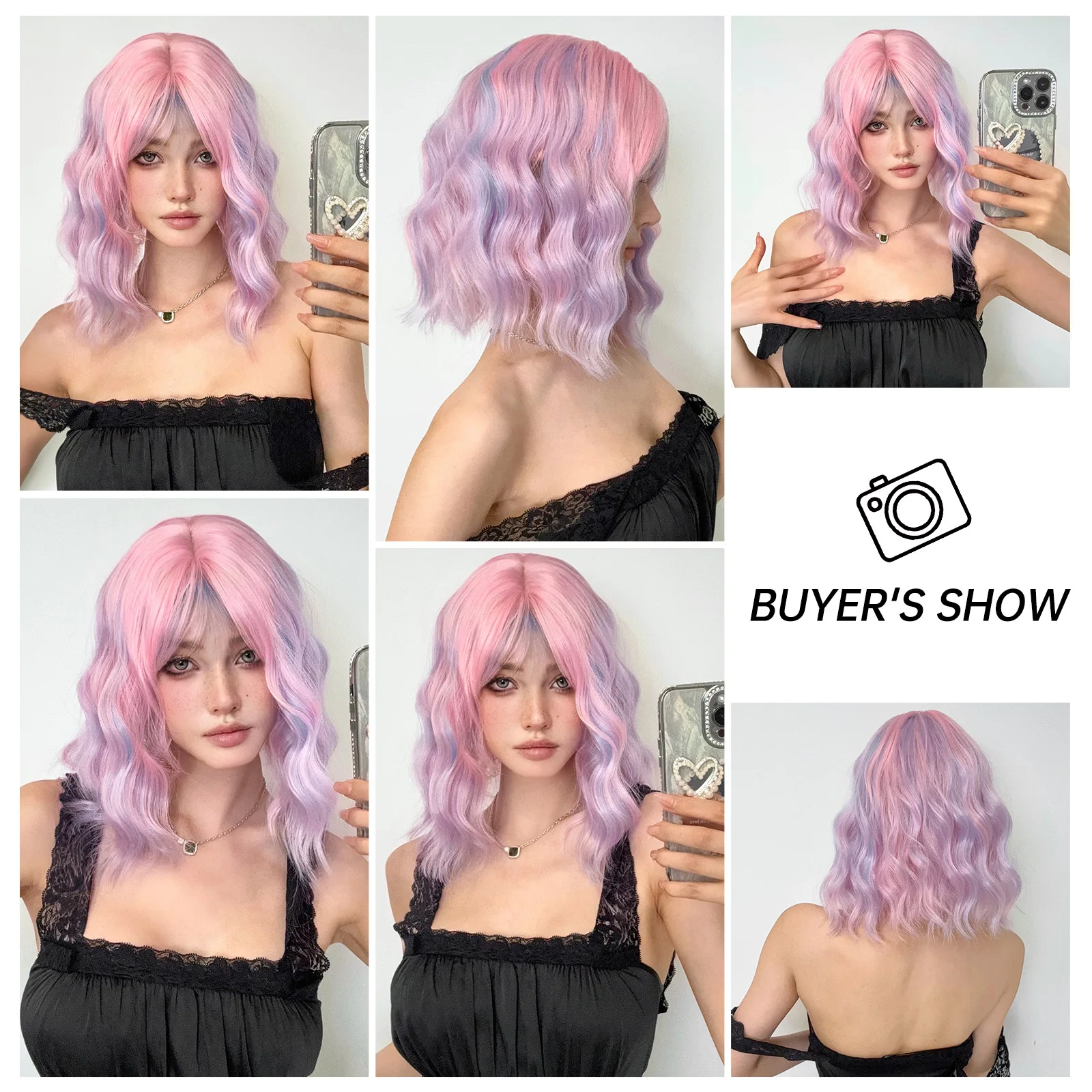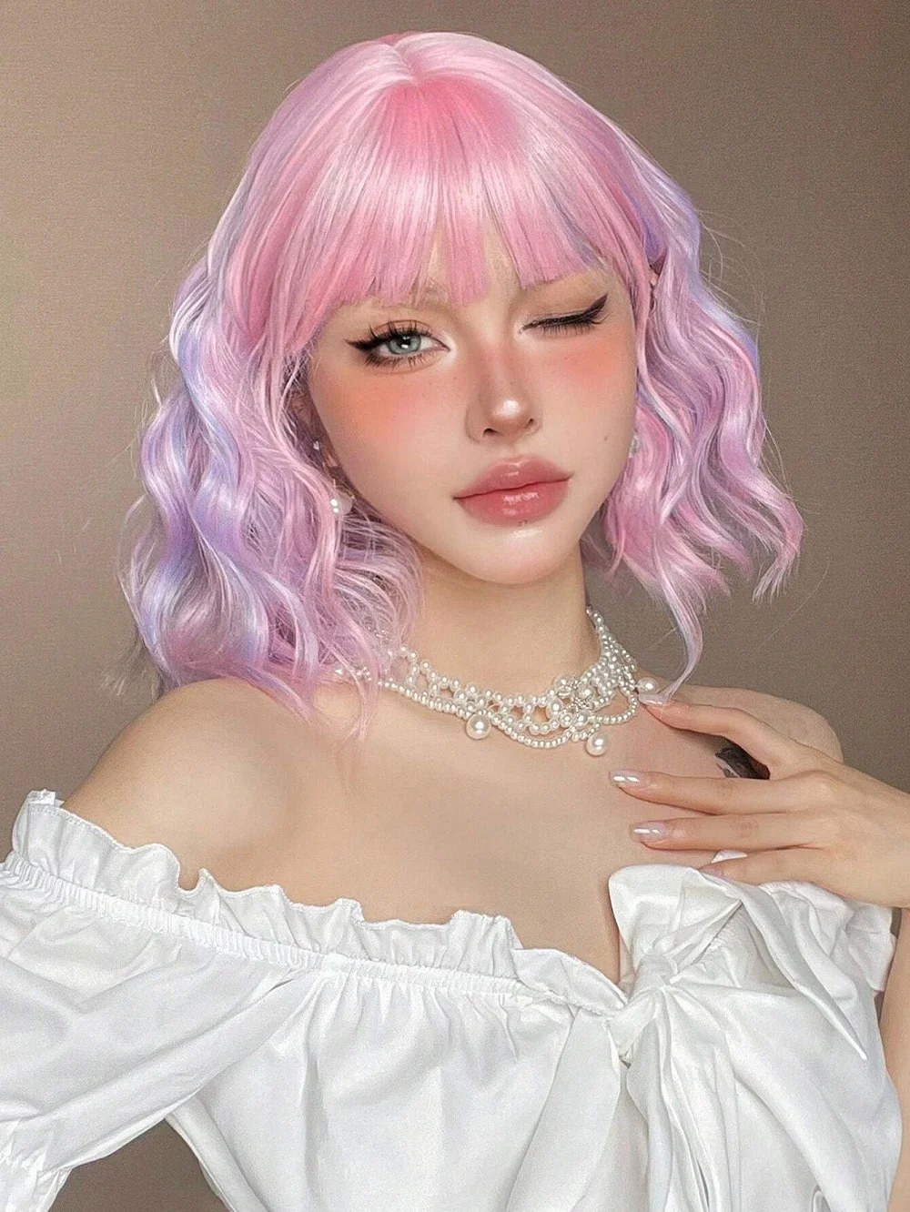 Curly Pink Purple Mixed Blue Wavy Synthetic Wigs with Bangs Short Bob Colorful Cosplay Wig for Women Natural Heat Resistant Hair