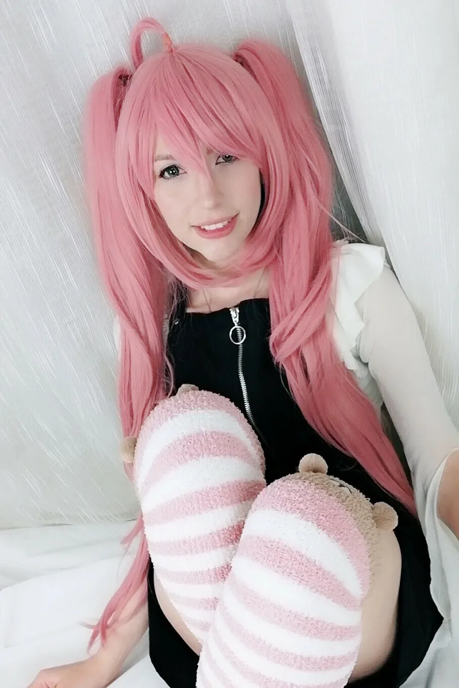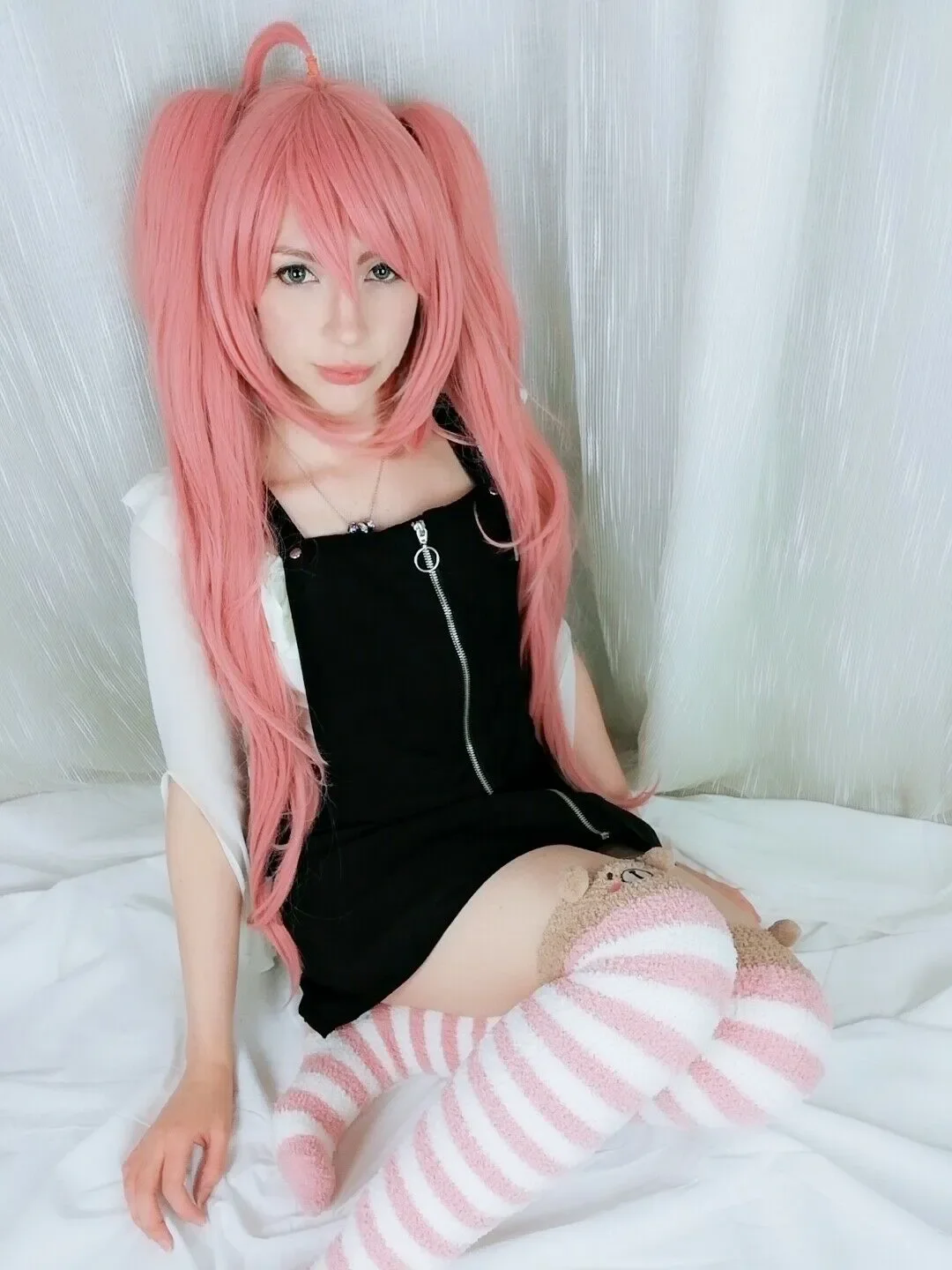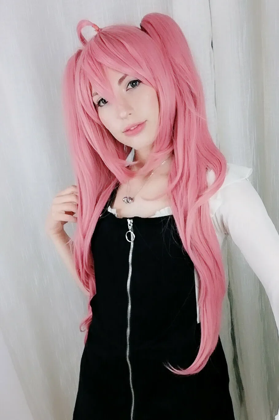 Danganronpa Junko Enoshima Cosplay Wigs Long Pink Curly Woman Hair Wig + 2 Ponytail