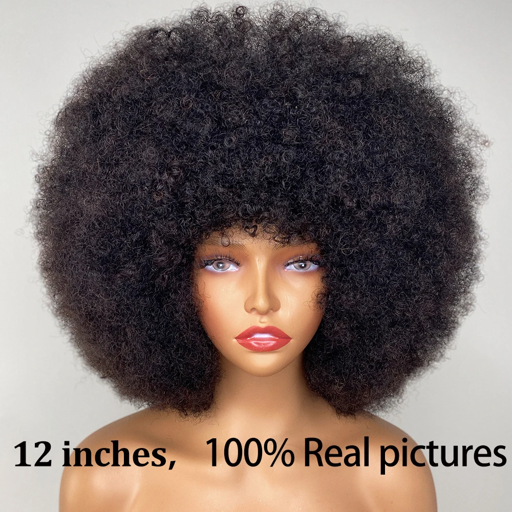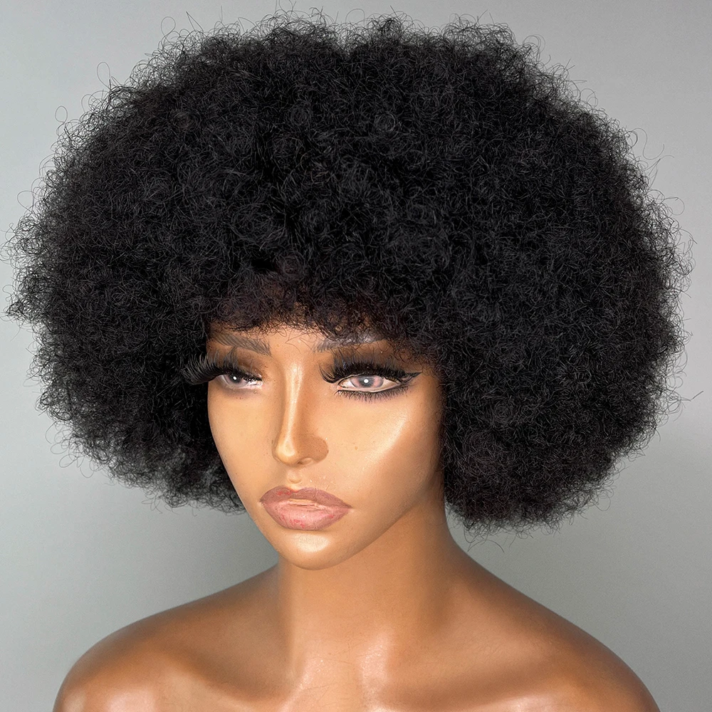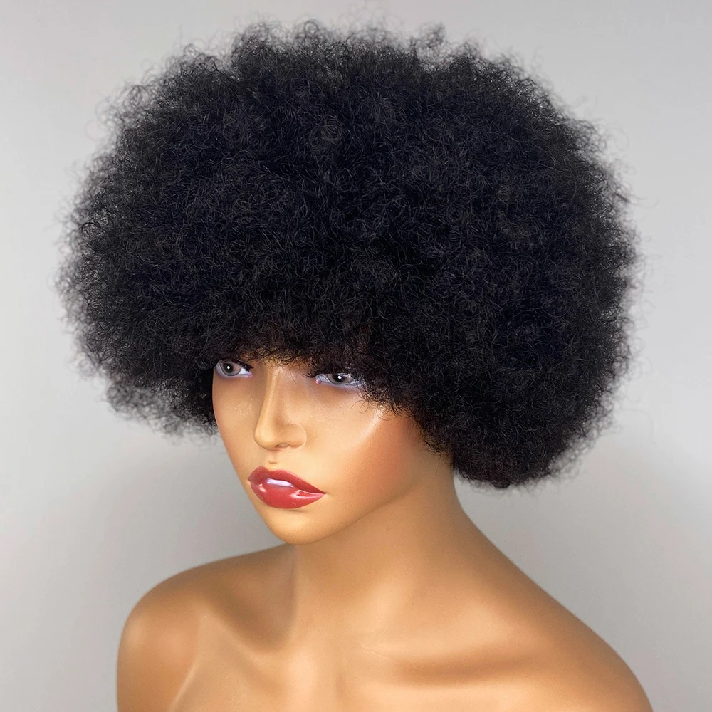 Fluffy Afro Kinky Curly Human Hair Wig With Thick Bangs Natural Short Bob Wigs For Black Women 180% Density Full Machine Hair