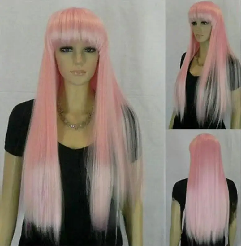 FREE SHIPPING Lolita Long pink Straight Full Bangs Loli Cosplay Synthetic Hair Wig