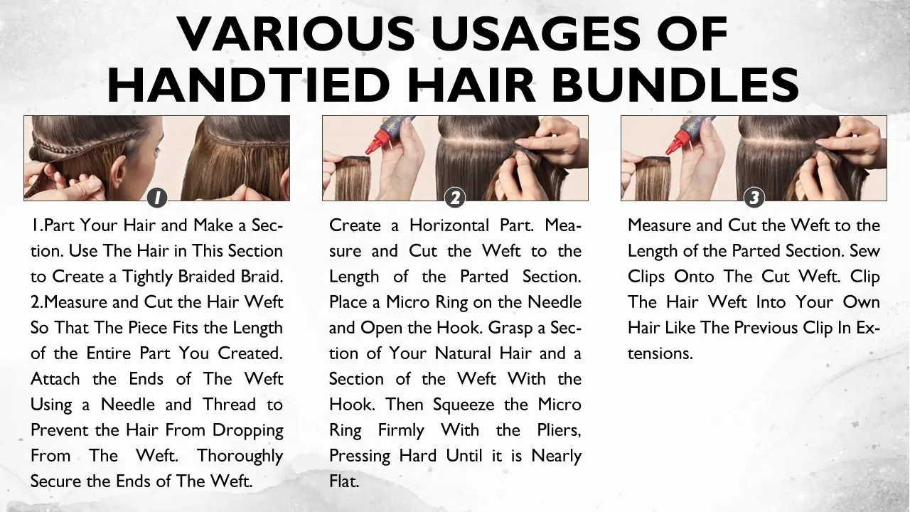 - 1.Part your hair and make a section. Use the hair in this section to create a tightly braided braid.Measure and cut the hair weft so that the piece fits the length of the entire part you created. Attach the ends of the weft using a needle and thread to prvent the hair from dropping from the weft. Thoroughly secture the ends of the weft.
