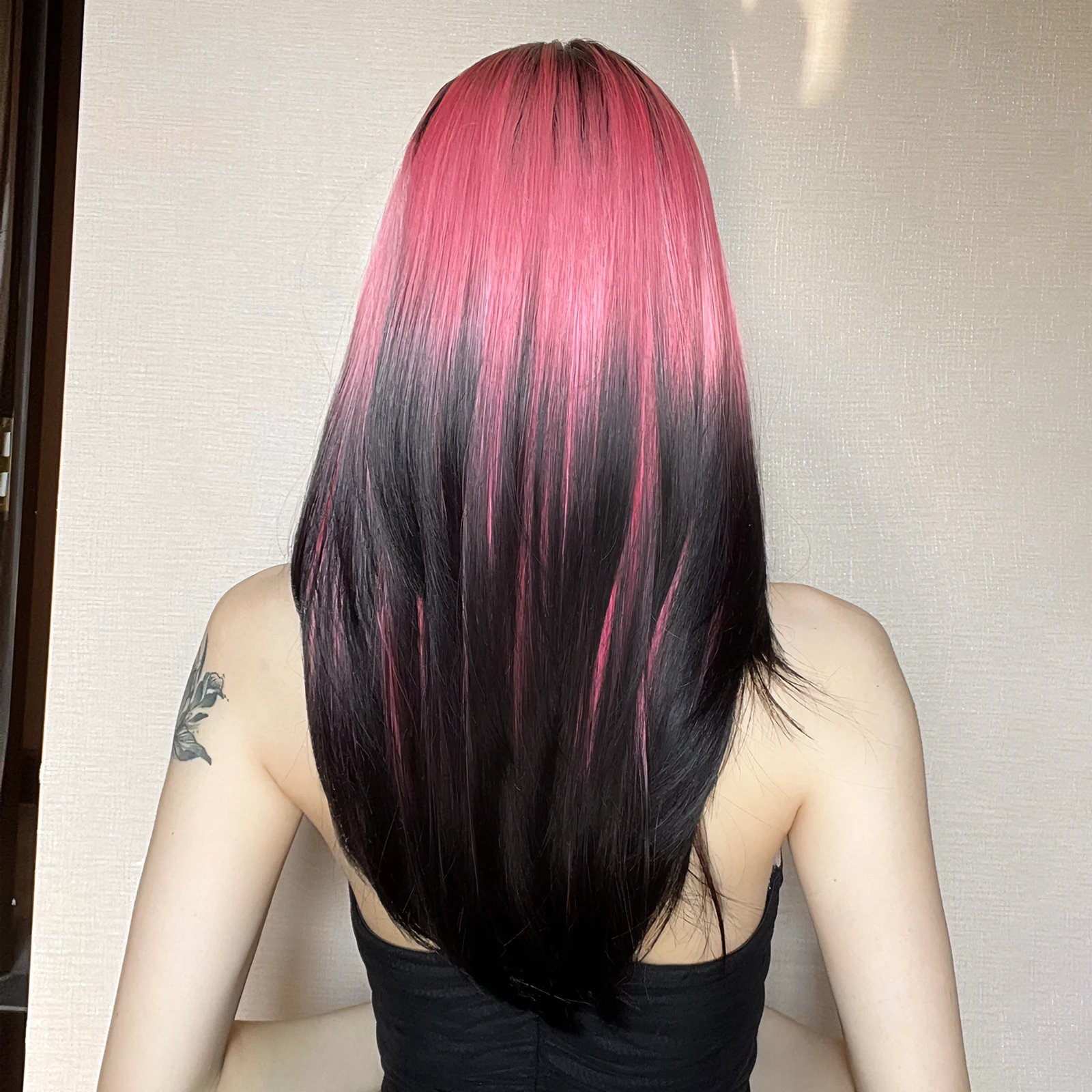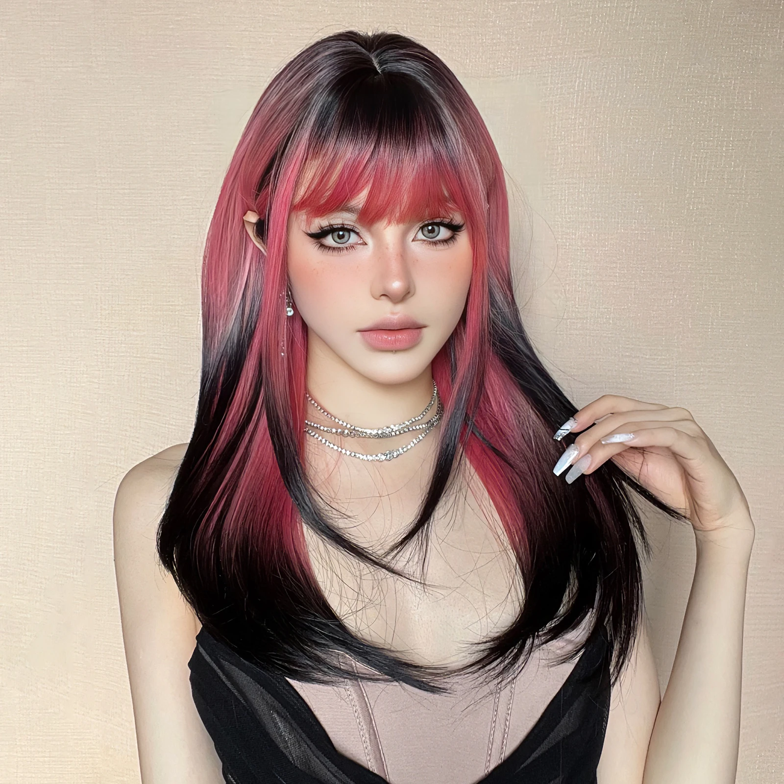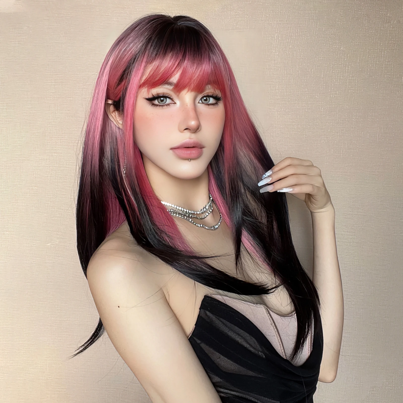 GEMMA Pink Black Long Straight Cosplay Wig Synthetic Layered Women's Wig with Bangs Heat Resistant Party Lolita Natural Hair