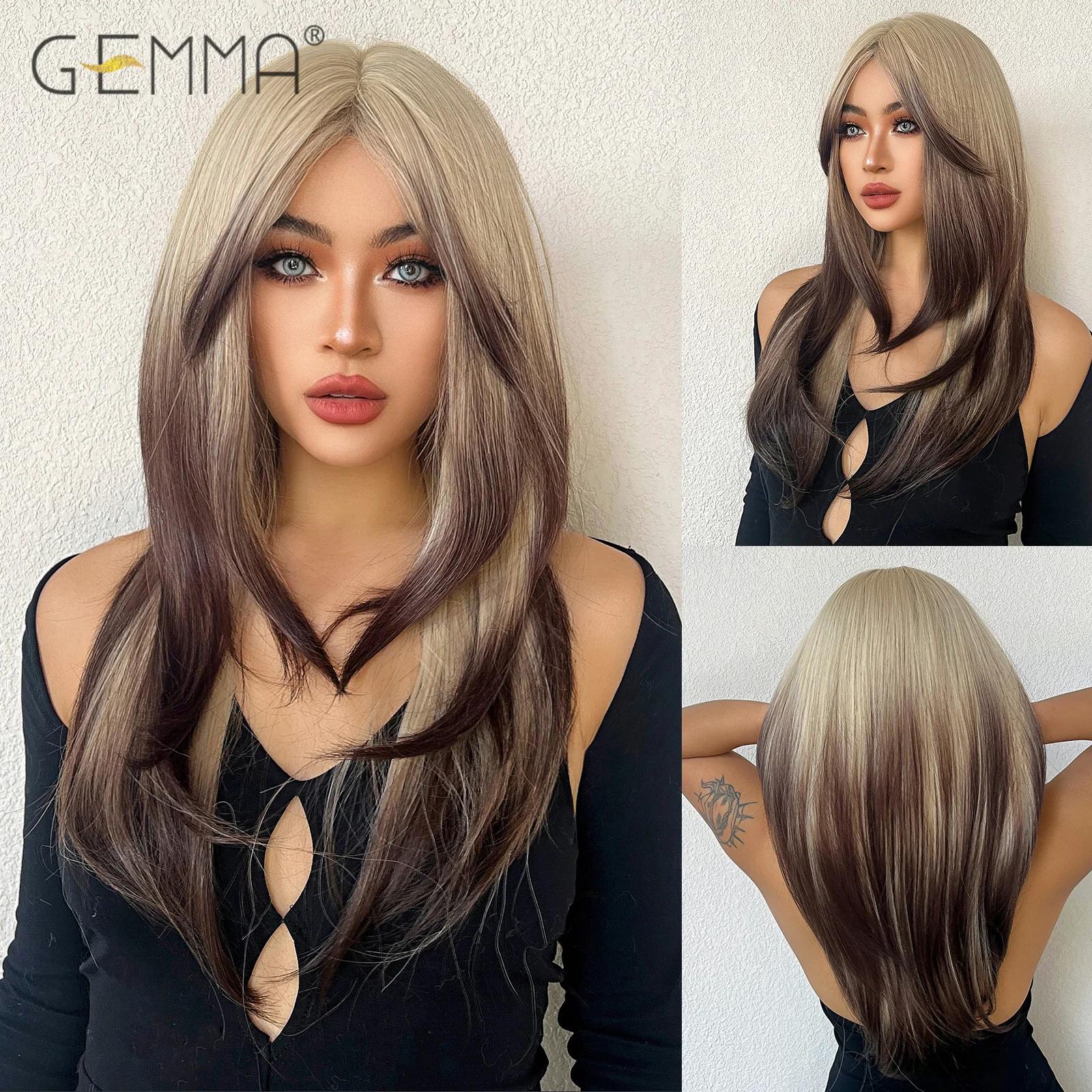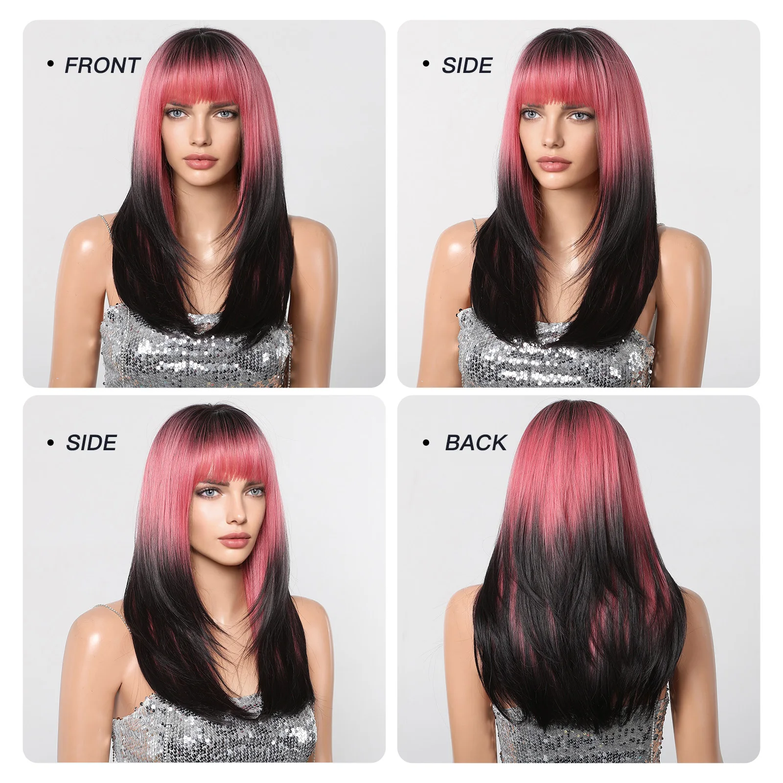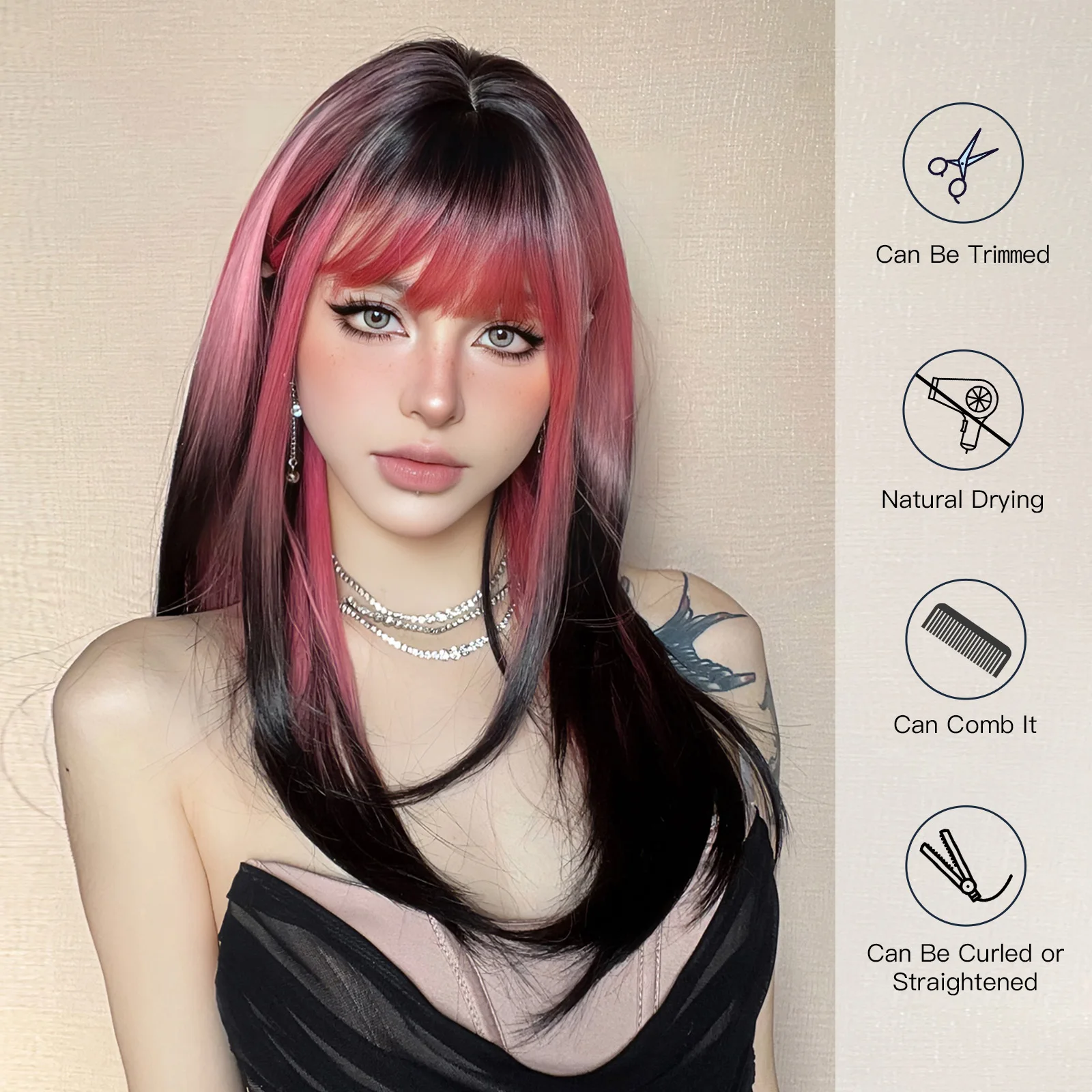 GEMMA Pink Black Long Straight Cosplay Wig Synthetic Layered Women's Wig with Bangs Heat Resistant Party Lolita Natural Hair