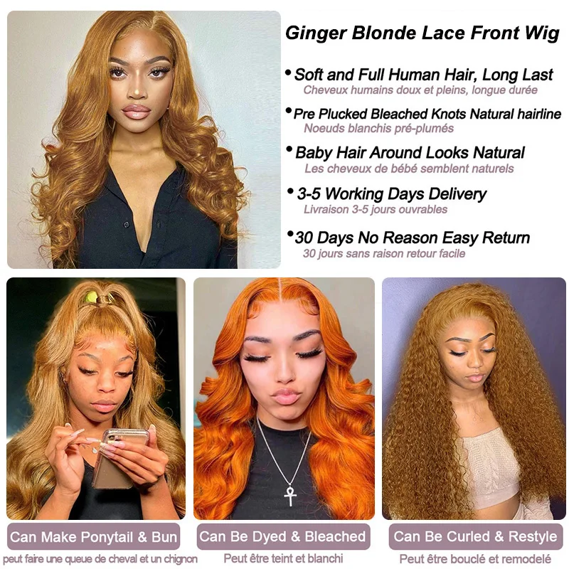 Ginger Brown Lace Front Human Hair Wigs Body Wave 13x6 Lace Frontal Wig For Women #30 Blonde Color Lace Front Wig Remy Hair 34''