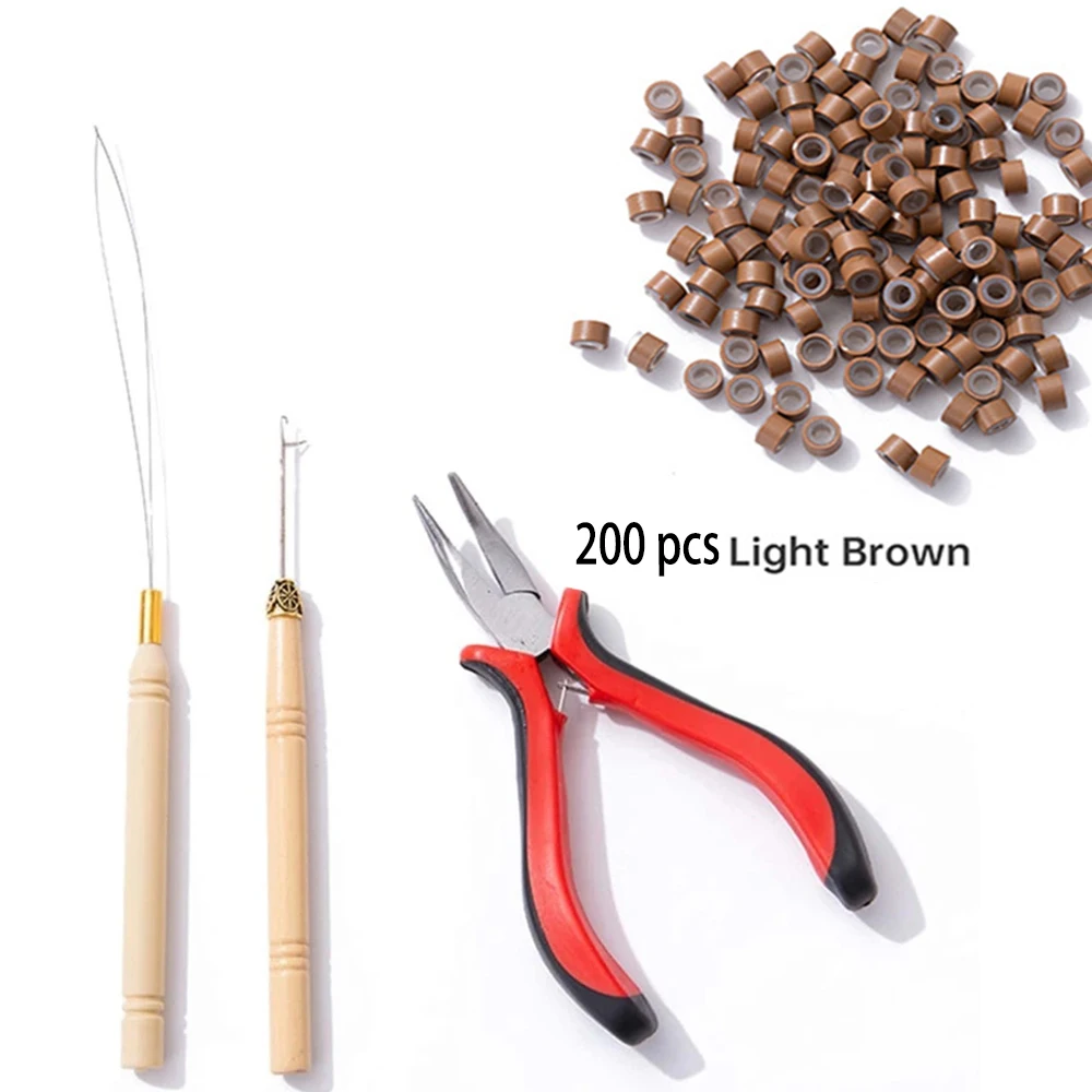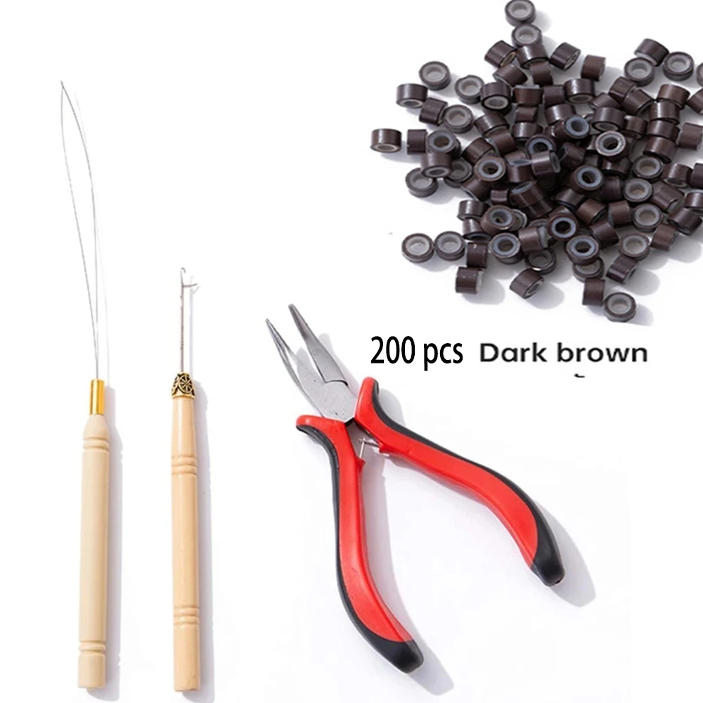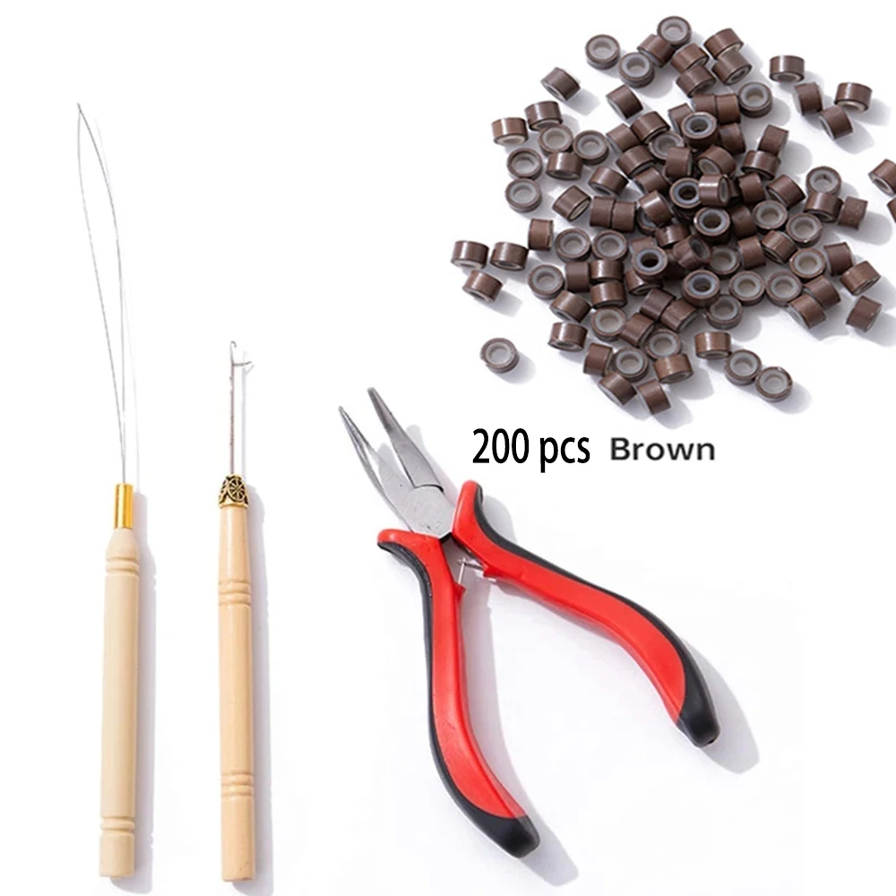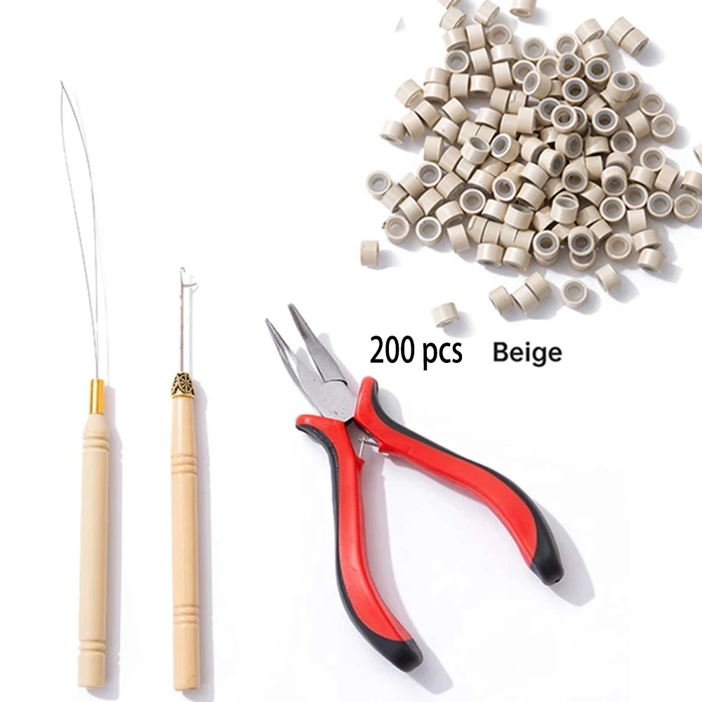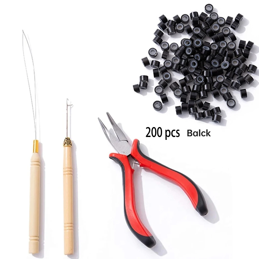 Hair Extension Pliers Pulling Hook 200 Pcs Micro Silicone Rings Bead Device Tool Kits Professional Hair Styling Tools Accessory