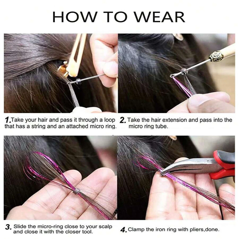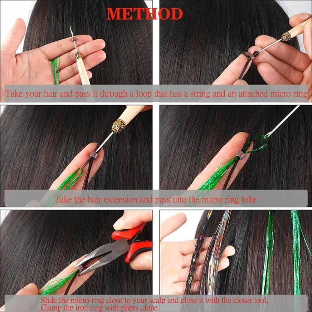 What you get -- Package includes 1 pc pliers + 1 pc pulling hook + 1 pc beads device + 200 pcs silicone micro rings, suitable for a variety of hair products.