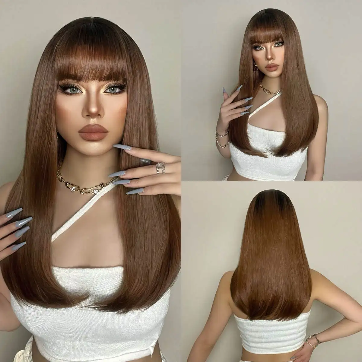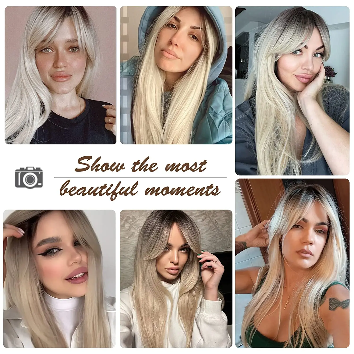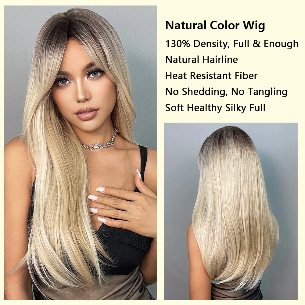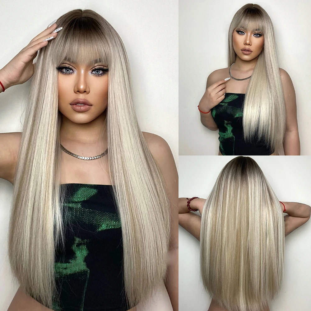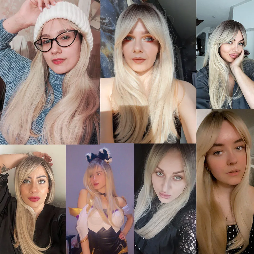 HENRY MARGU Long Blonde White Ombre Synthetic Wig With Bangs Straight Hair Wigs for Women Heat Resistant Cosplay Natural Wigs