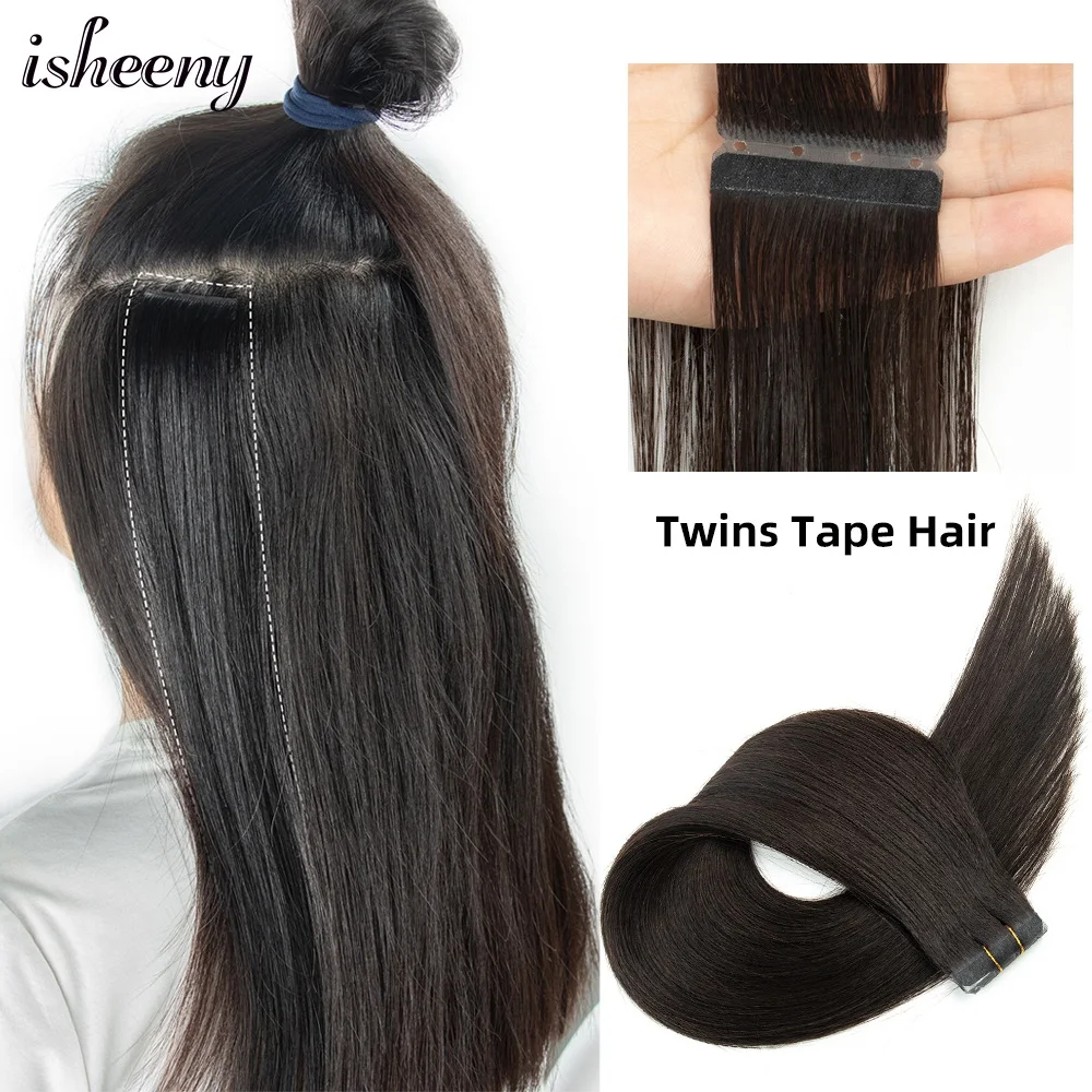 isheeny 16" 20" Twin Tab Weft Hair Extensions Machine Remy Pull Through Hole Tape Hair 10pcs/pack 100% Natural Hair For Women