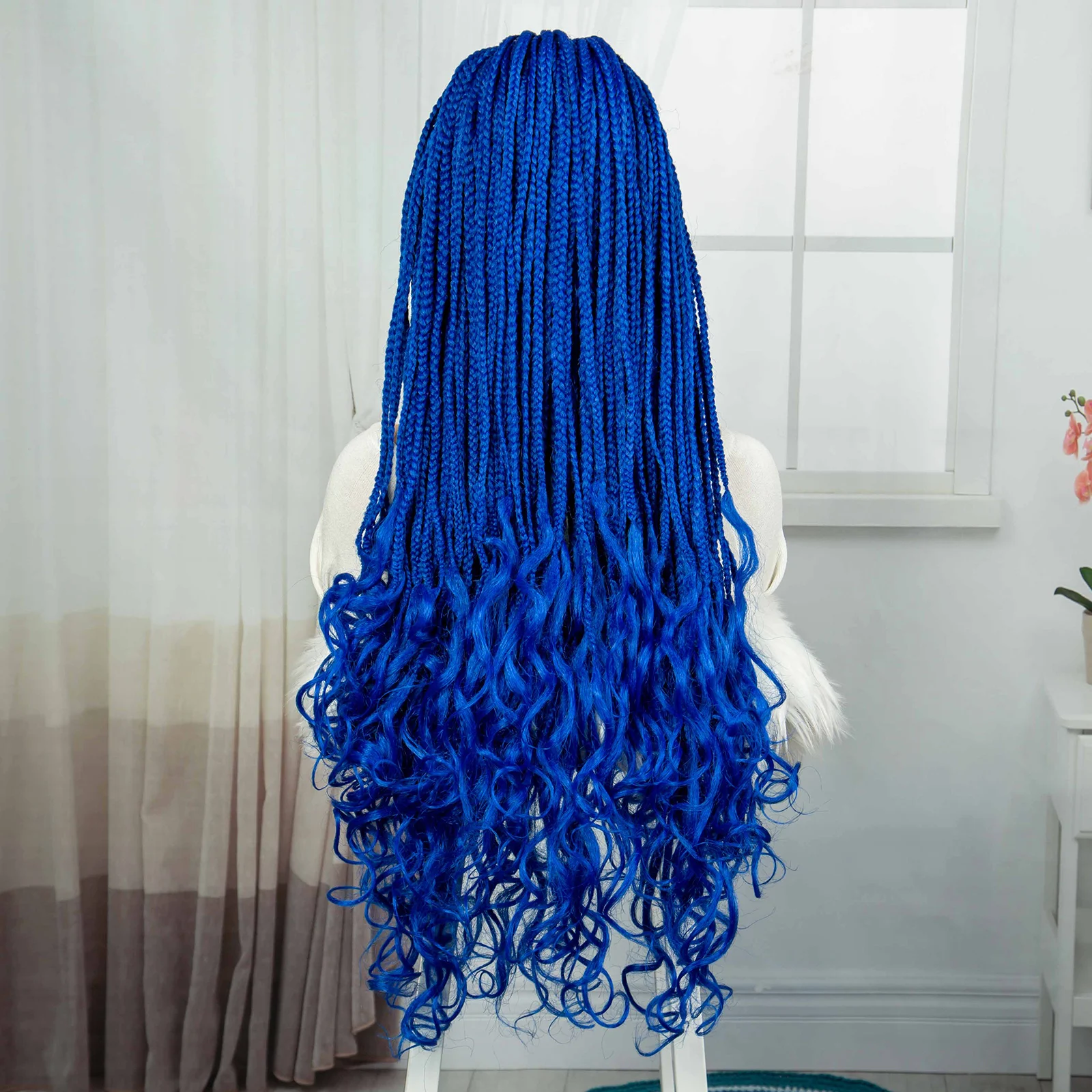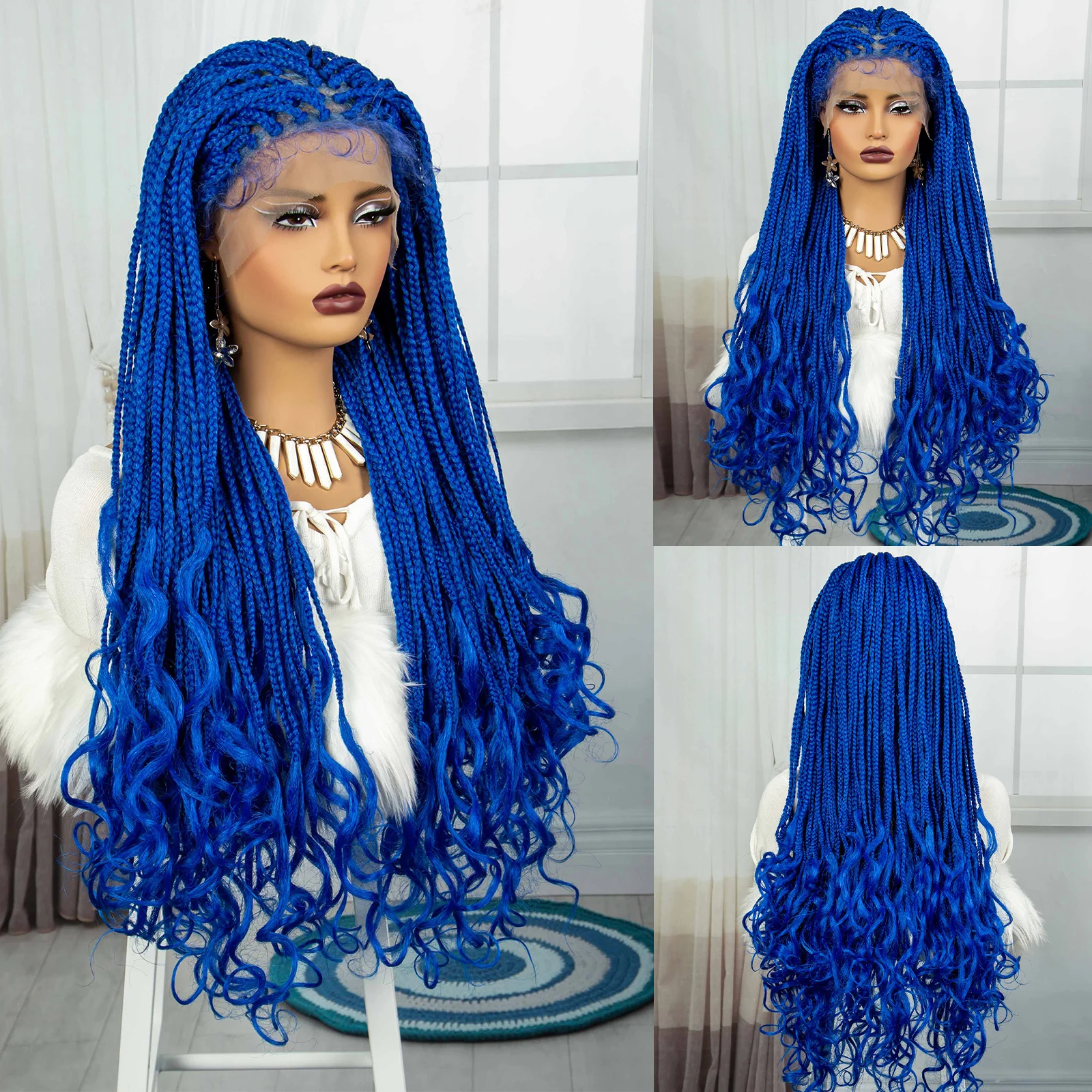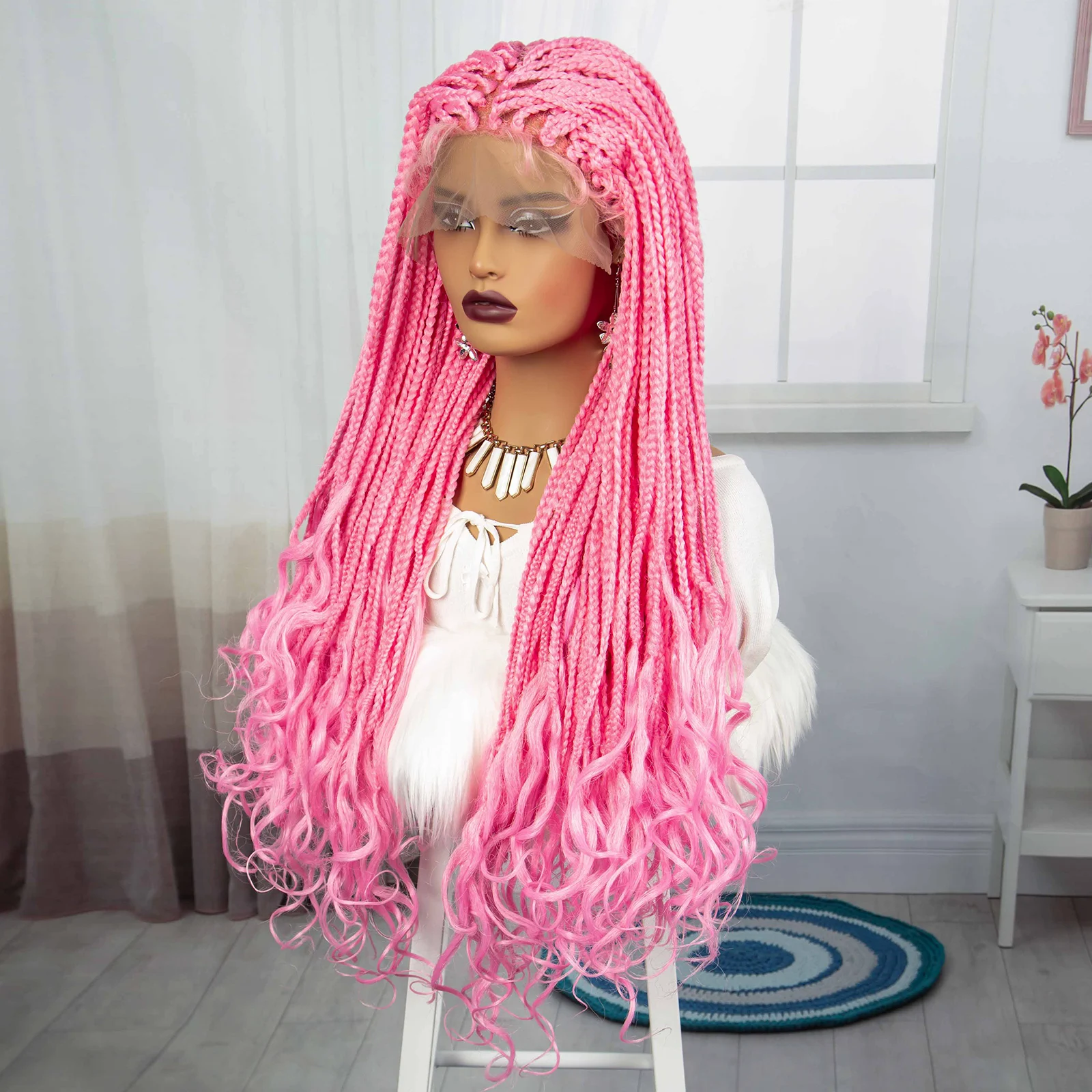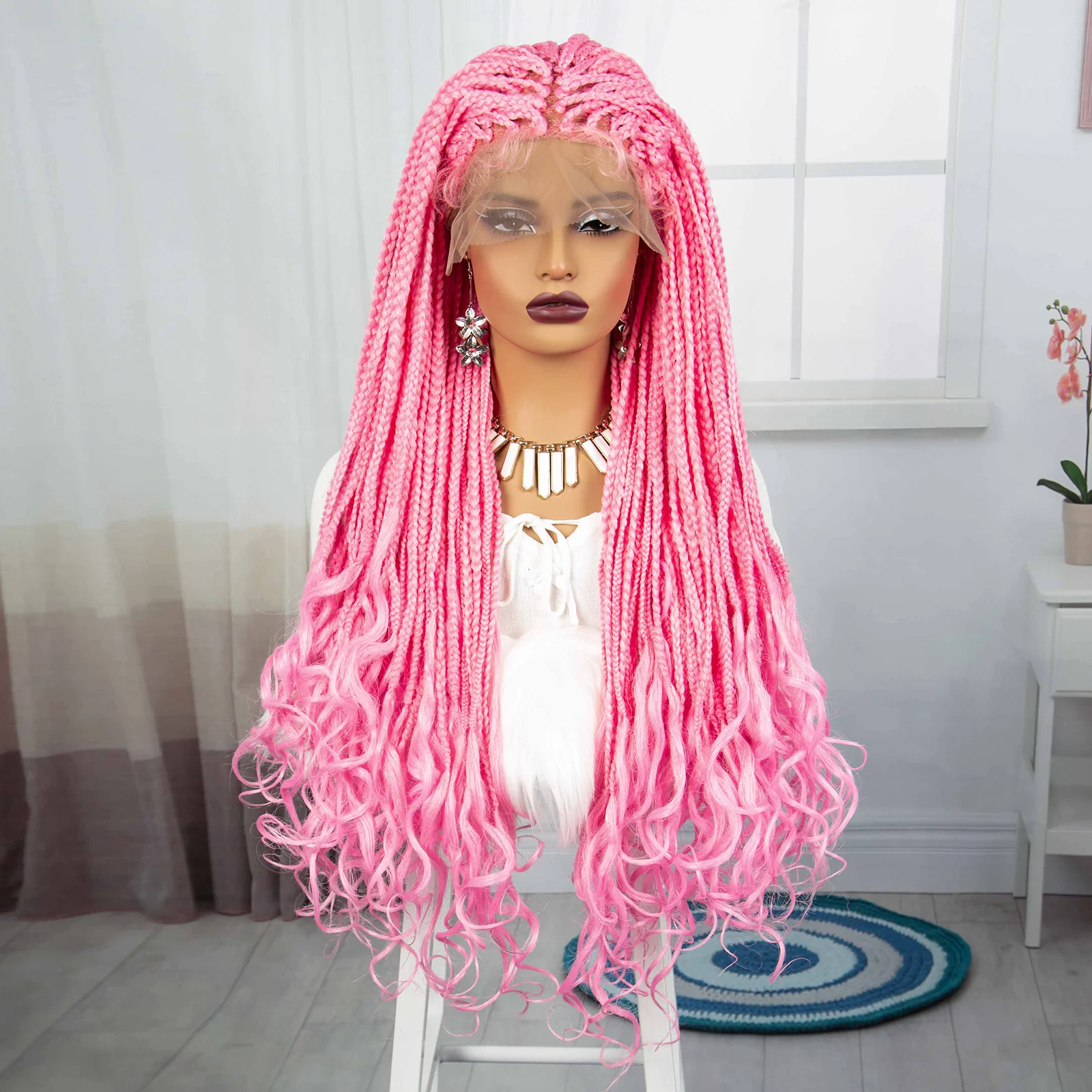 Lace Front Blue Synthetic Braided Wigs Baby Hair Box Braided Wigs for Black Women Pink Braids Wigs End Curly Brazilian Frontal