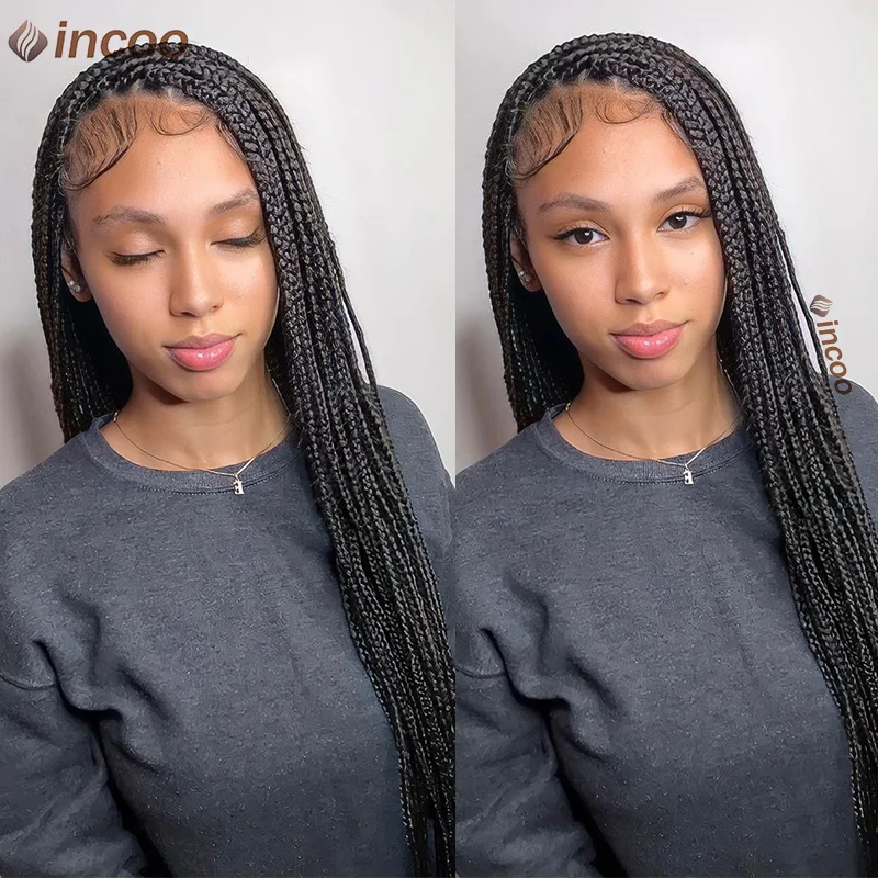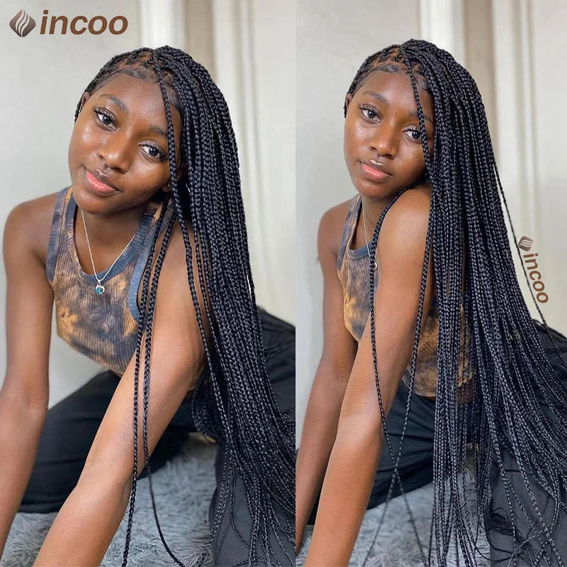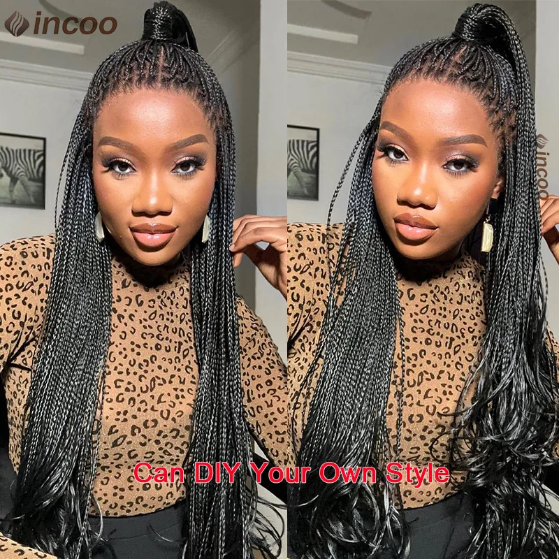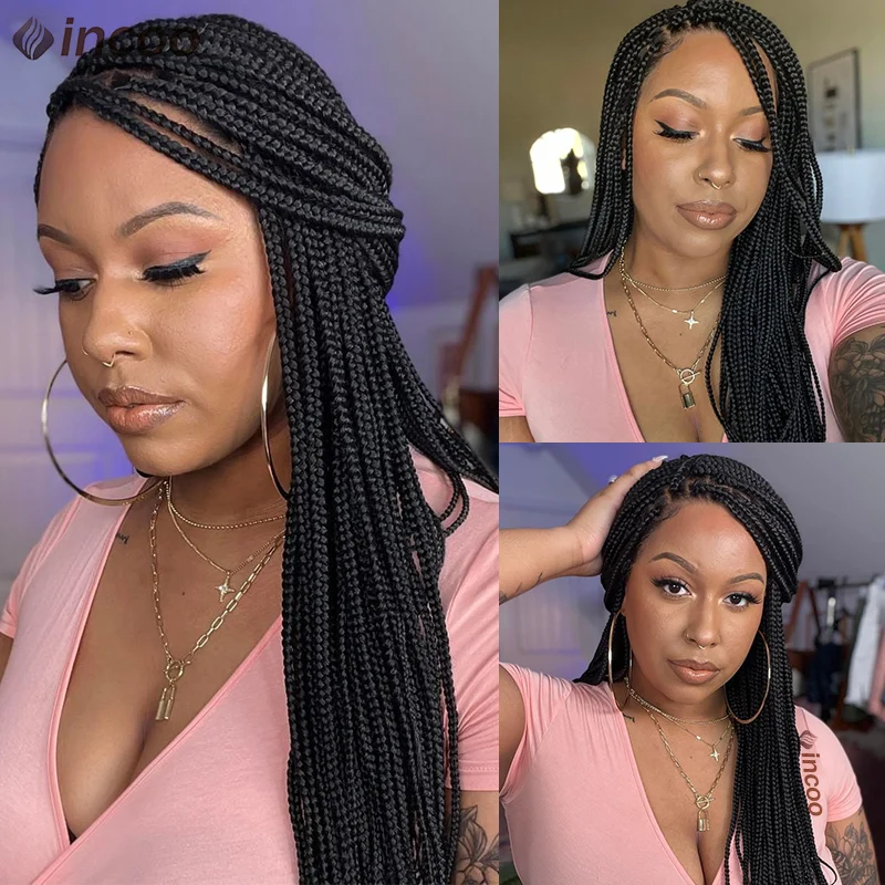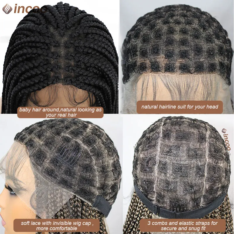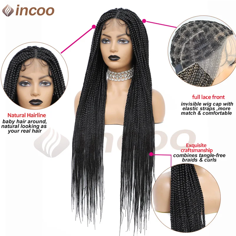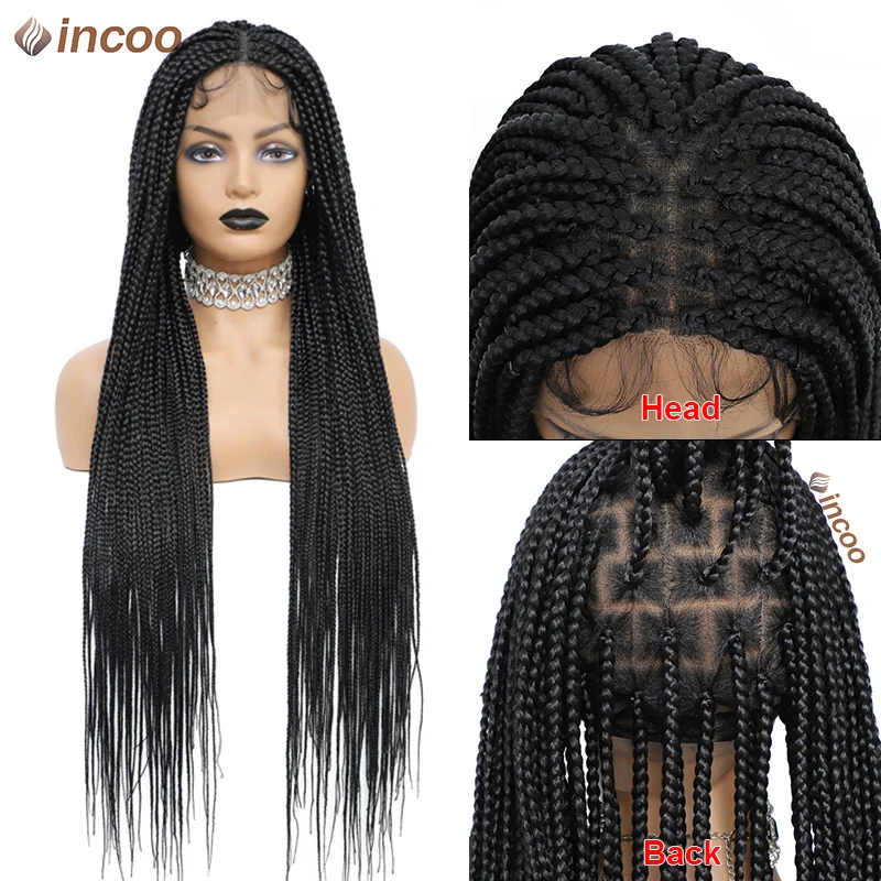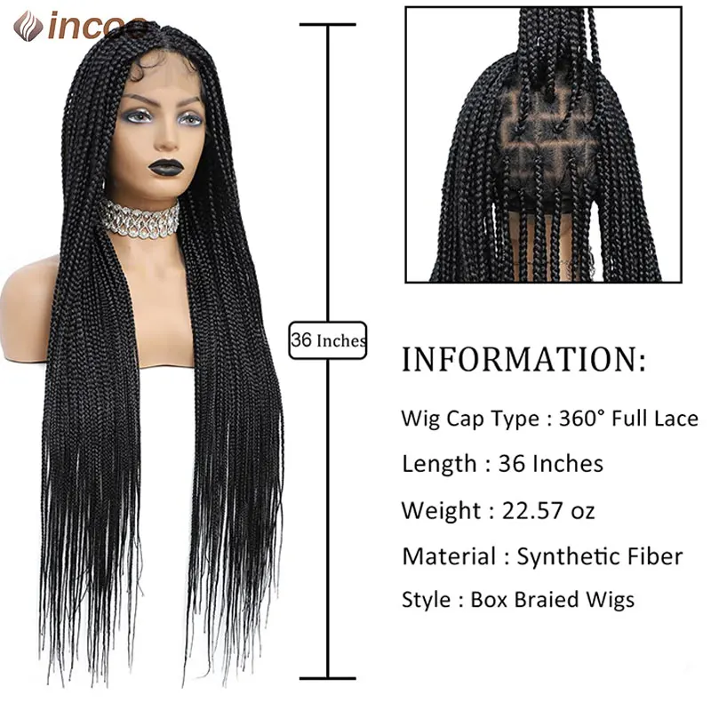Long 36 Inch Full Lace Braided Wig Synthetic Natural Black Three Cornrows Braiding Hair Glueless Square Box Braids Wig For Women