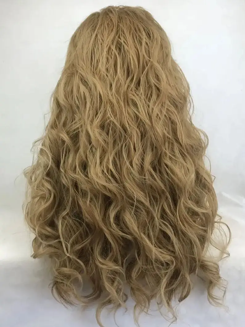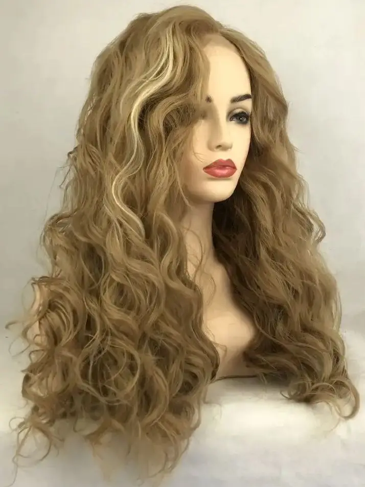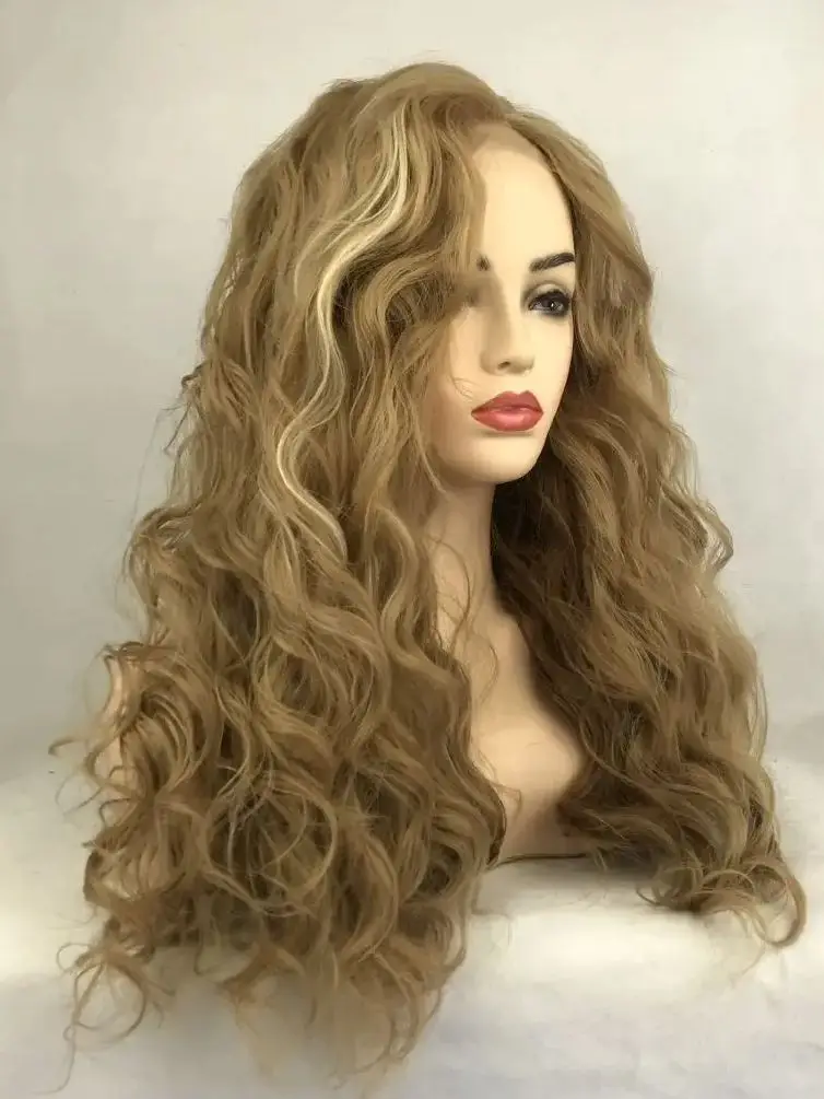Long Brown Curly Transparent Lace Synthetic Hair with Bangs Daily Use Female Wigs