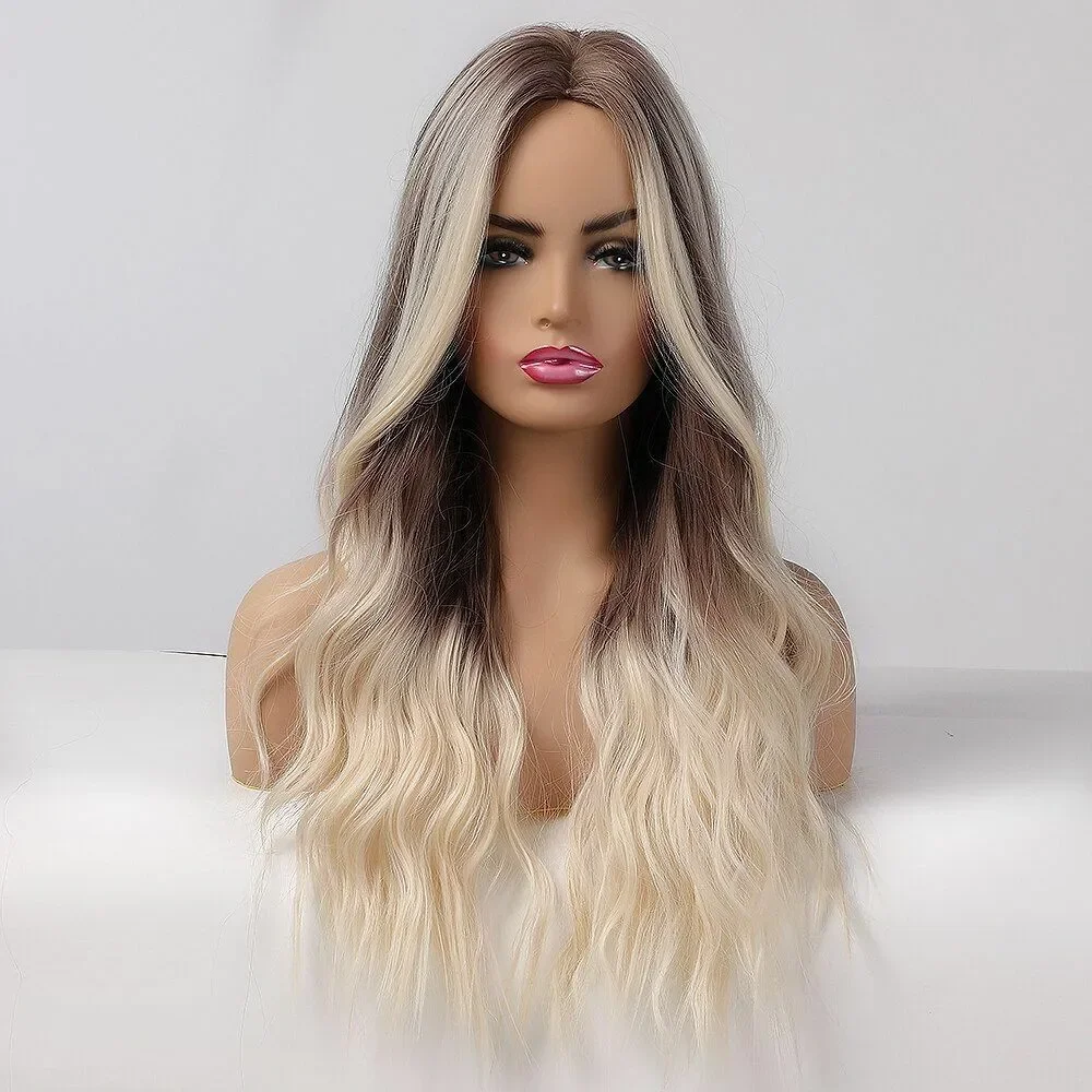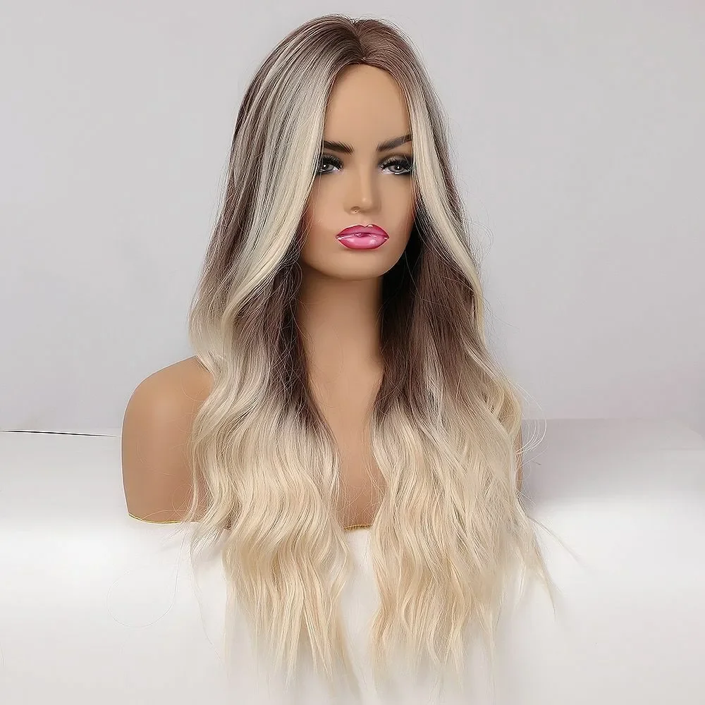 Long Natural Wave Synthetic Wig Ombre Brown Mixed Blonde Women Fake Hair Heat Resistant Fibre wig