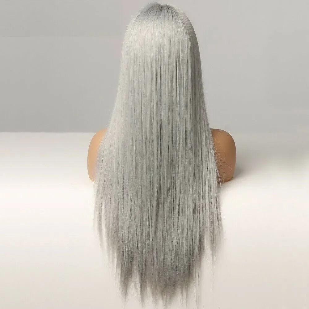 Long Silky Gray Straight Wig Synthetic Bangs Heat Resistant Women Daily Party Hair