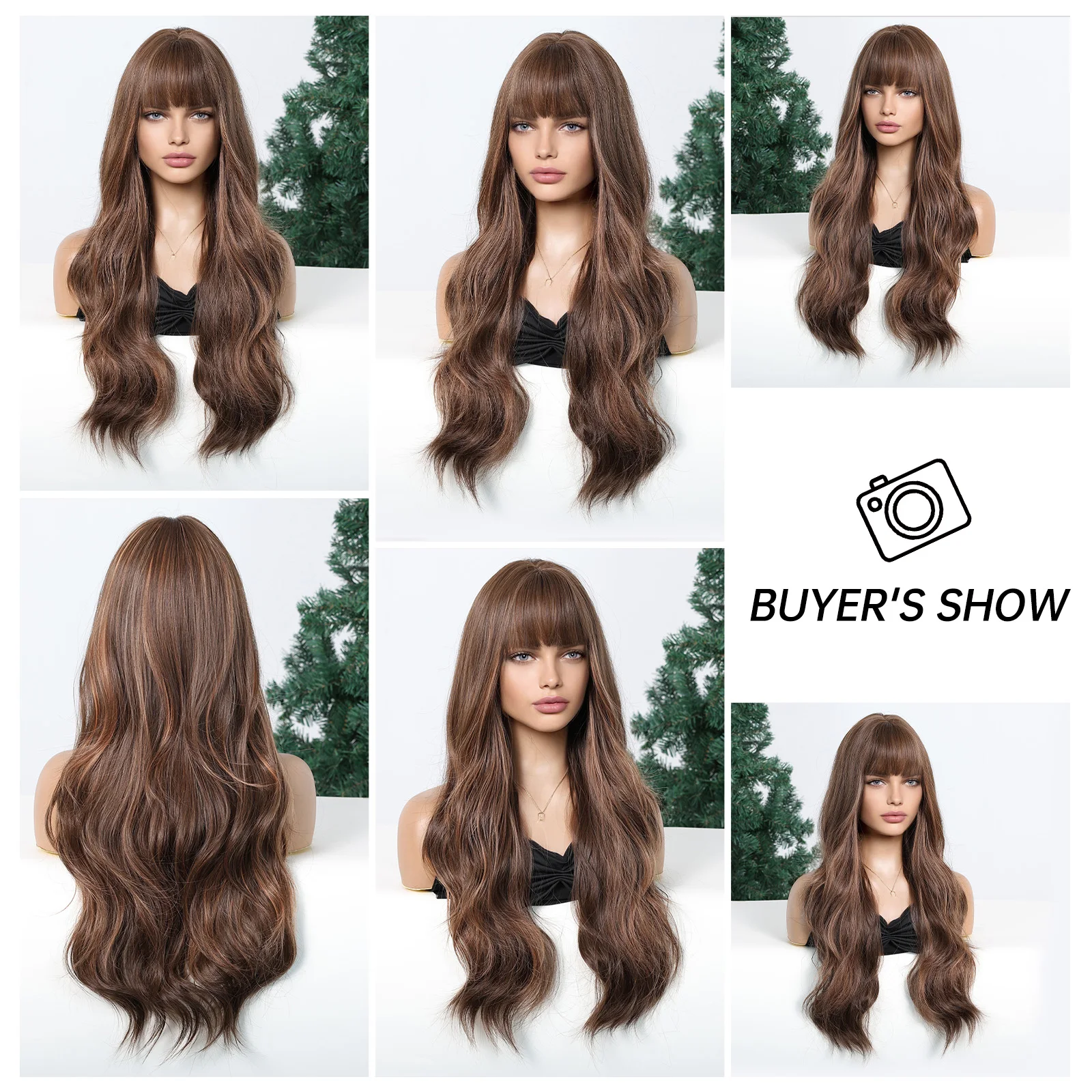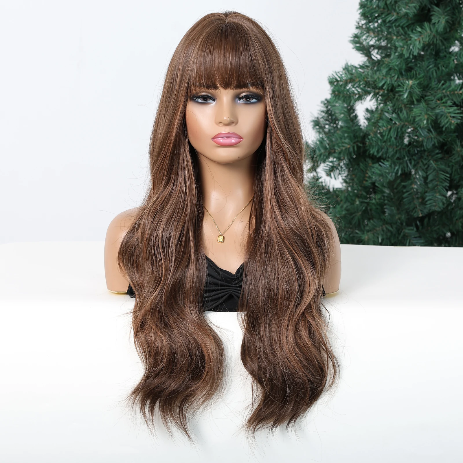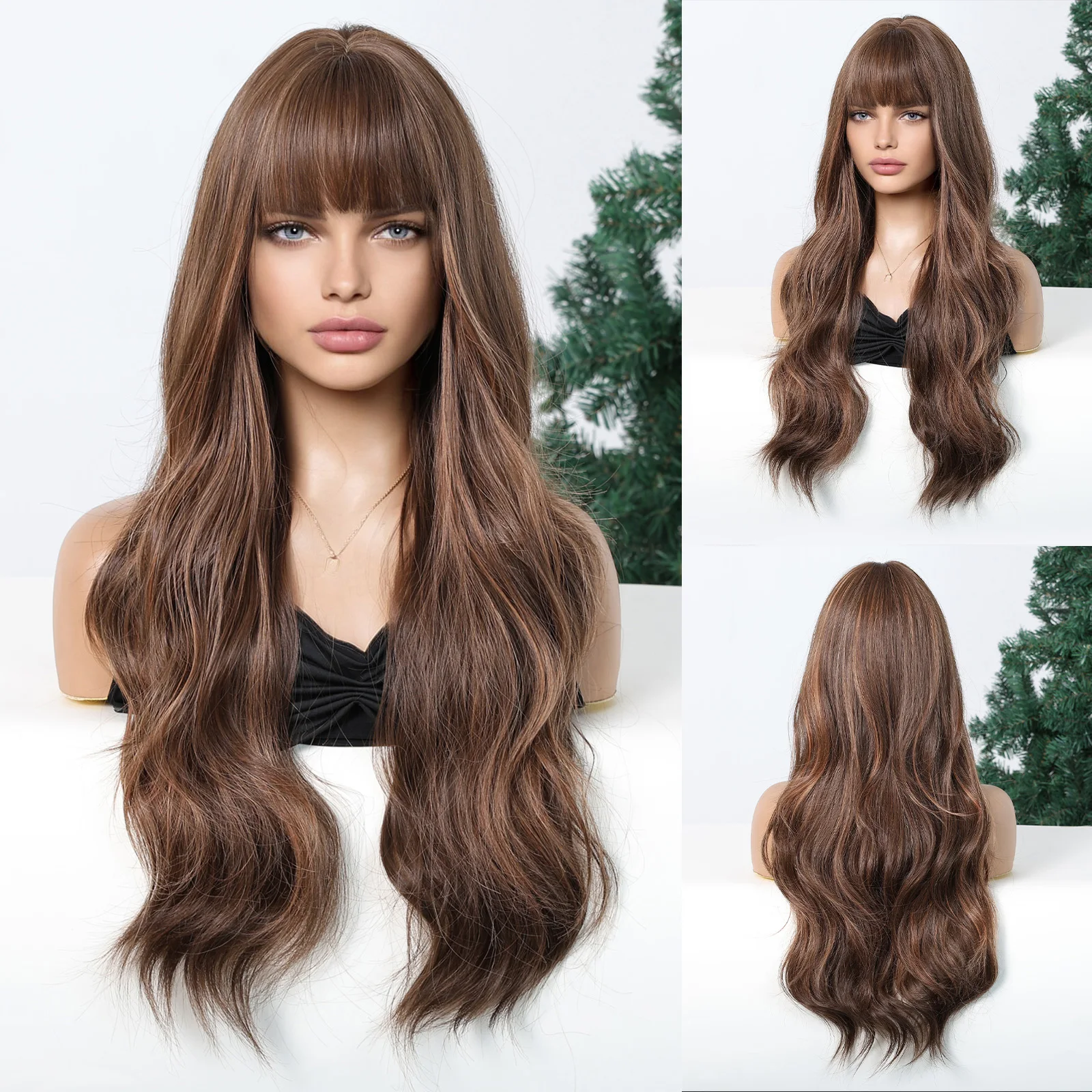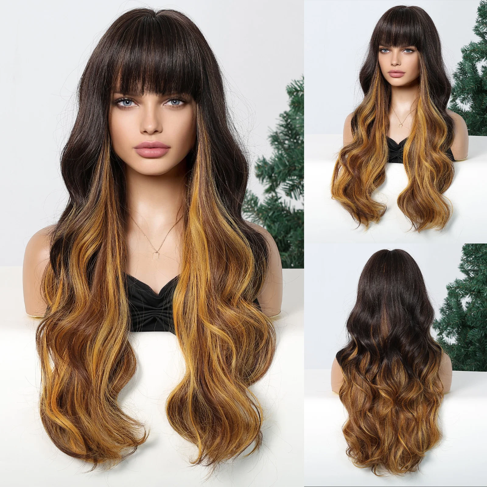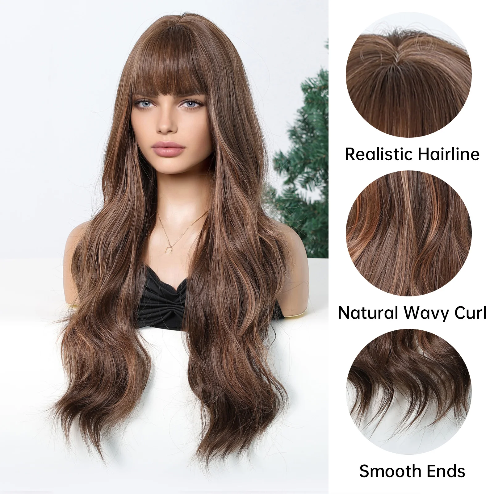 LOUIS FERRE Brown Highlights Wavy Wig With Bangs Long Curly Natural Hair for Women Girls Daily Use Heat Resistant Fiber Wigs