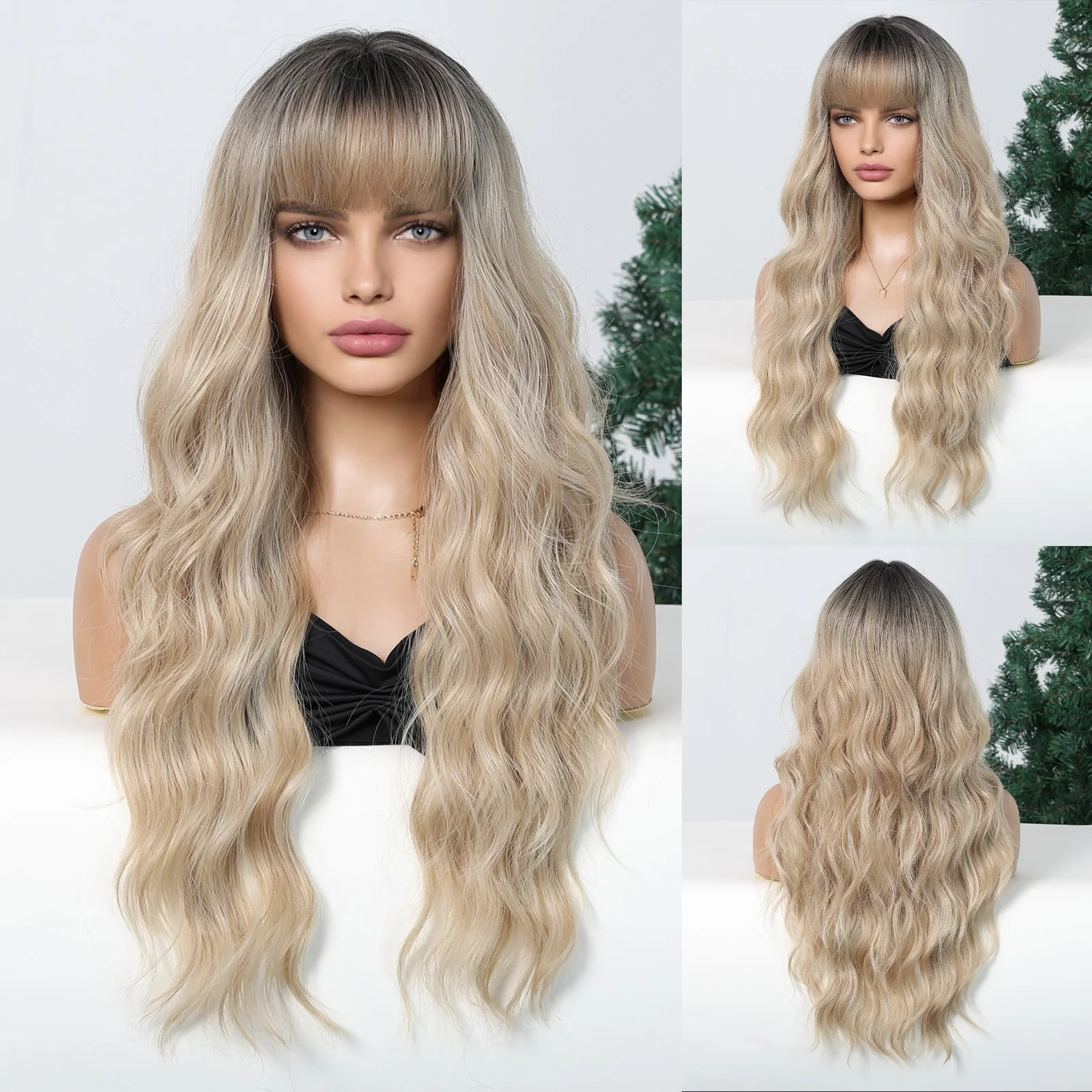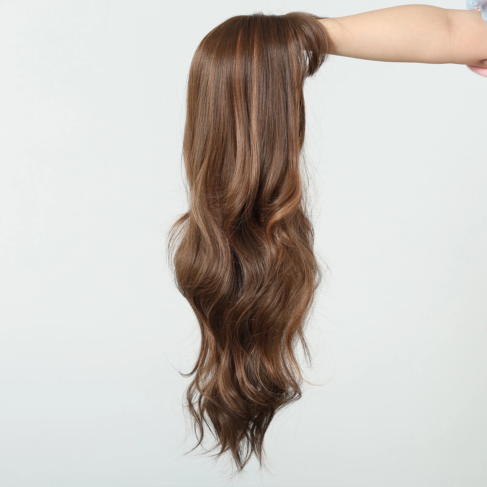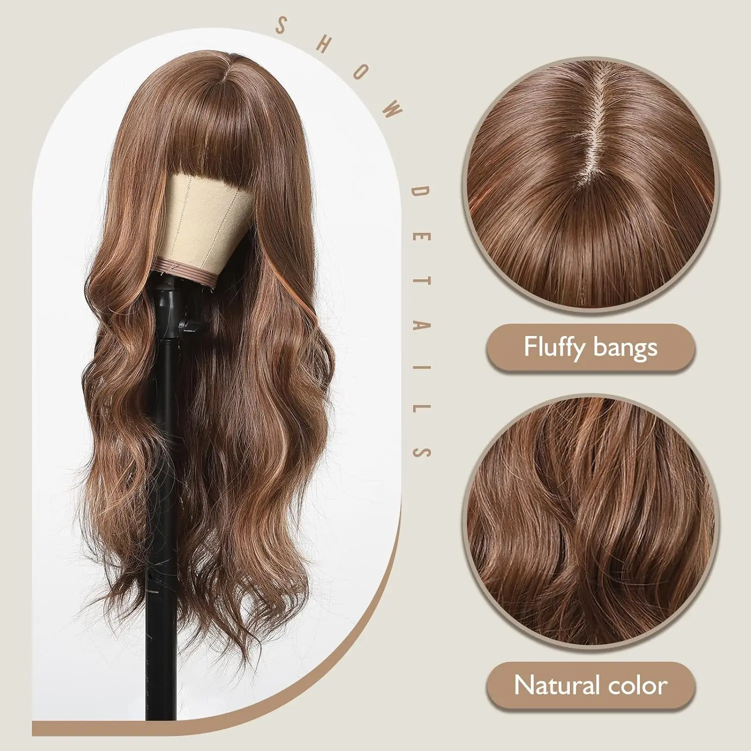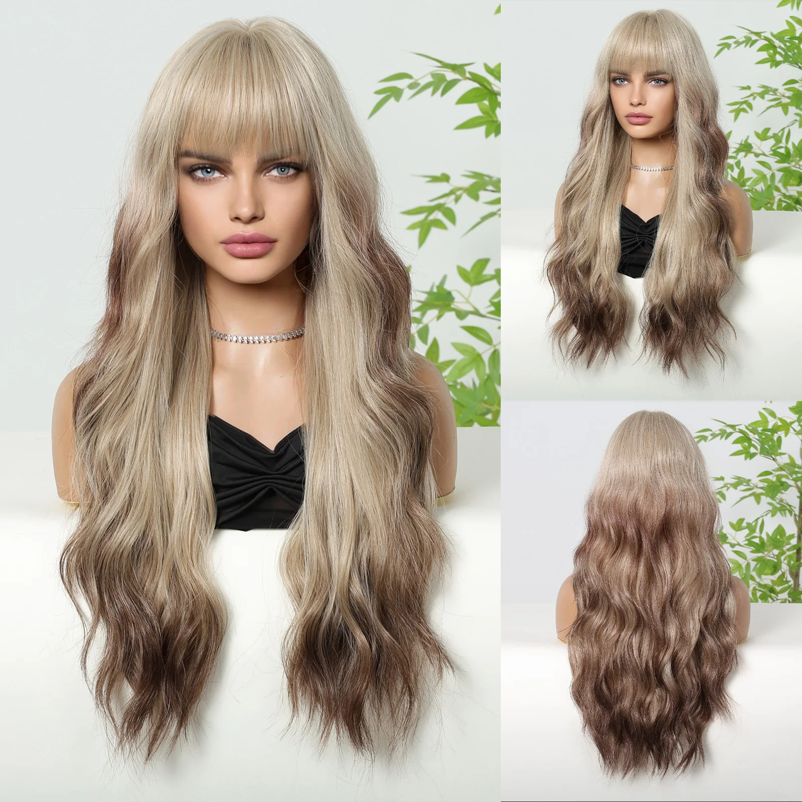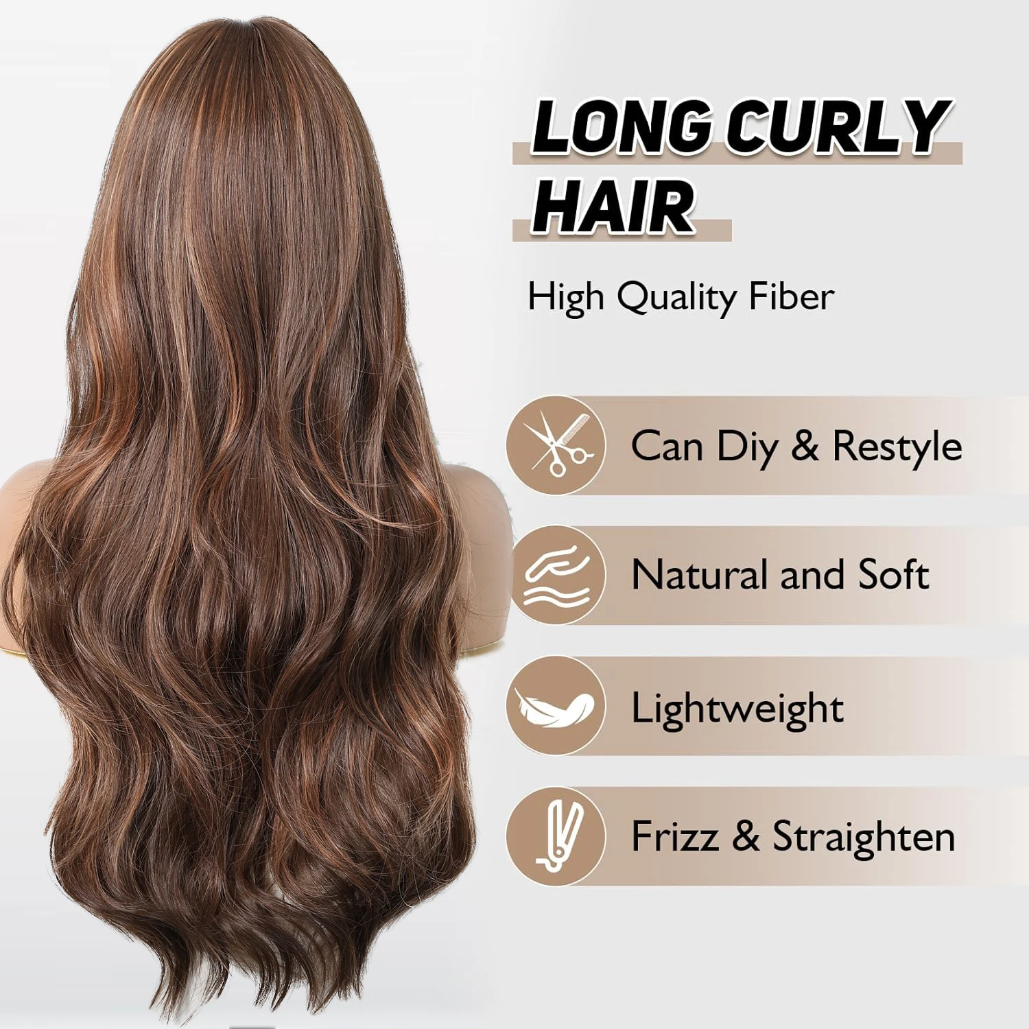 LOUIS FERRE Brown Highlights Wavy Wig With Bangs Long Curly Natural Hair for Women Girls Daily Use Heat Resistant Fiber Wigs