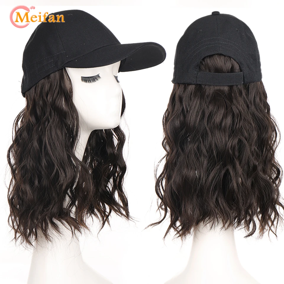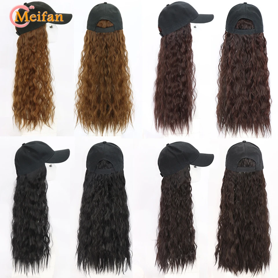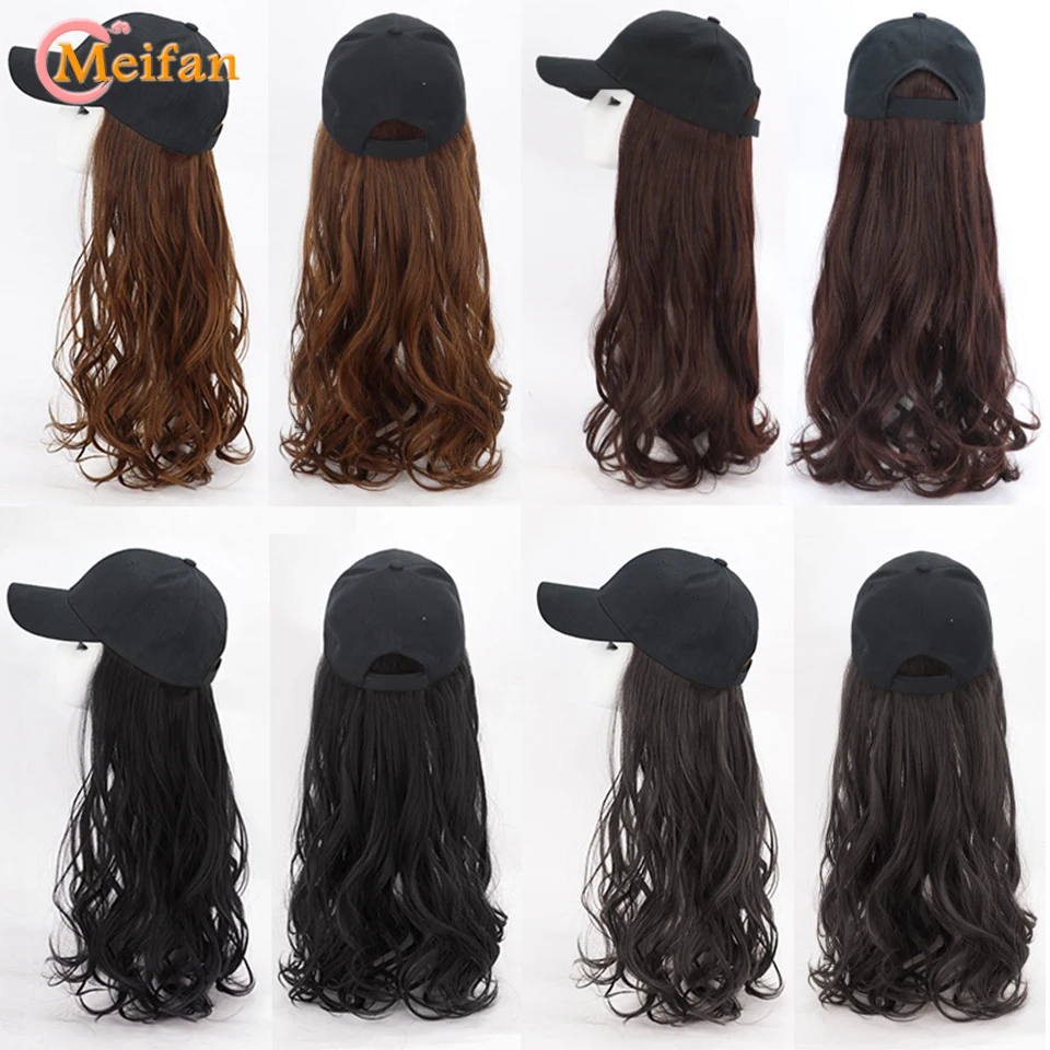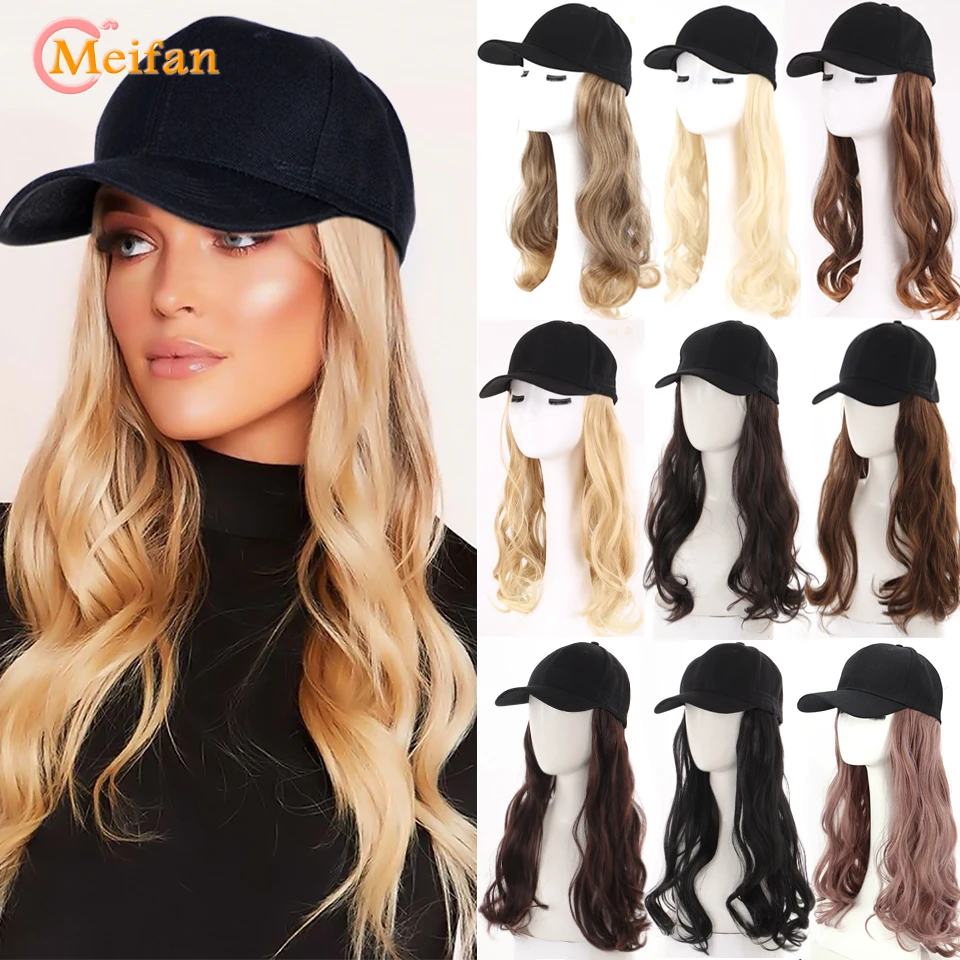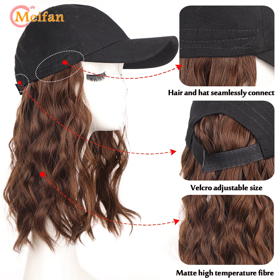 MEIFAN Long Synthetic Fluffy Natural Wave Wavy Curly Hair Wigs with Hat Baseball Cap Naturally Connect Adjustable Hat Wig