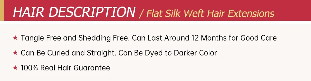 HOW TO INSTALL FLAT SILK WEFT1. Attaching your weft with clips 1). Part your hair and make a section. 2). Measure and cut the weft to the length of the hair section. 3). Fix the clips on the weft. 4). Put the weft with clips on your own hair. 2. Attaching your hair weft with glue 1). Part your hair and make a section. 2). Measure and cut the weft to the length of the hair section. 3). Attach the ends of the weft by sealing off the edges with glue or needle and thread to prevent the hair from fall off the weft. 4). Apply glue on the upper edge of the weft and along the section of your natural hair closest to the scalp. 5). Press the extensions against the glue in your natural hair. Hold until the glue is dried and the hair piece sits securely. 3.Attaching your weft with microrings 1). Create a horizontal part. 2). Measure and cut the weft to the length of the parted section. 3). Use hair clips to secure the cut piece to your natural hair. 4). Place a microring on the needle and open the hook. 5). Grasp a section of your natural hair and a section of the weft with the hook. 6). Squeeze the microring firmly with the pliers, pressing hard until it is nearly flat. 4. Weaving – Sewing in your hair weft 1). Part your hair and make a section. 2). Use the hair in this section to create a tightly braided braid. 3). Begin at one edge and braid to the middle. 4). Measure and cut the hair weft so that the piece fits the length of the entire part you created. 5). Attach the ends of the weft using a needle and thread to prevent the hair from dropping from the weft. 6). Thread a bent needle and gently sew the hairline on the entire length of the braid. 7). Thoroughly secure the ends of the weft.