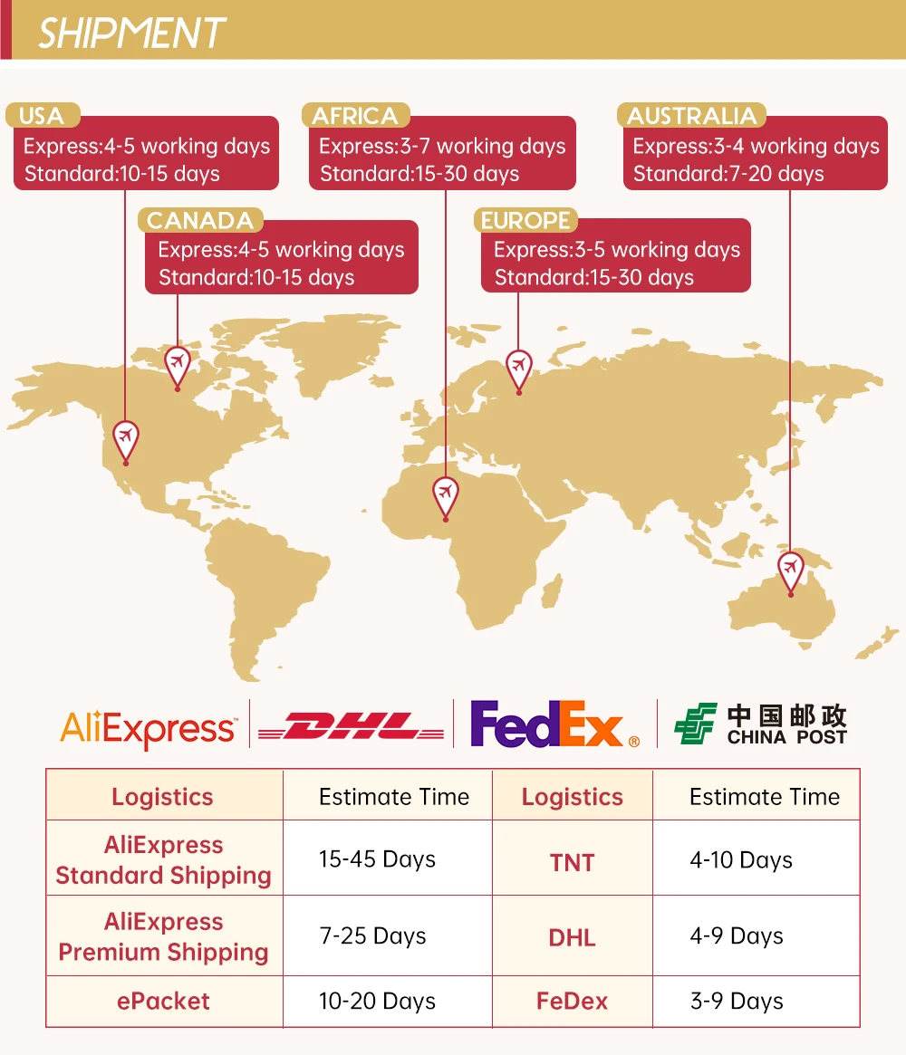 7.Shipping Terms: Ship via Post Office, DHL, FeDex, Aliexpress Shipping