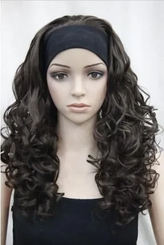 New 3/4 wig with headband Long dark brown curly/wavy women's half hair wig