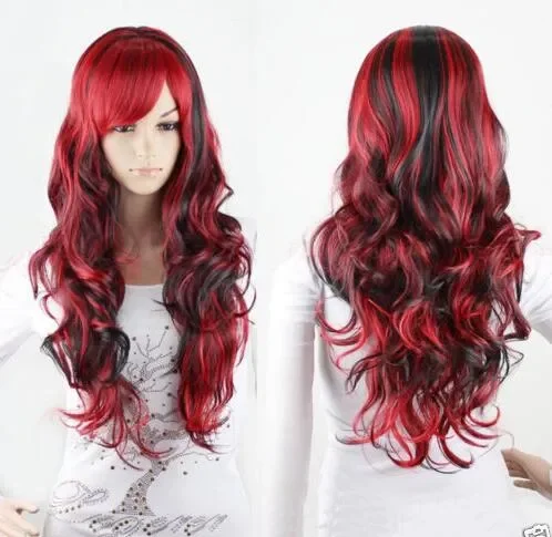 New Cosplay Black Mix Red Wig Long Wavy Curly Hair Women Wig