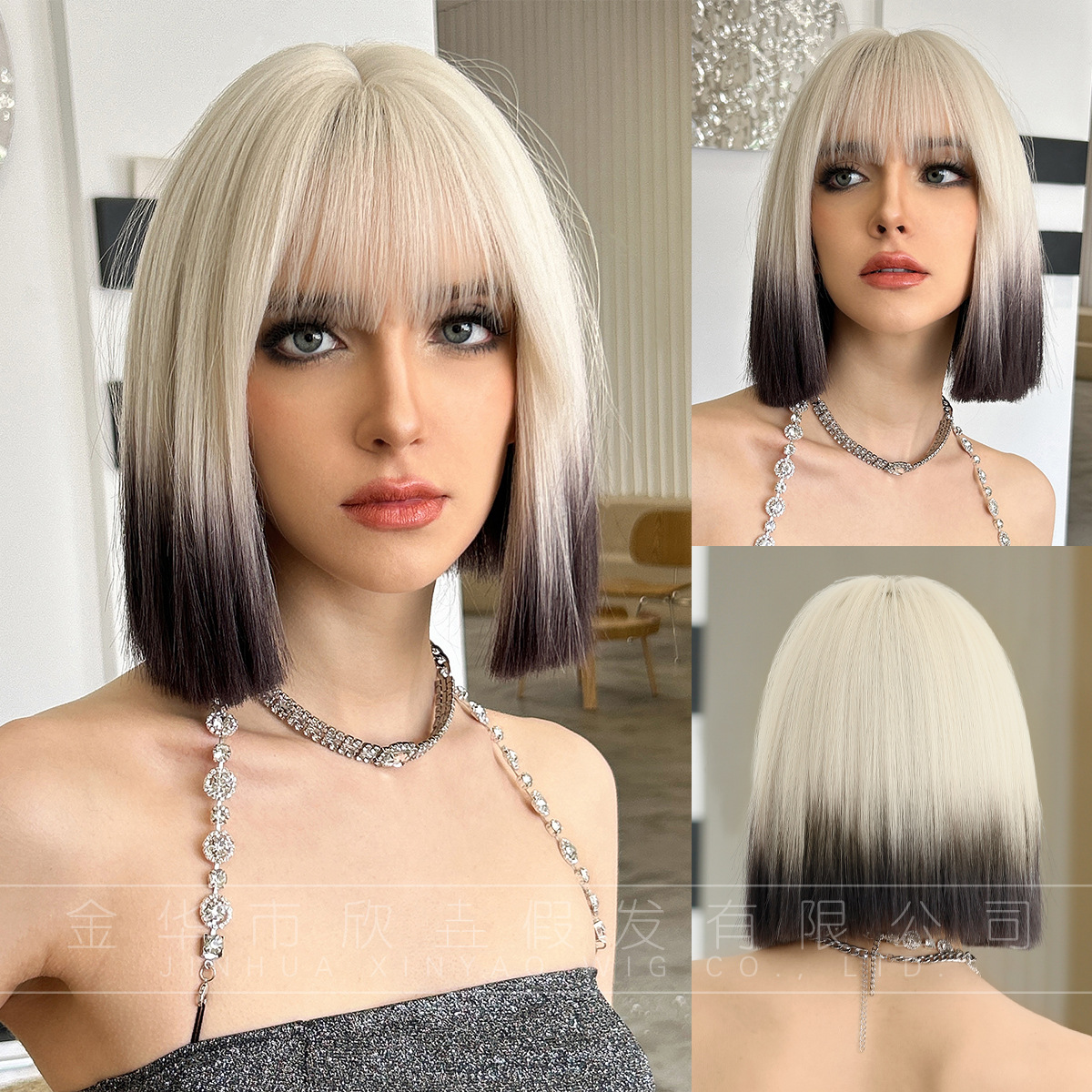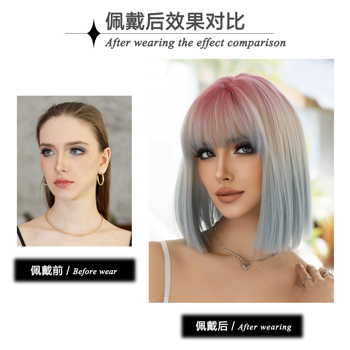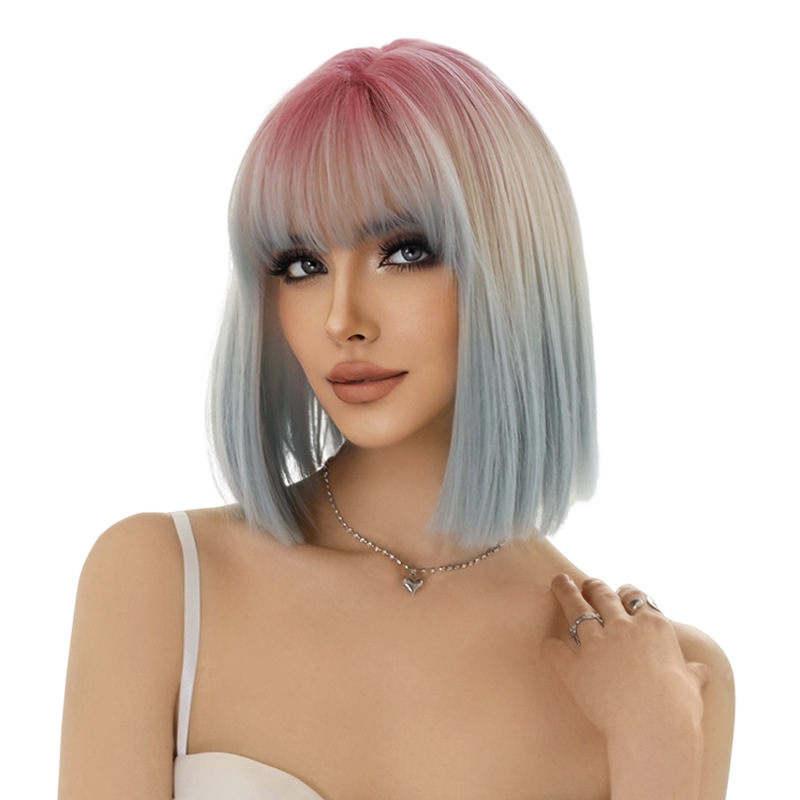 New Short Bob Pink Gradient Blue Straight Wig Women's Air Bang Hair Full Wig