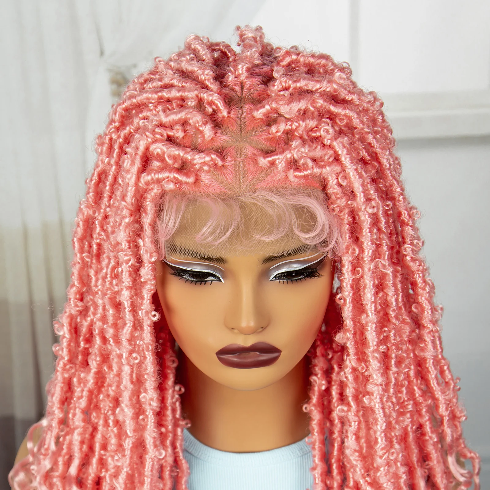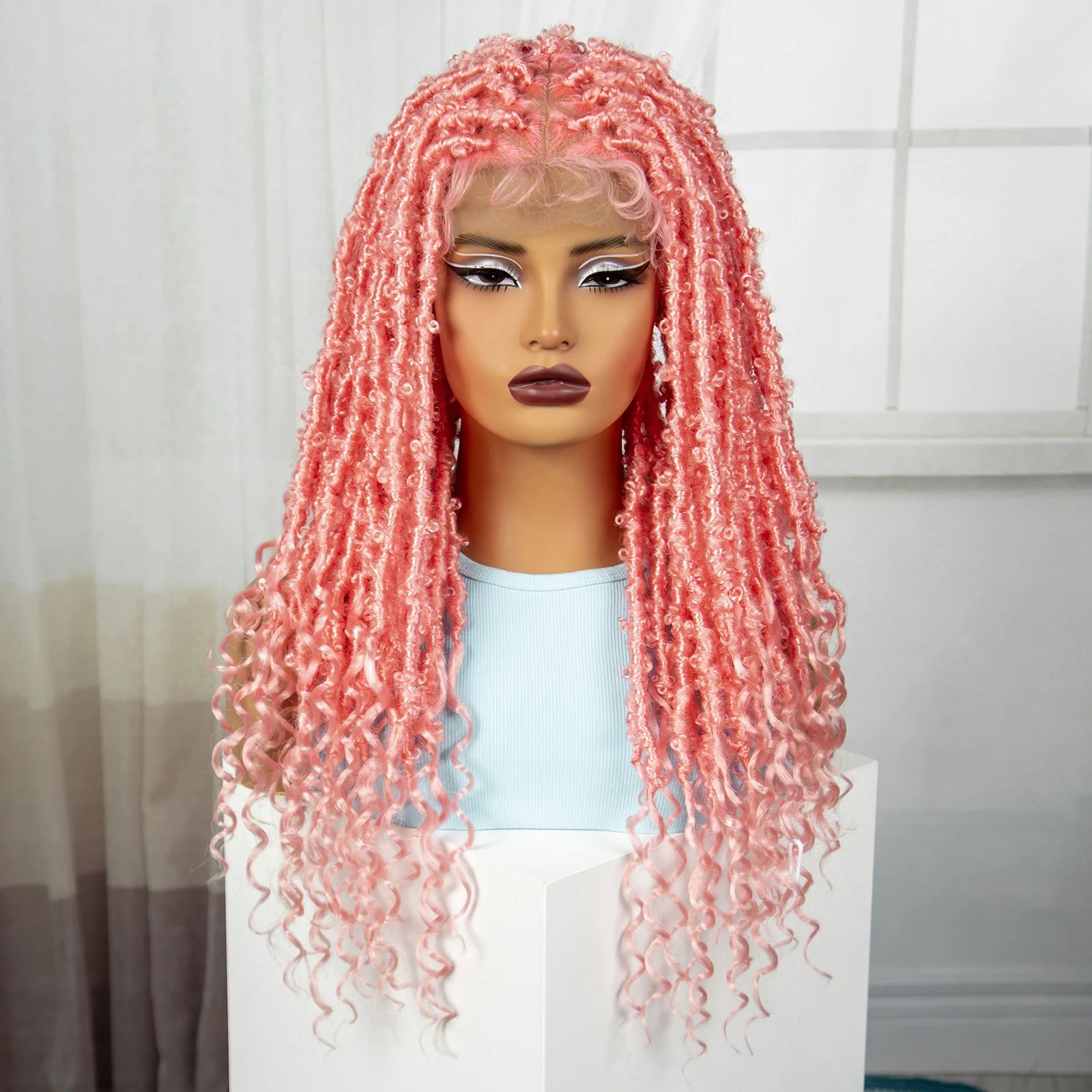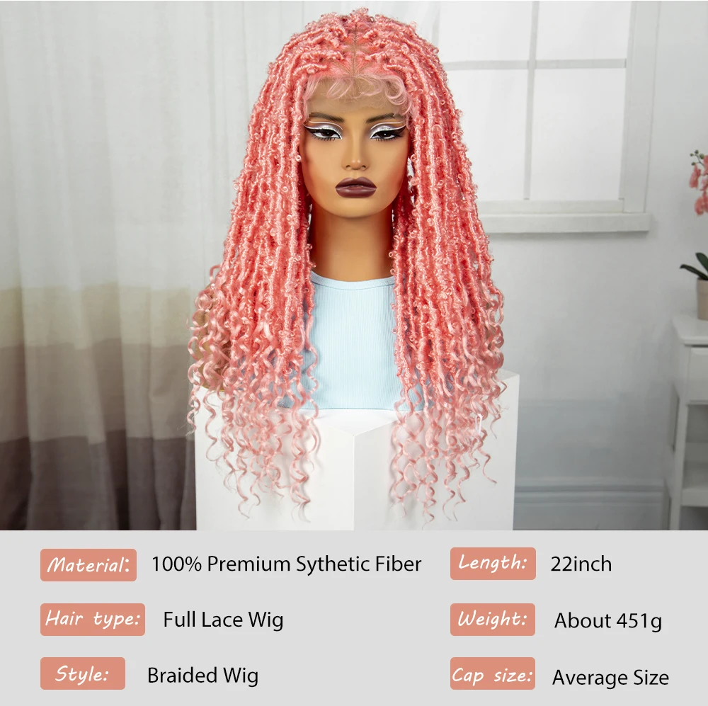 Pink 22 Inch Synthetic Braided Wigs Transparent Full Lace Braided Wigs with Curly Ends Knotless Box Braids Wigs with Baby Hair