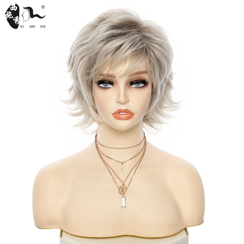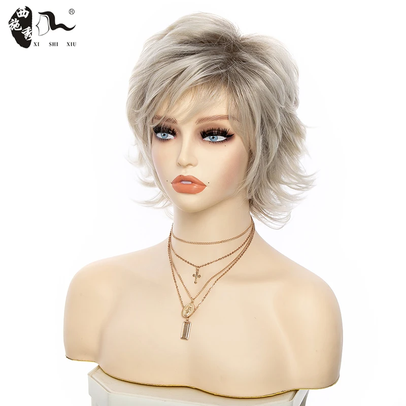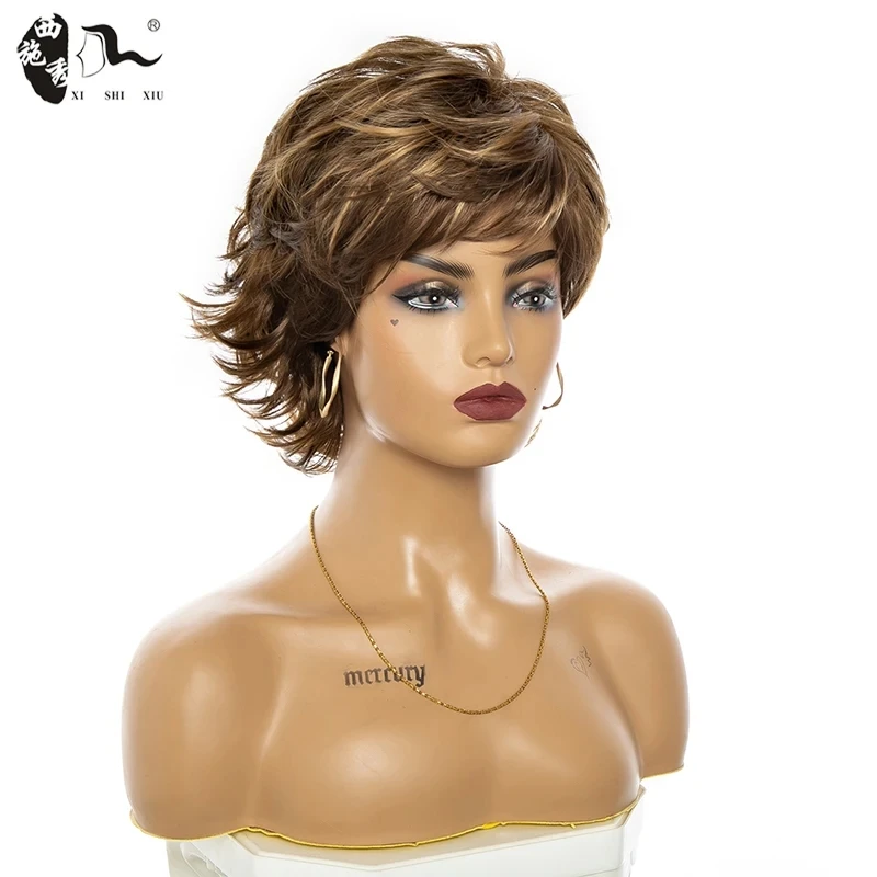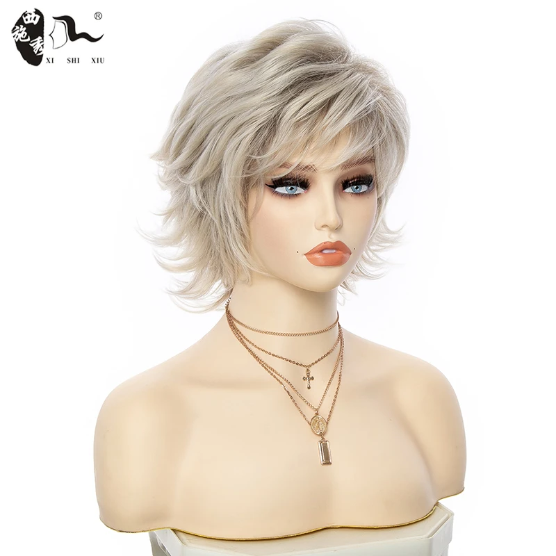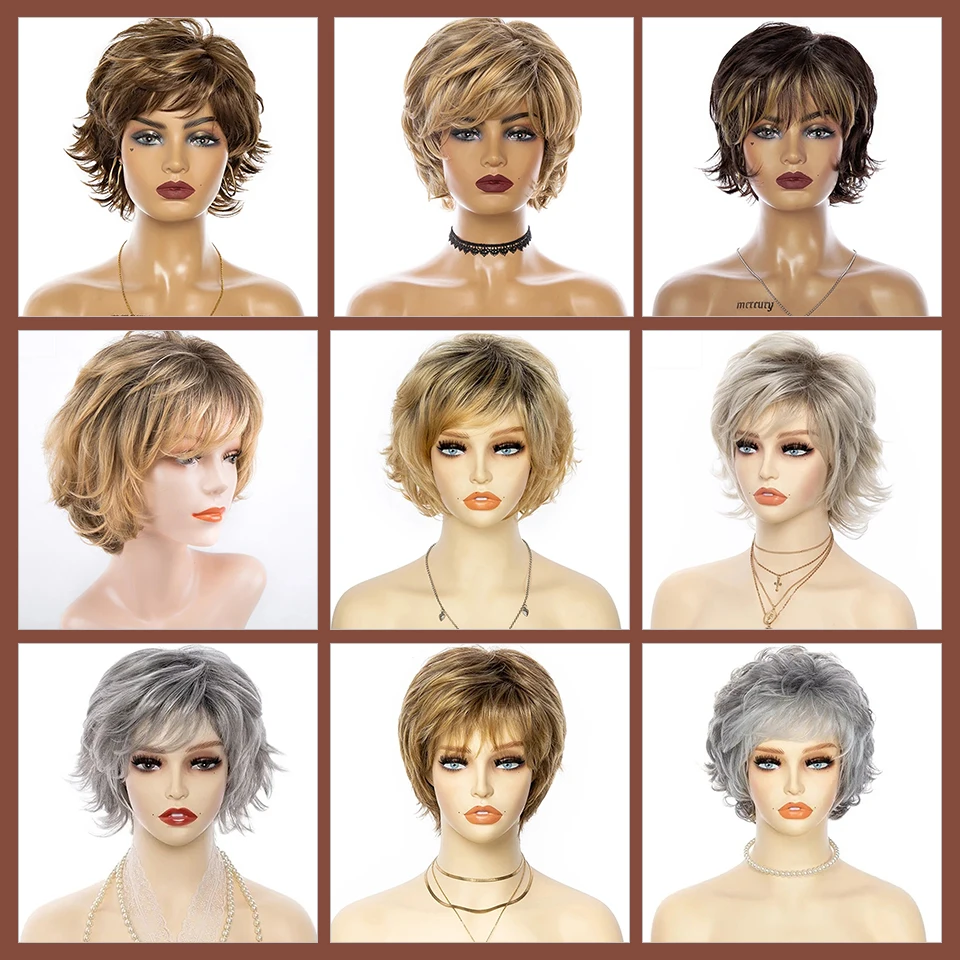 Short Blonde Hair Natural Wave Layered Hair Pixie Cut Synthetic Wigs With Fluffy Bangs For Women Heat Resistant Fiber Daily Wigs