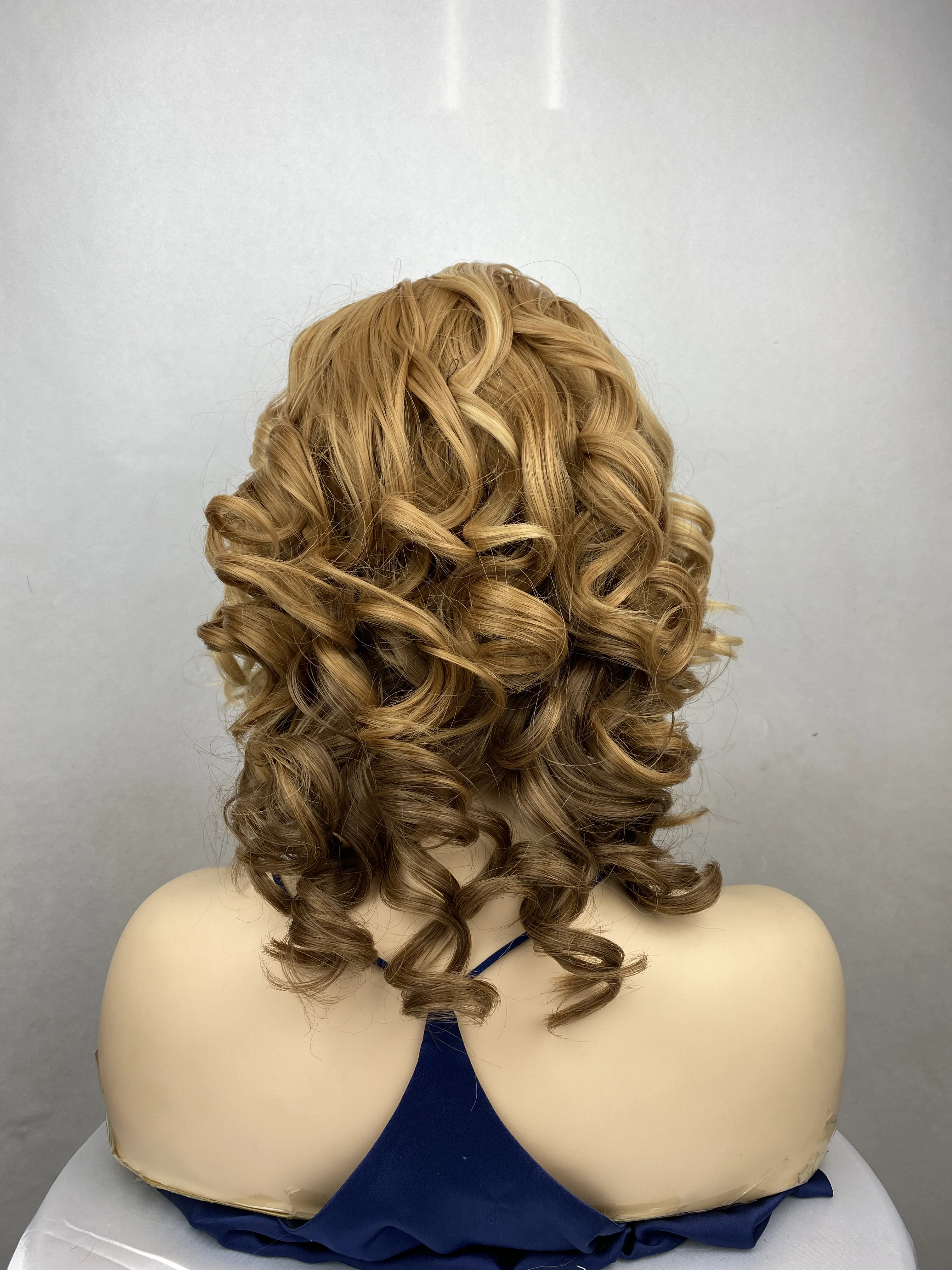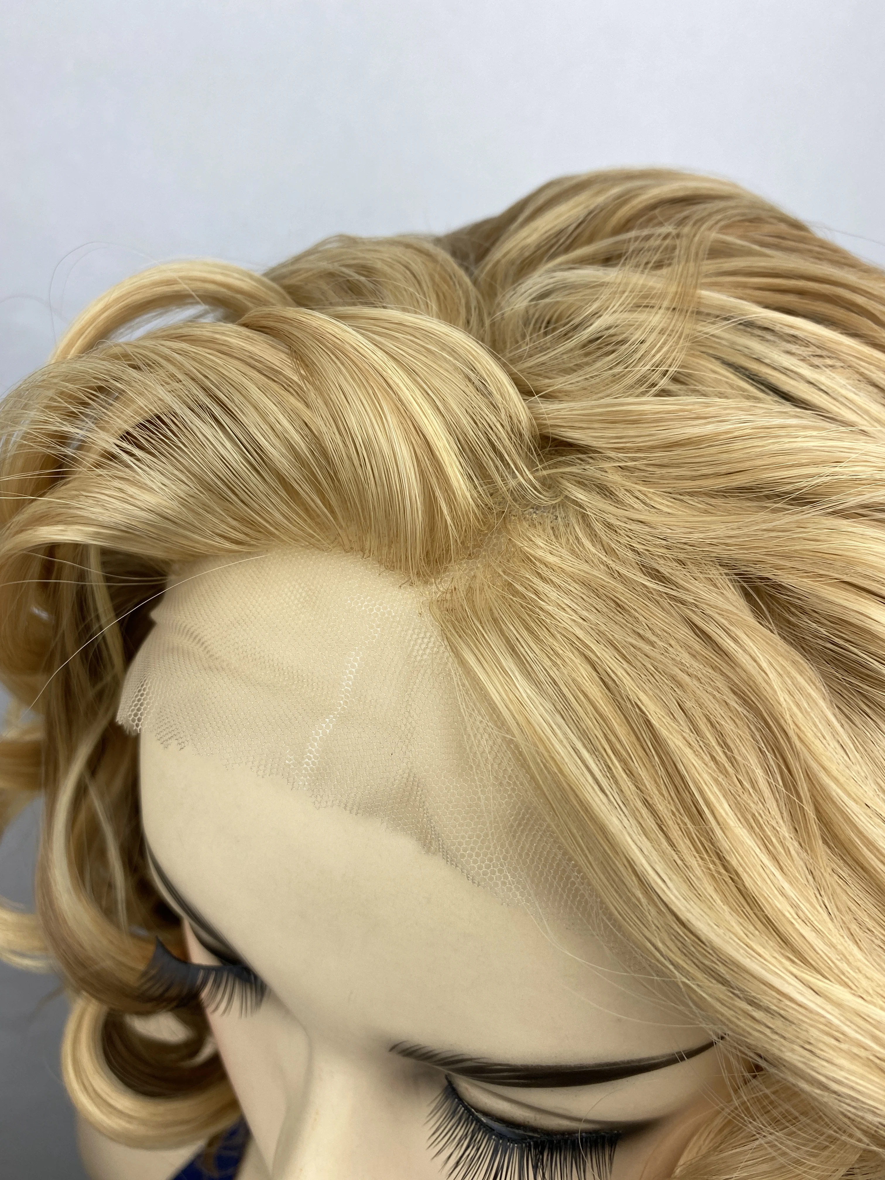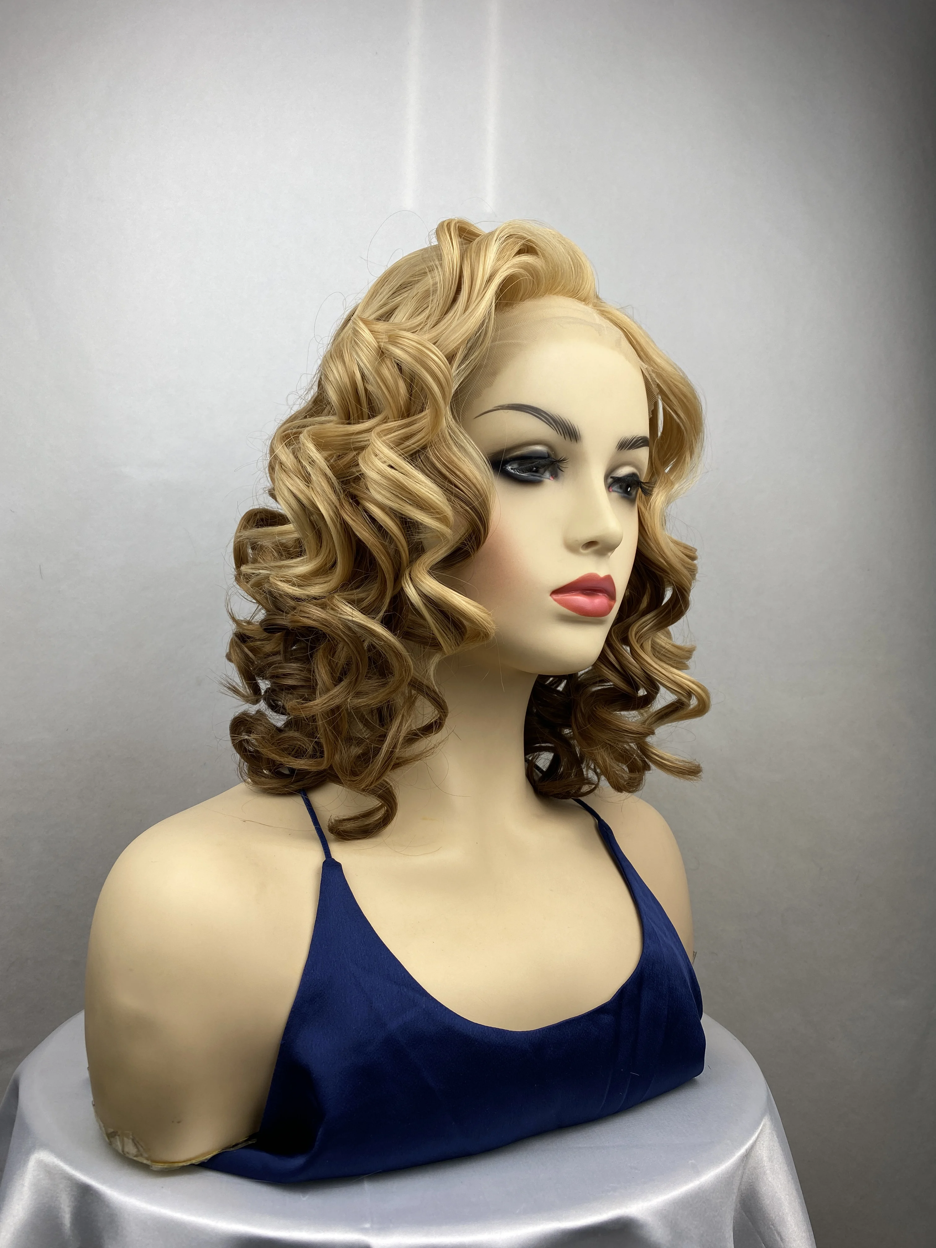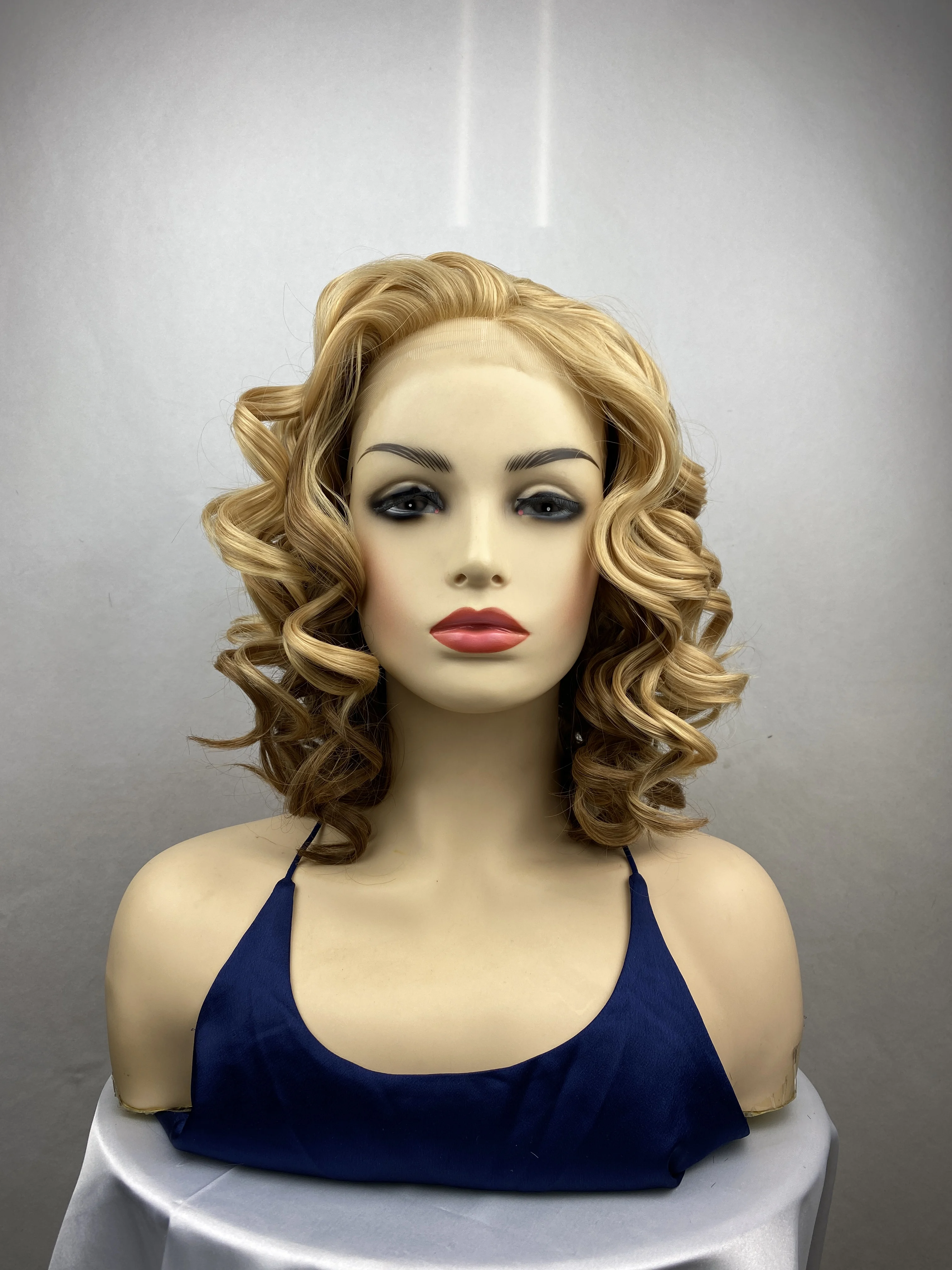 Short Natural Blonde Curly Transparent Lace Synthetic Hair with Bangs Women Wigs