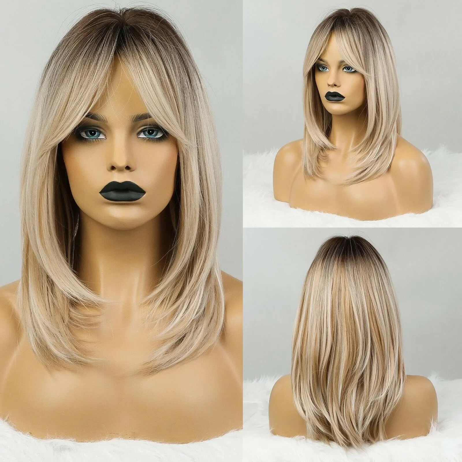Straight Highlight Synthetic Wig Bangs Ombre Brown Blonde Party Daily Women Hair