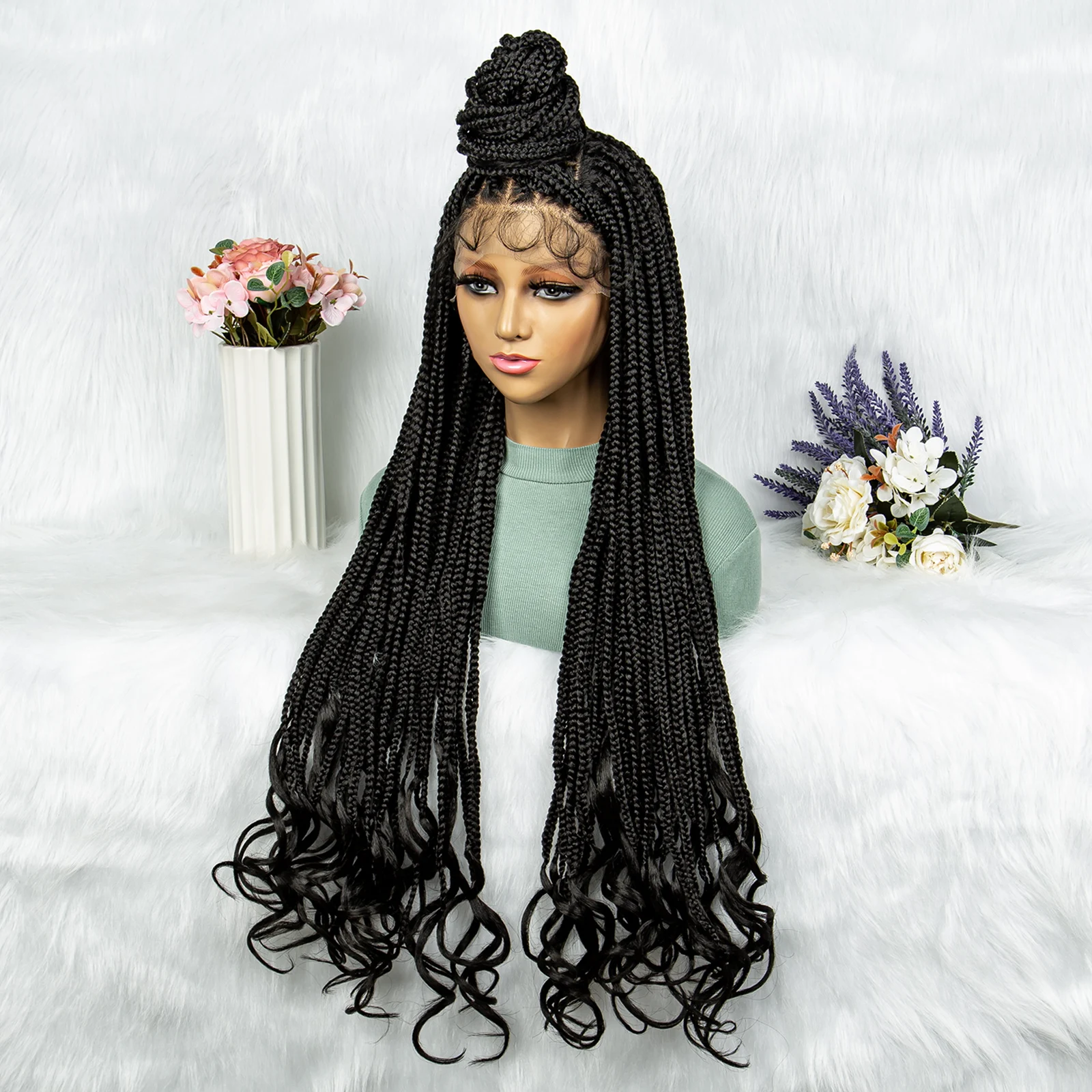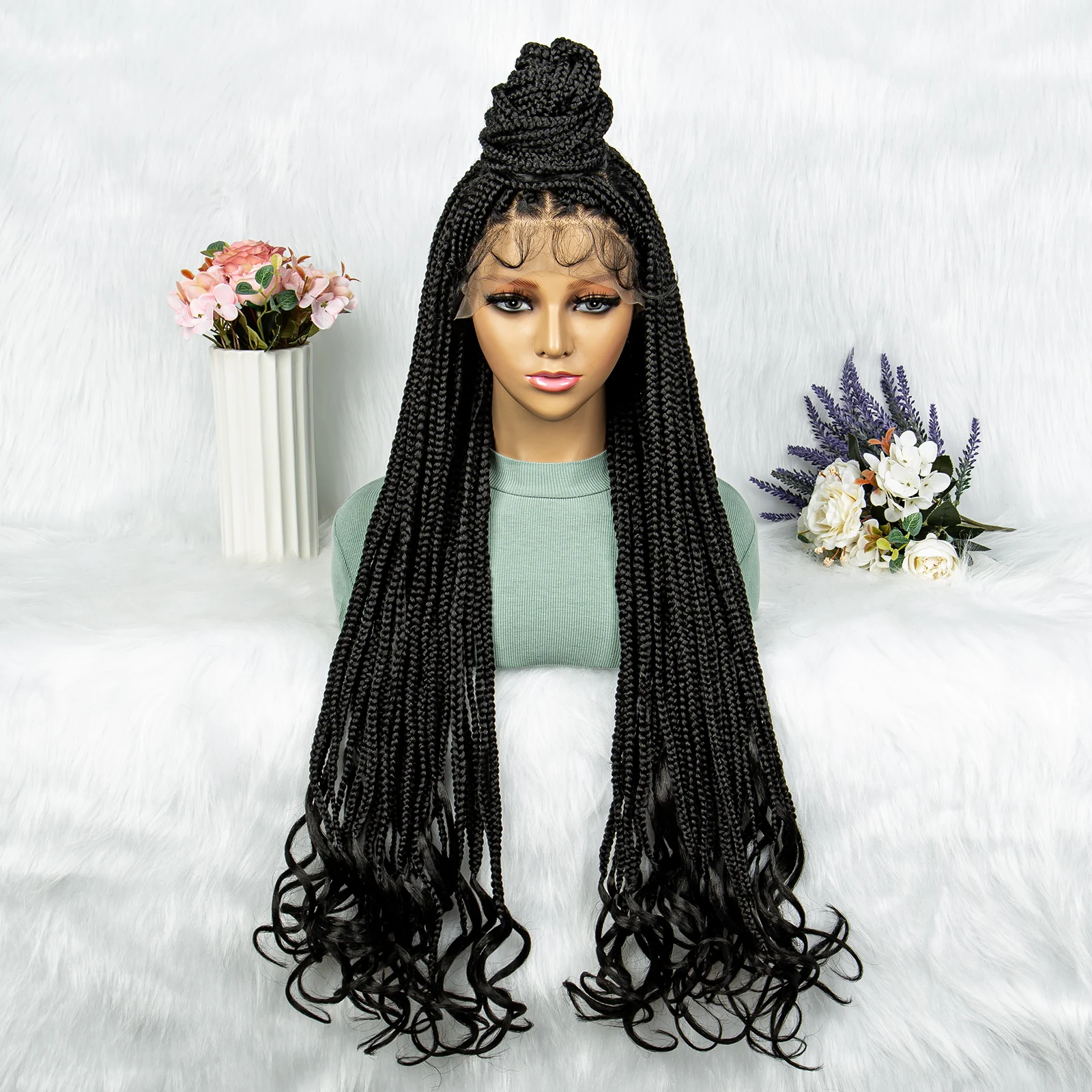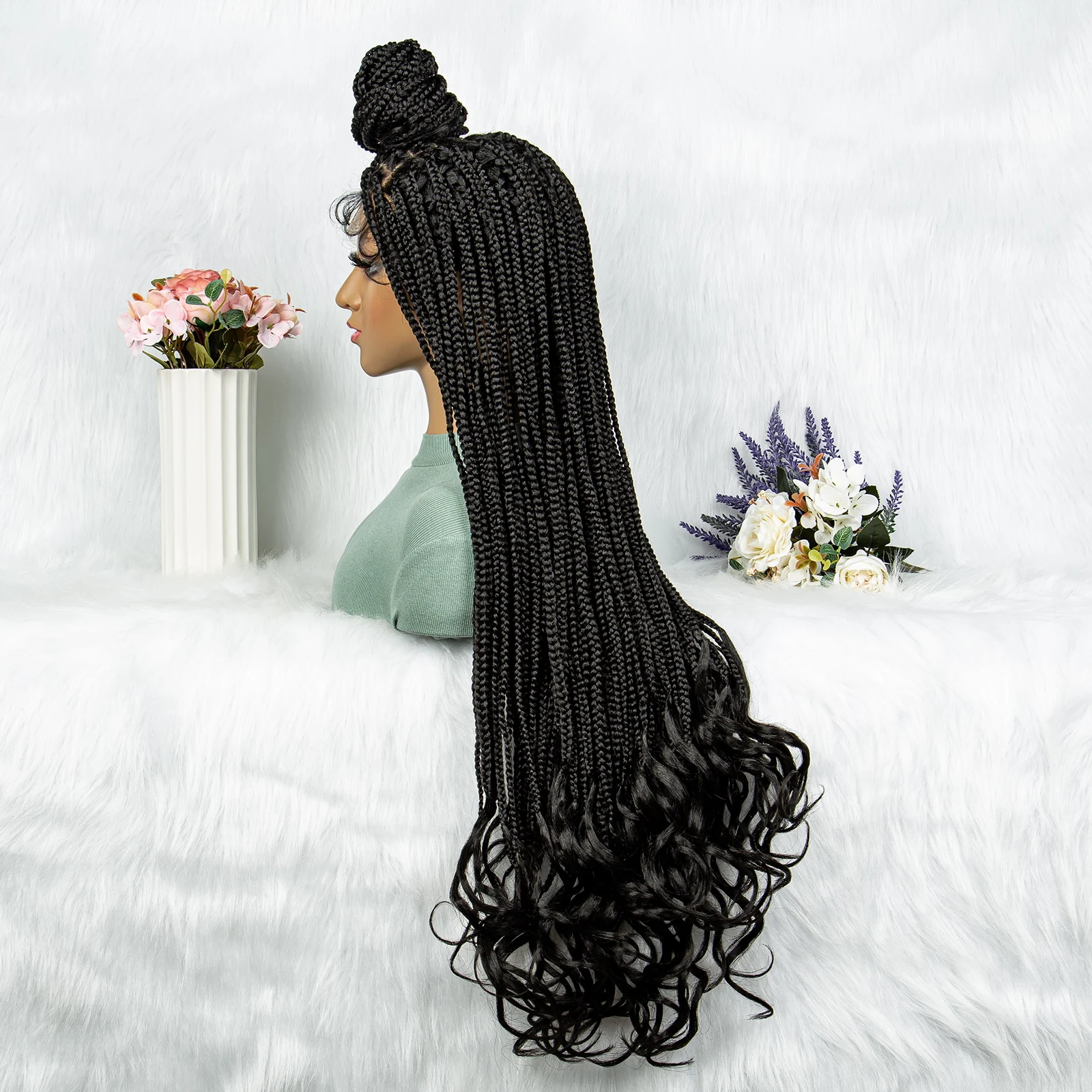 Synthetic Box Braided Wig With Bun Lace Front Long Braiding Hair Wavy Ends Knotless Braids Wig For Black Women