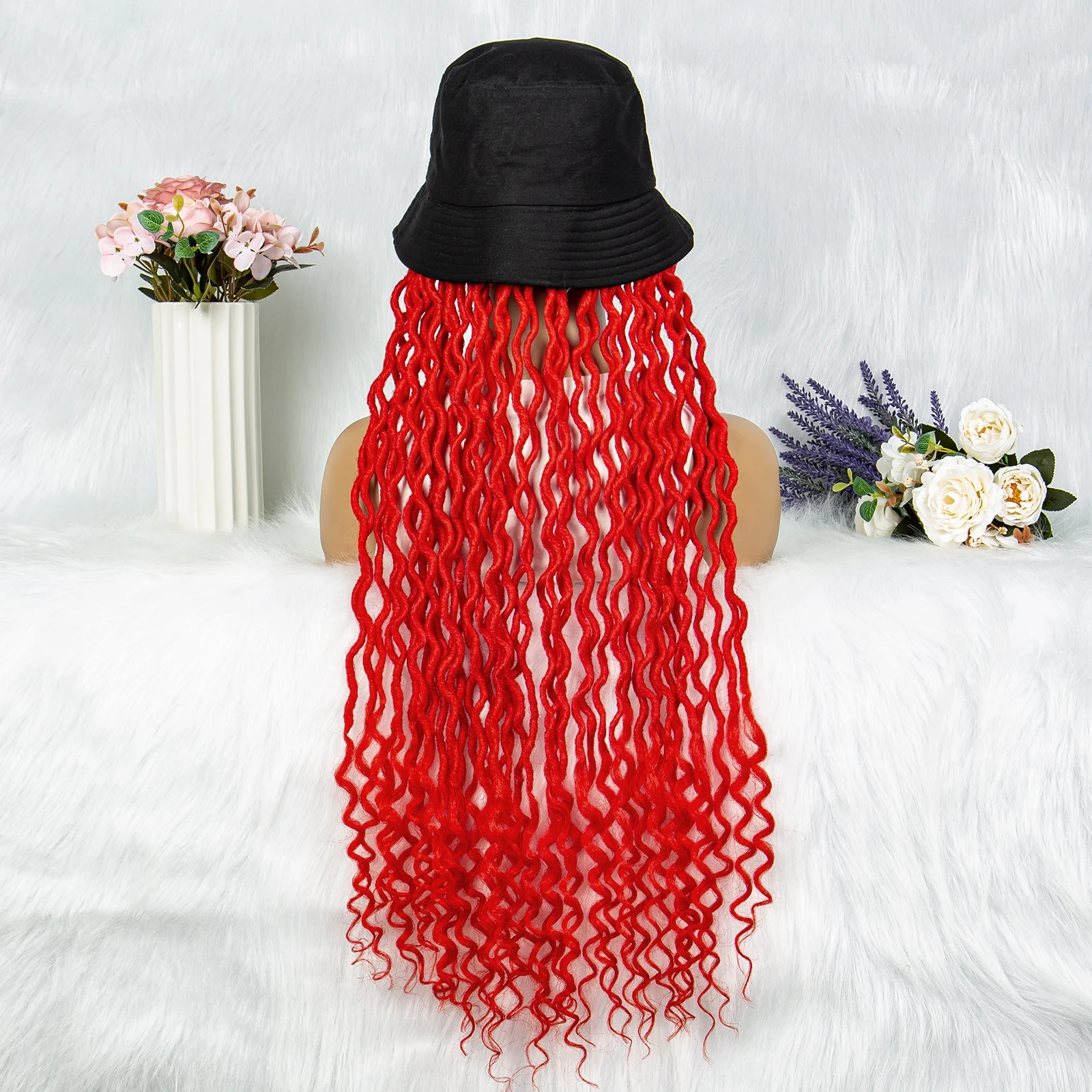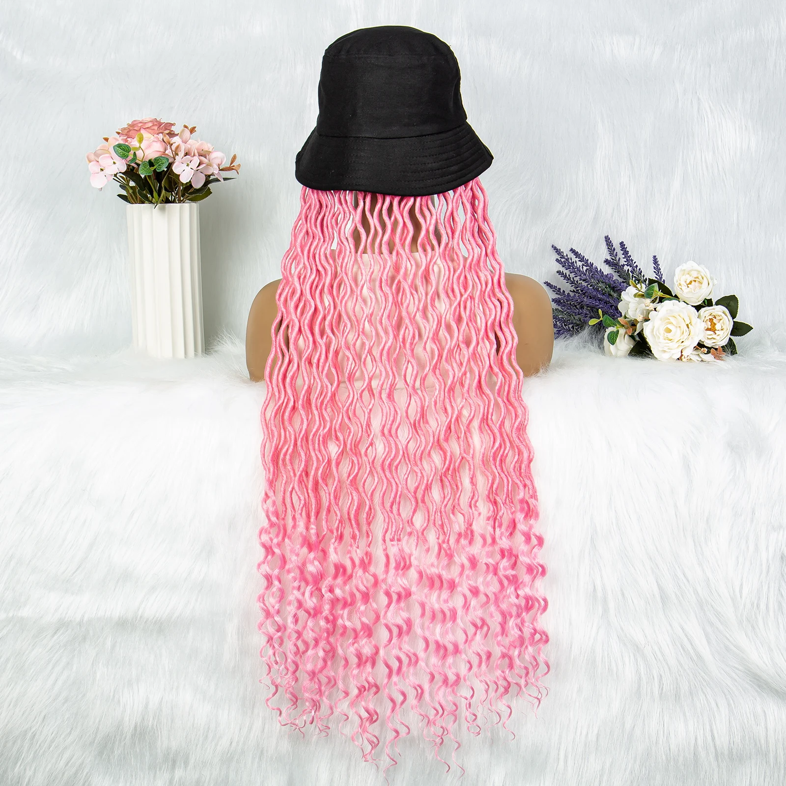 Synthetic Braided Wigs With Bucket Hat 30 Inch Crochet Braid Braiding Hair Machine Made Curly Afro Deradlocks Wig With Hat