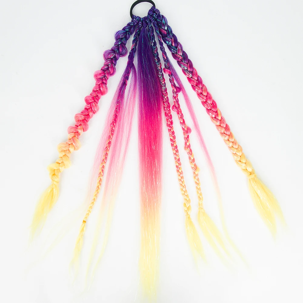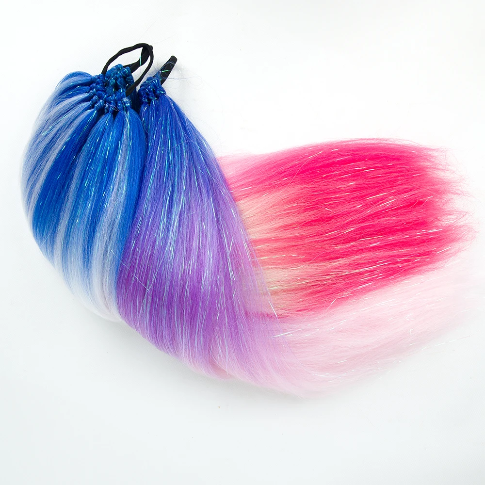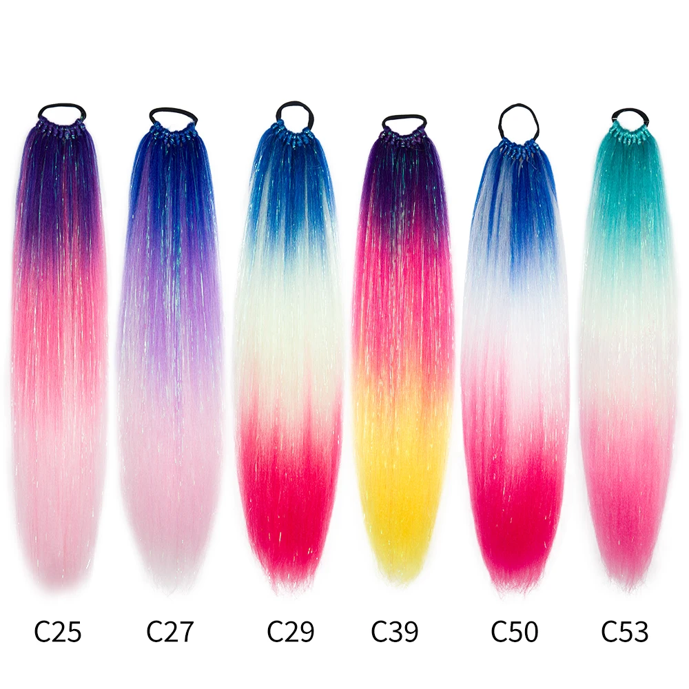 Synthetic Ponytail Hair Piece Mix Tinsel Sparkle Glitter Braiding Hair Extensions 24"Rainbow Color Braids Ponytail With Hair Tie
