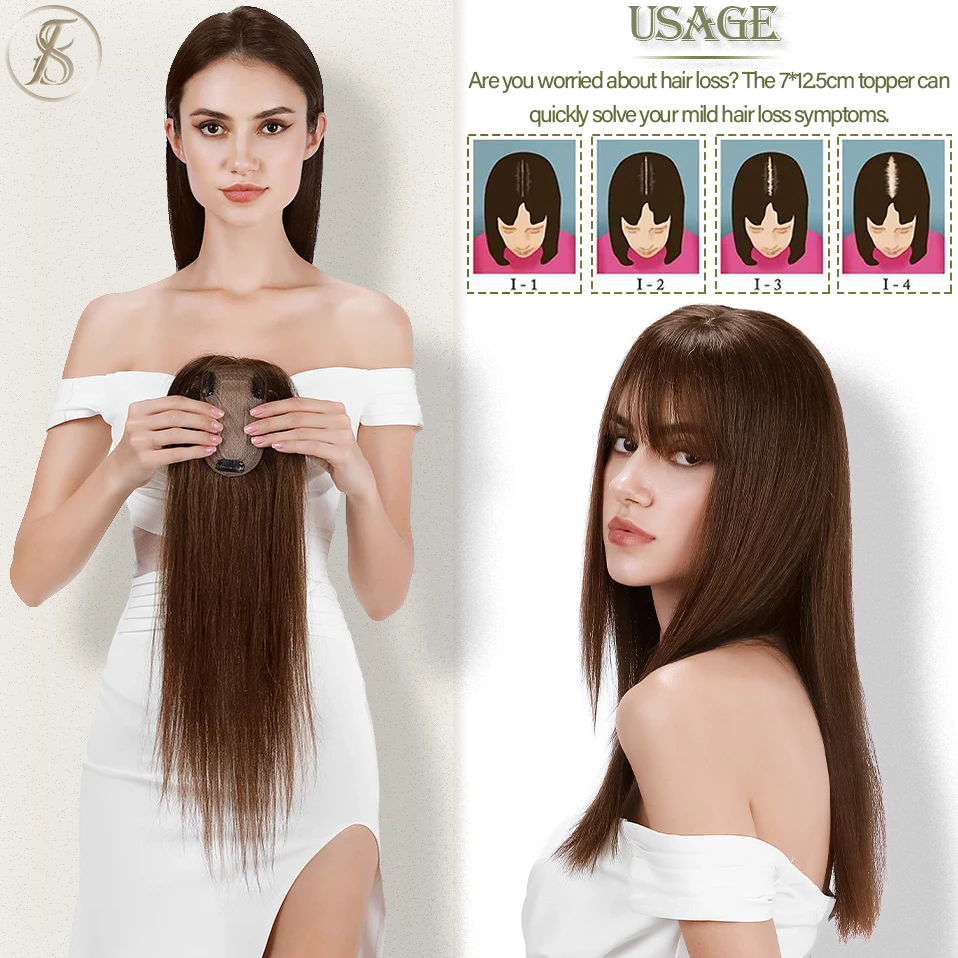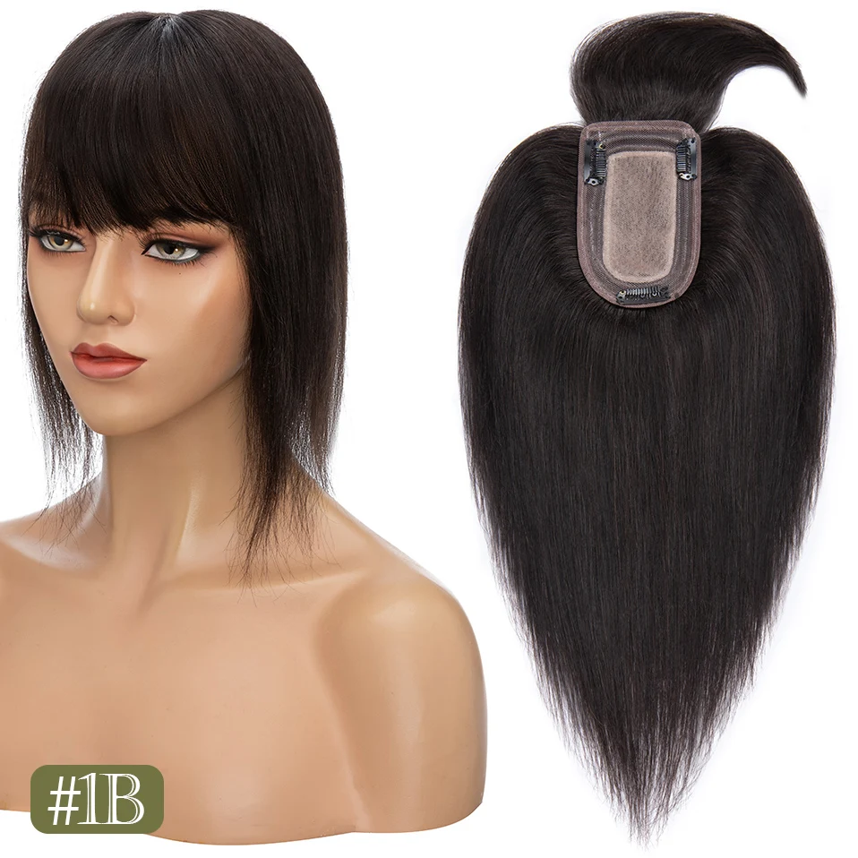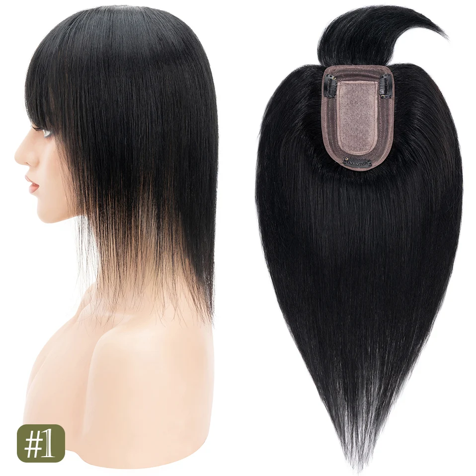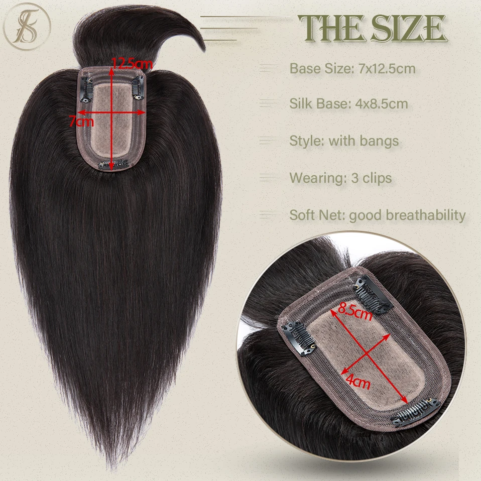TESS Women Topper 7x12.5cm Hair Toppers With Bangs Natural Hair Wig Human Hair Silk Base Center Part Hair Clip In Hair Extension