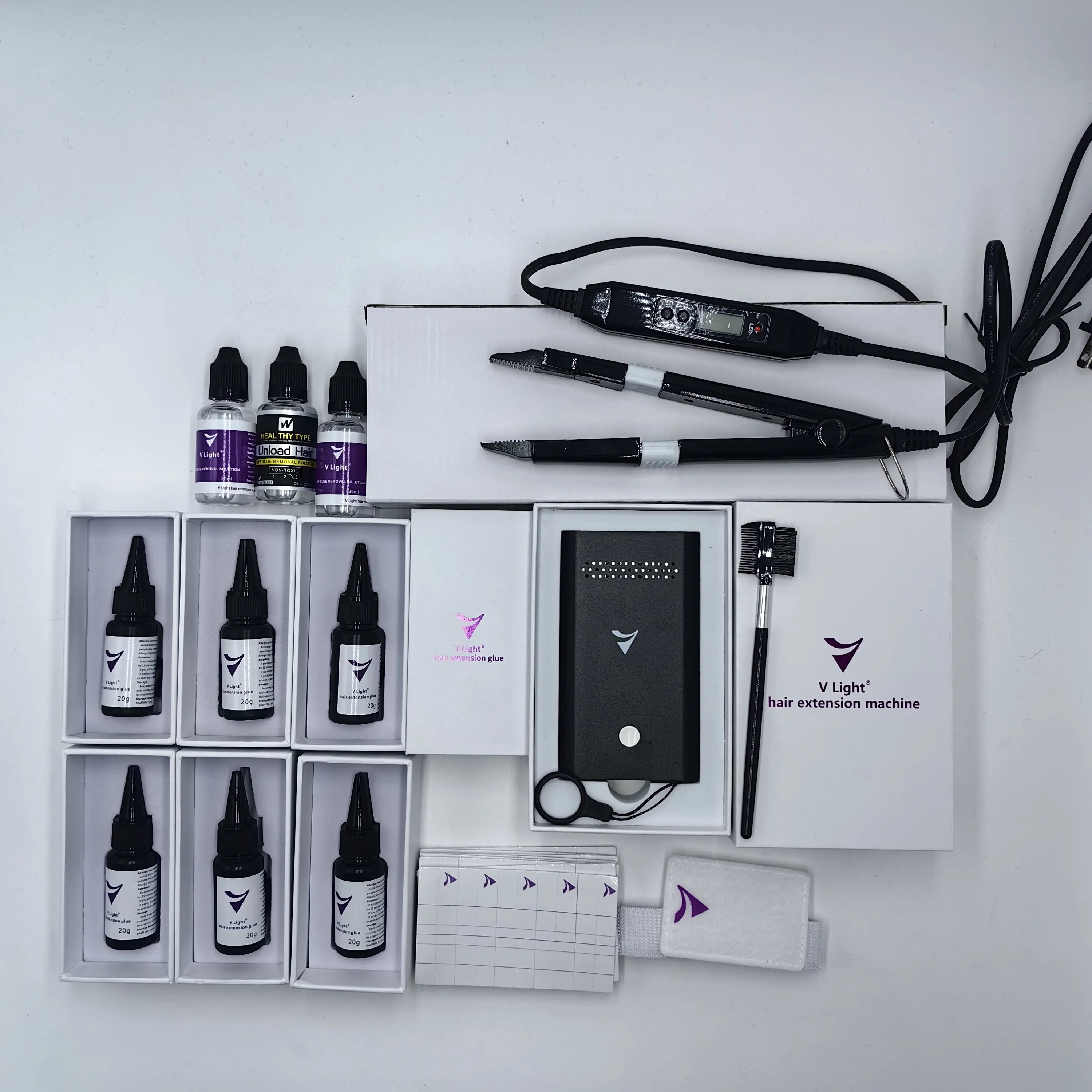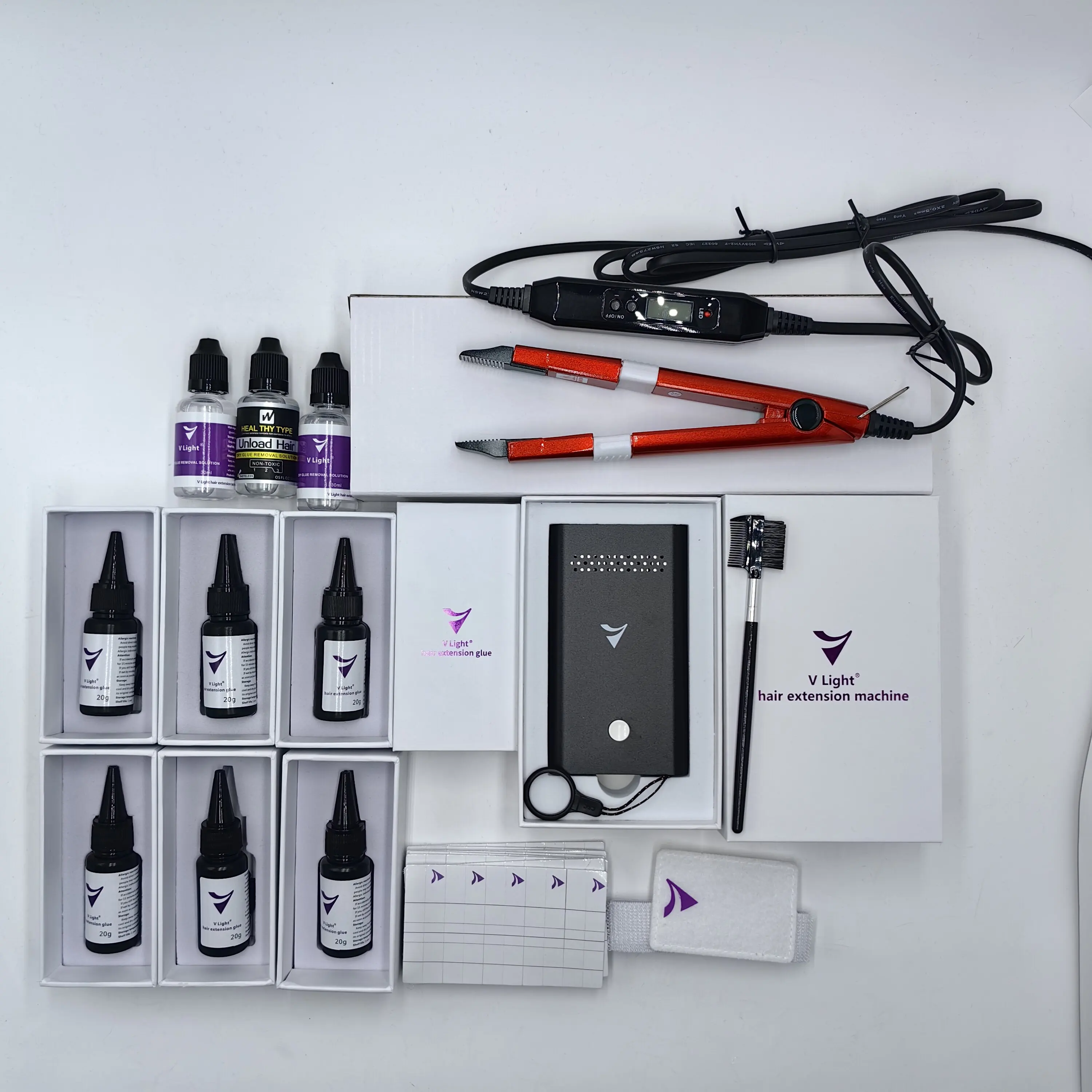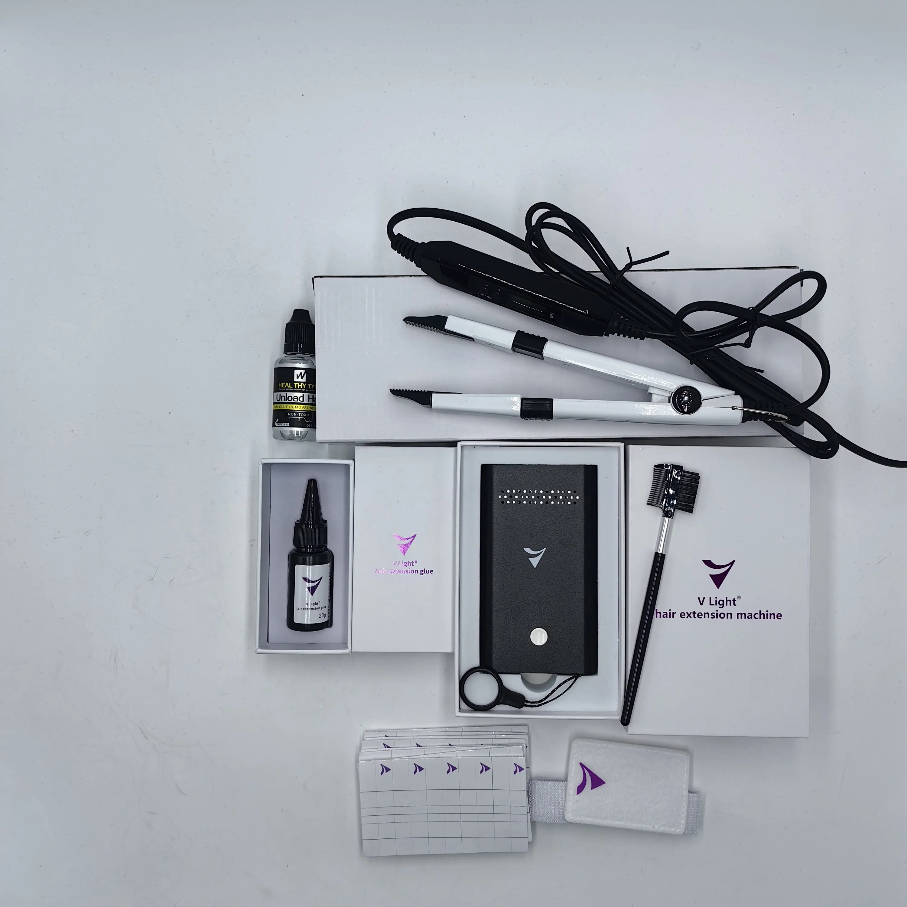 V-Light tools are suitable for V Light dedicated hair extensions and PU hair pieces. If you want to use V-light system to install hair bundle, please ensure the safe operation: before the glue solidifies, do not drop glue on the scalp or directly contact the skin to avoid allergies or the burn caused by the light.