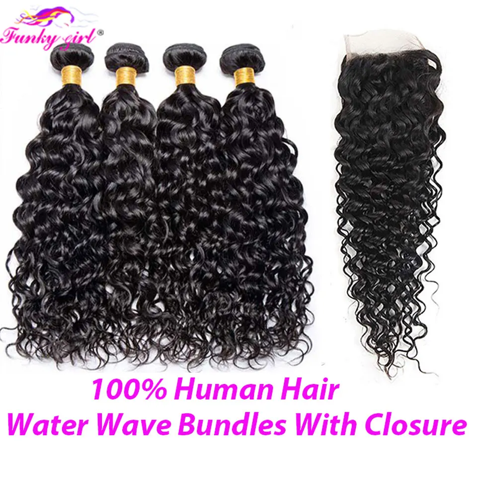 Water Wave Bundles With Closure Brazilian Remy Human Hair Bundles With 4x4 Lace Frontal Closure Curly Wave Human Hair Extensions